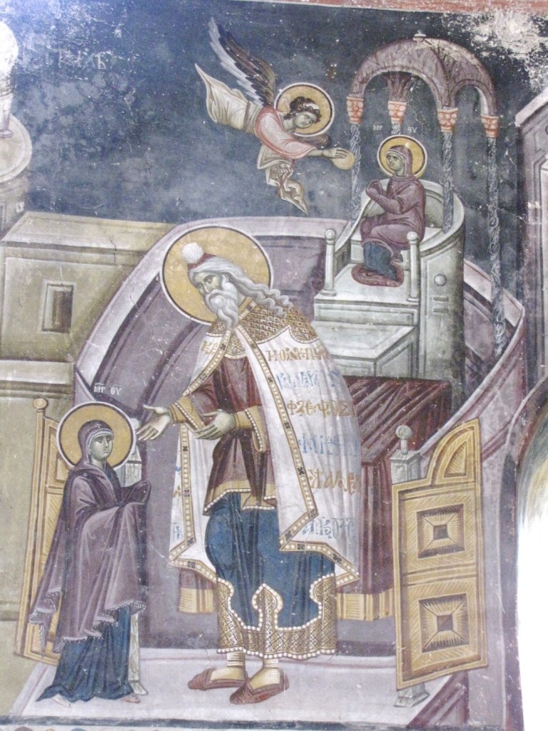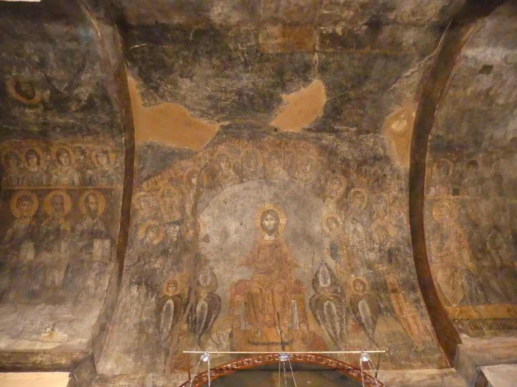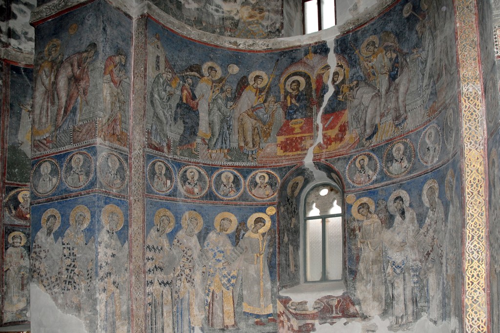 Wystrój malarski kościoła, pochodzący głównie z okresu jego budowy, a częściowo również z XIV w,, zachował się tylko fragmentarycznie. W najlepszym stanie przetrwał piękny fresk w narteksie, z pierwszej połowy XI w., przedstawiający Sąd Ostateczny, niemal monochromatyczny, w ciepłych kolorach ciemnej ochry, z postacią tronującego Chrystusa, na jaśniejszej i zimniejszej kolistej aureoli.