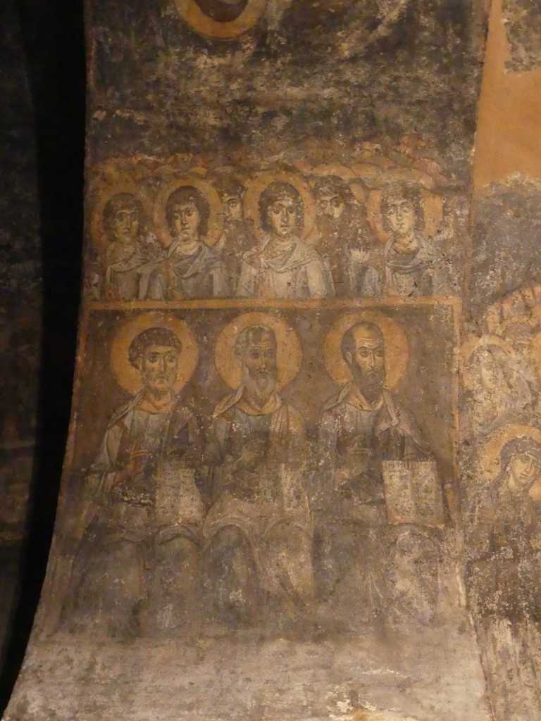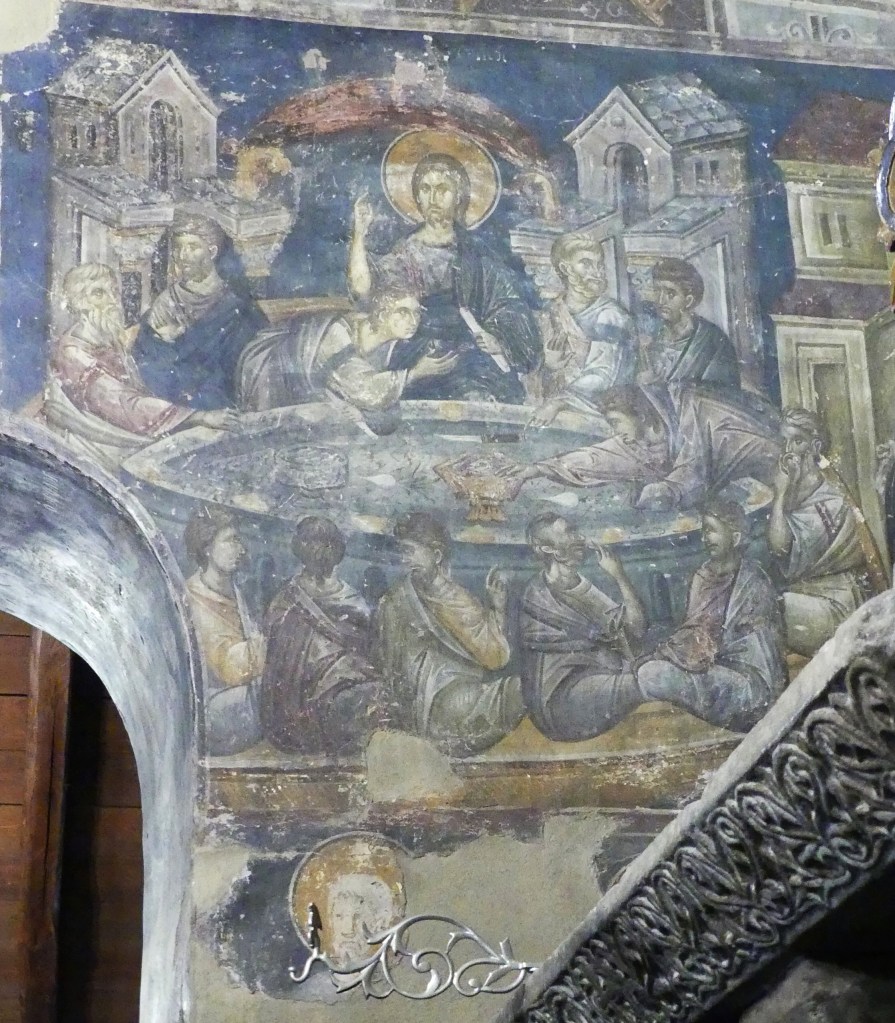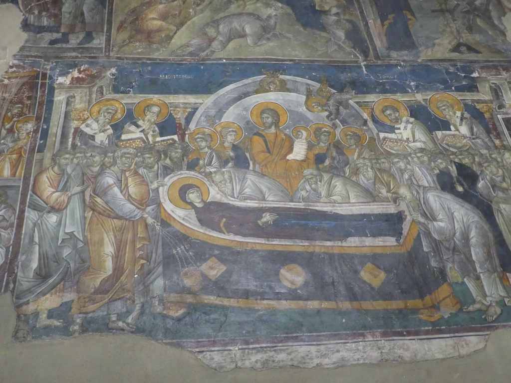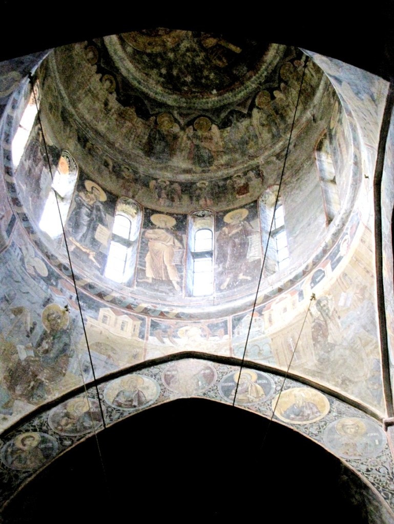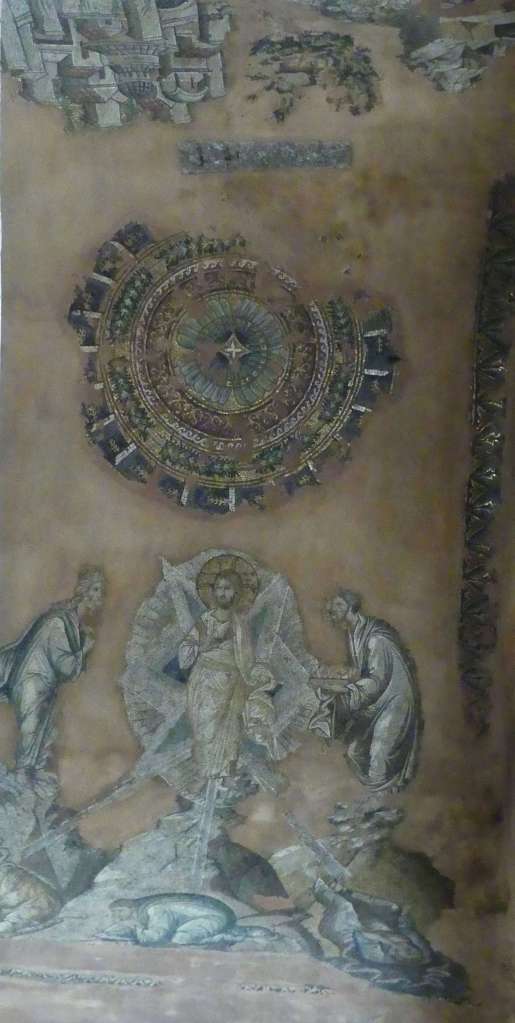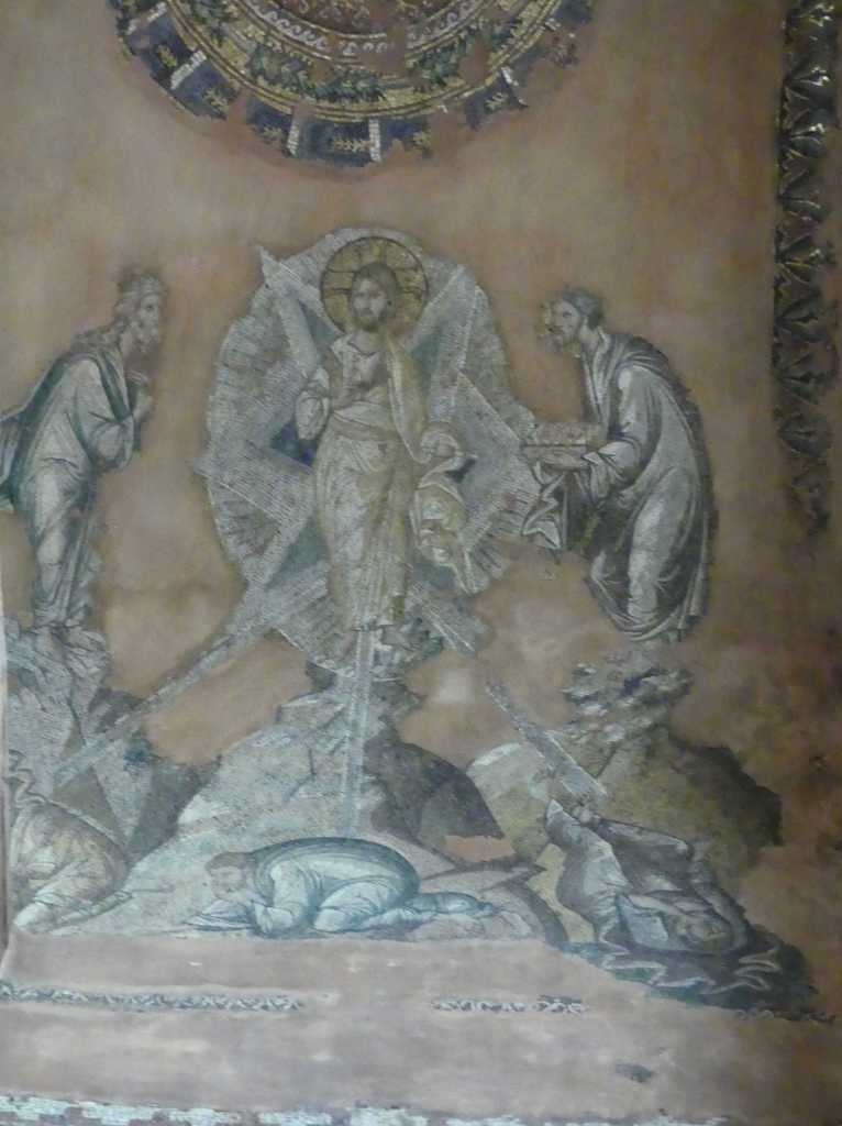 Wizerunek Chrystusa Pantokratora w centralnej nawie uległ całkowitemu zniszczeniu, lecz dobrze zachowały się postacie dziesięciu proroków starotestamentowych, rozmieszczone wokoło, oraz czterech ewangelistów, na żaglach kopuły. Sklepienia wokół naosu ozdobione były mozaikami narracyjnymi ilustrującymi epizody Ewangelii, upamiętniane w Dodekaortonie (dwunastu głównych świętach Kościoła Prawosławnego). Zachowało się z nich dziewięć, na ogół silnie zniszczonych, natomiast scena Przeistoczenia przetrwała w stanie niemal idealnym.