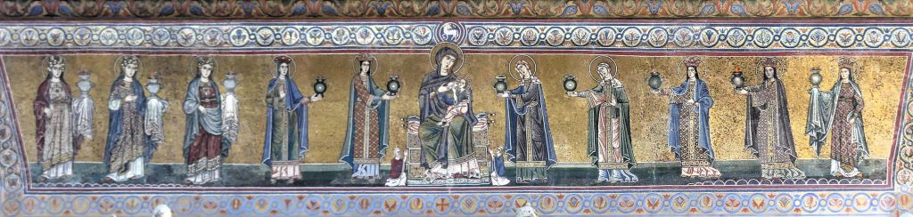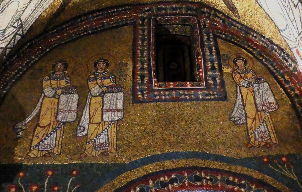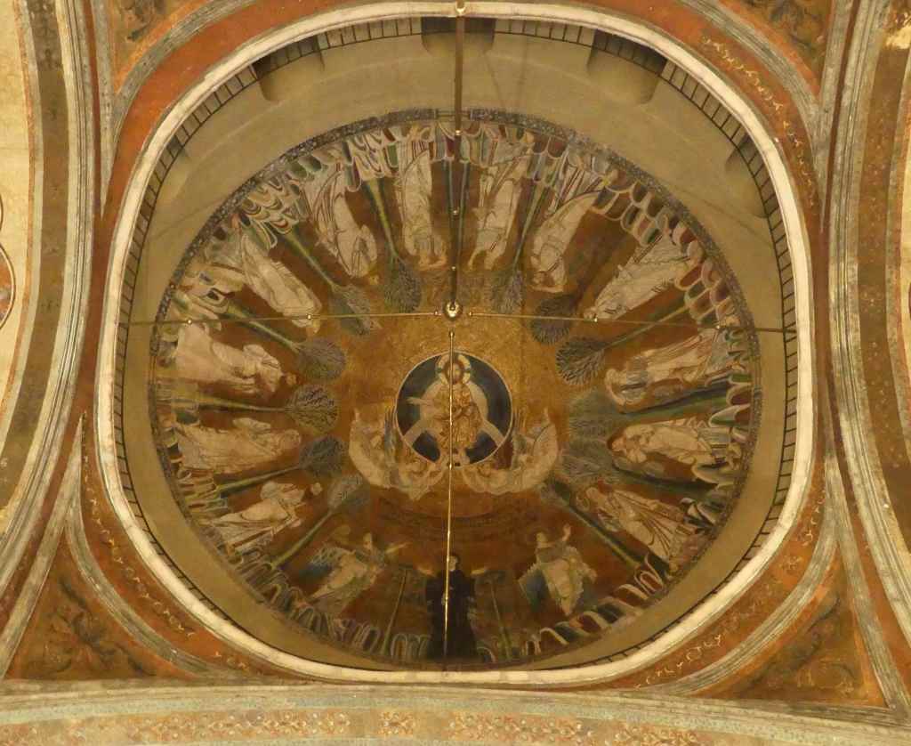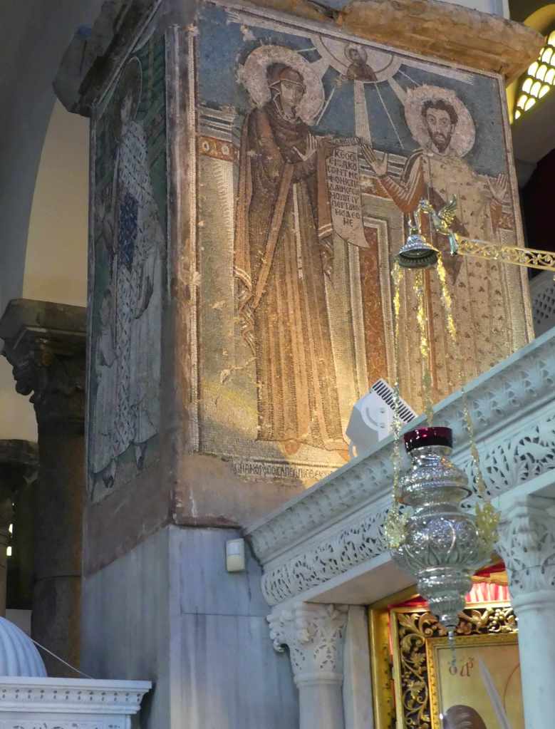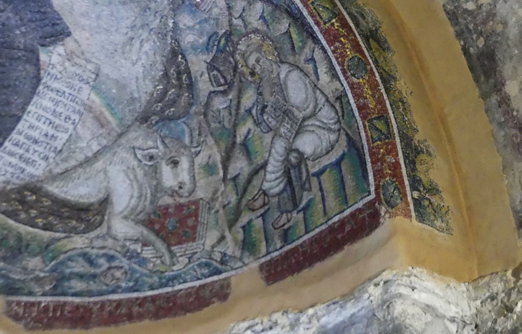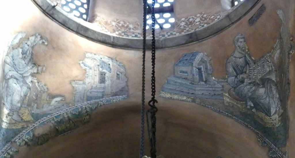 Mozaiki z absydy i wnętrza kopuły pochodzą już z dziewiątego wieku. Ta pierwsza przedstawia Bożą Rodzicielkę z Dzieciątkiem (Θεοτόκος) na złotym tle. Natomiast na drugiej wyobrażona jest scena Wniebowstąpienia, z błogosławiącym Chrystusem na szczycie kopuły, w niebieskiej aureoli, podtrzymywanej przez dwa anioły, oraz z Maryją i dwunastoma apostołami, na obrzeżu. Apostołowie wyobrażeni są w rozmaitych pozach i ze zróżnicowanymi fizjonomiami, poprzedzielani między sobą drzewkami.