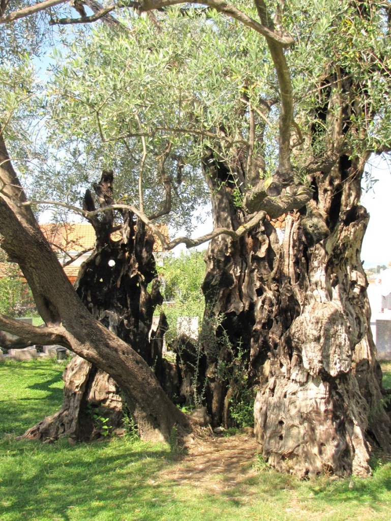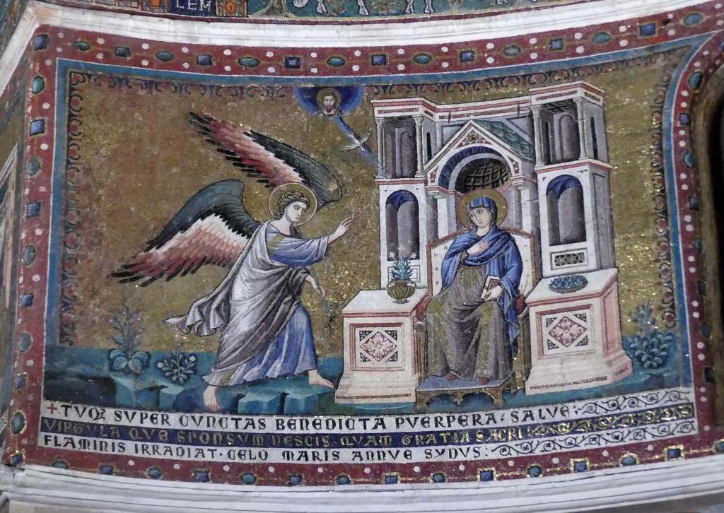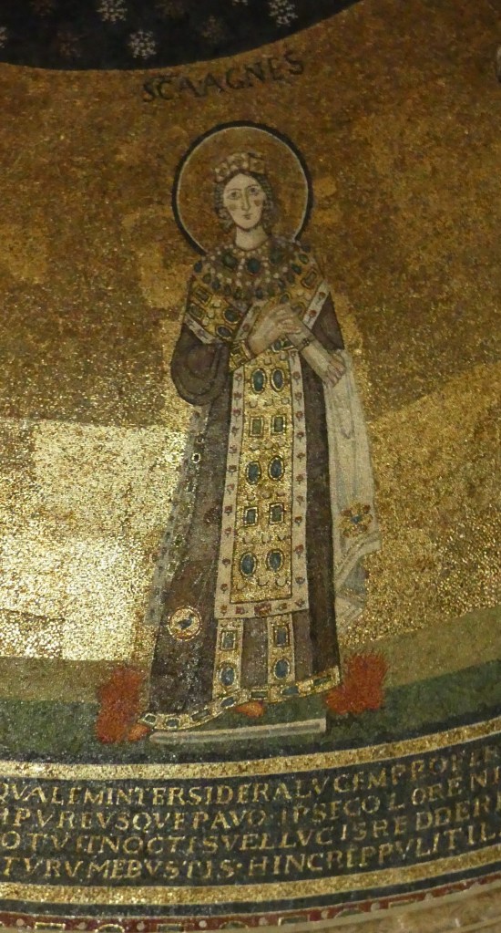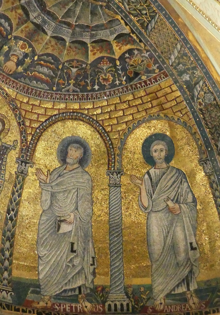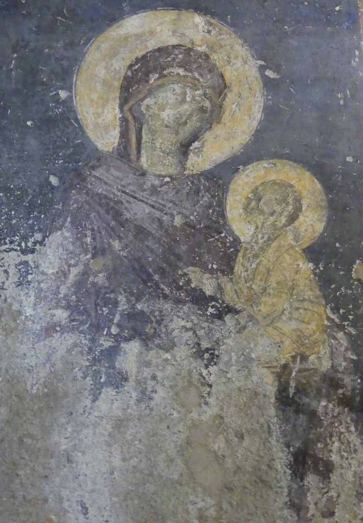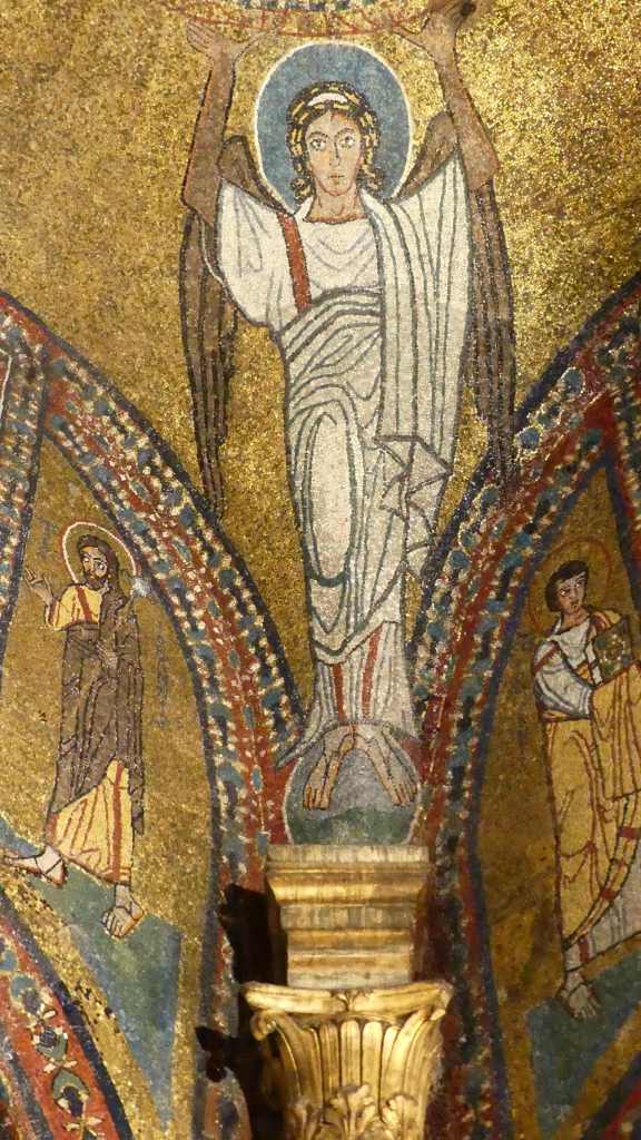 Mozaiki z absydy i wnętrza kopuły pochodzą już z dziewiątego wieku. Ta pierwsza przedstawia Bożą Rodzicielkę z Dzieciątkiem (Θεοτόκος) na złotym tle. Natomiast na drugiej wyobrażona jest scena Wniebowstąpienia, z błogosławiącym Chrystusem na szczycie kopuły, w niebieskiej aureoli, podtrzymywanej przez dwa anioły, oraz z Maryją i dwunastoma apostołami, na obrzeżu. Apostołowie wyobrażeni są w rozmaitych pozach i ze zróżnicowanymi fizjonomiami, poprzedzielani między sobą drzewkami.