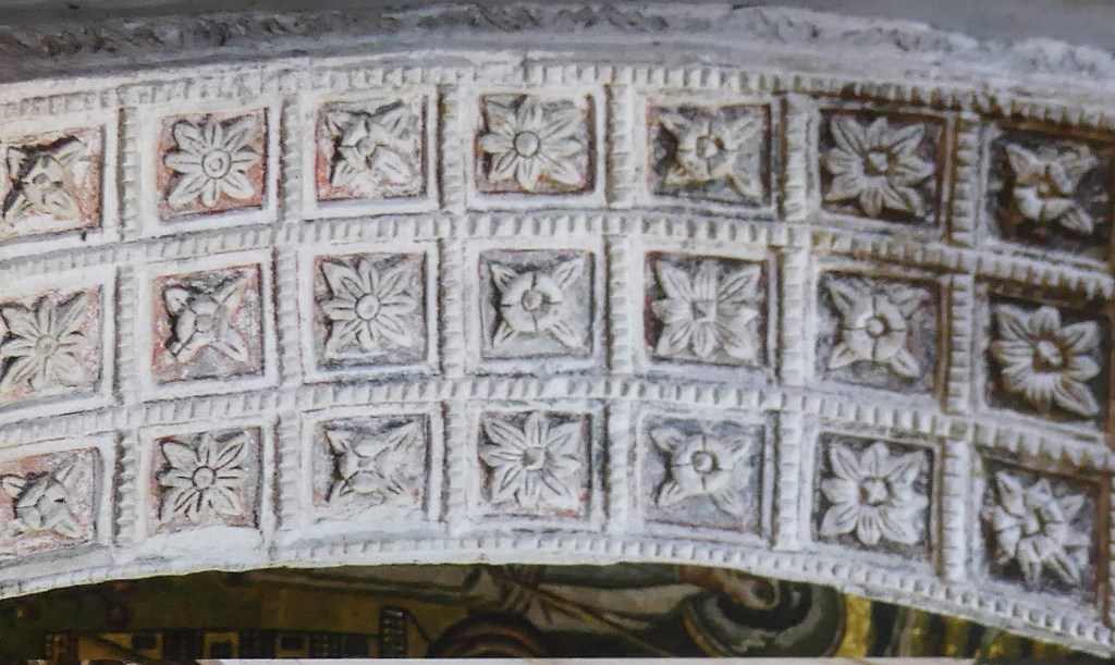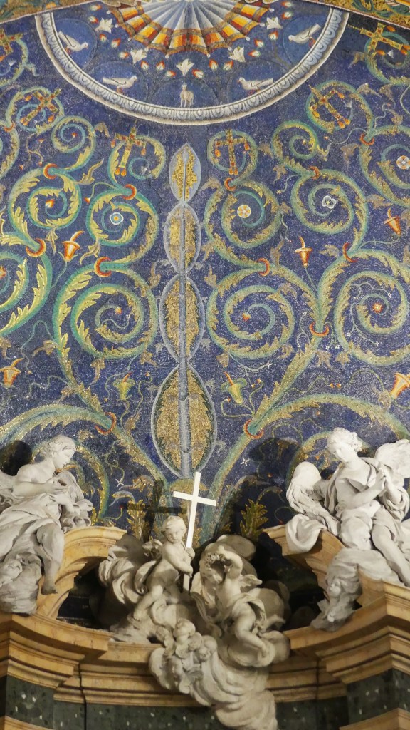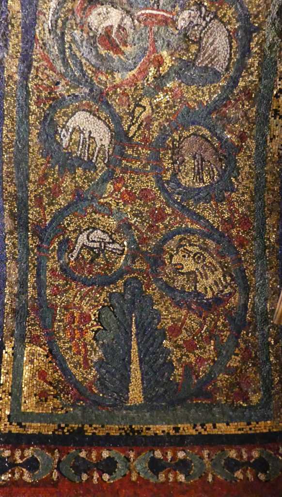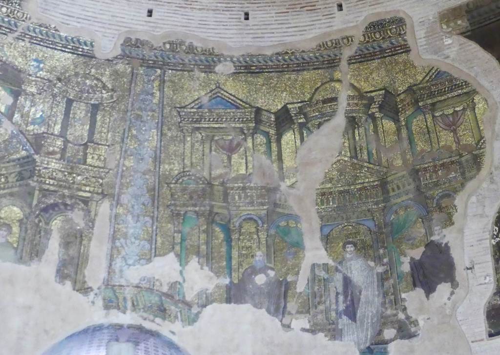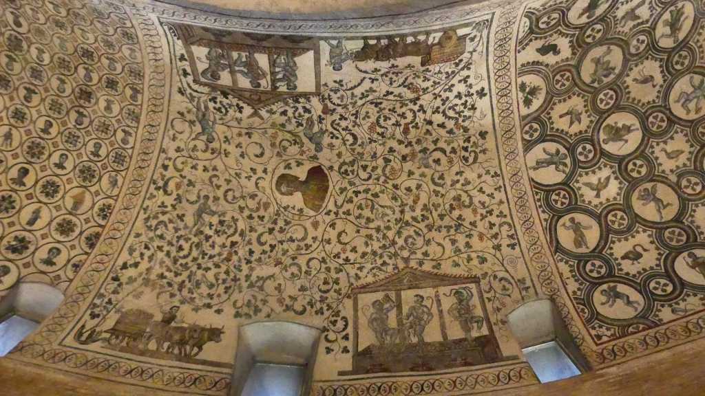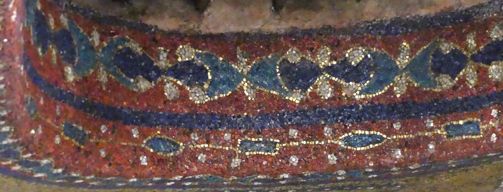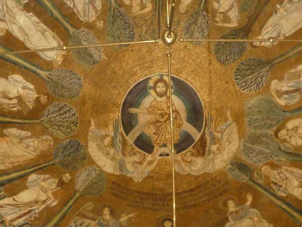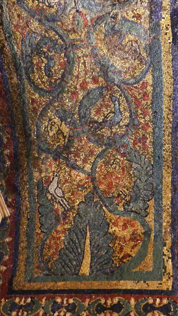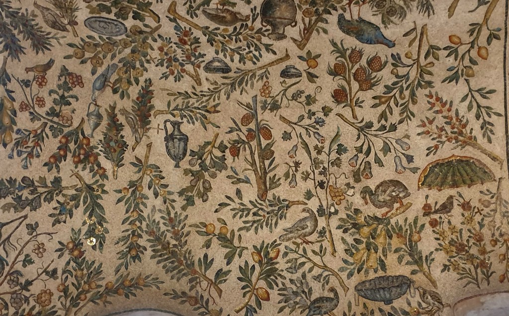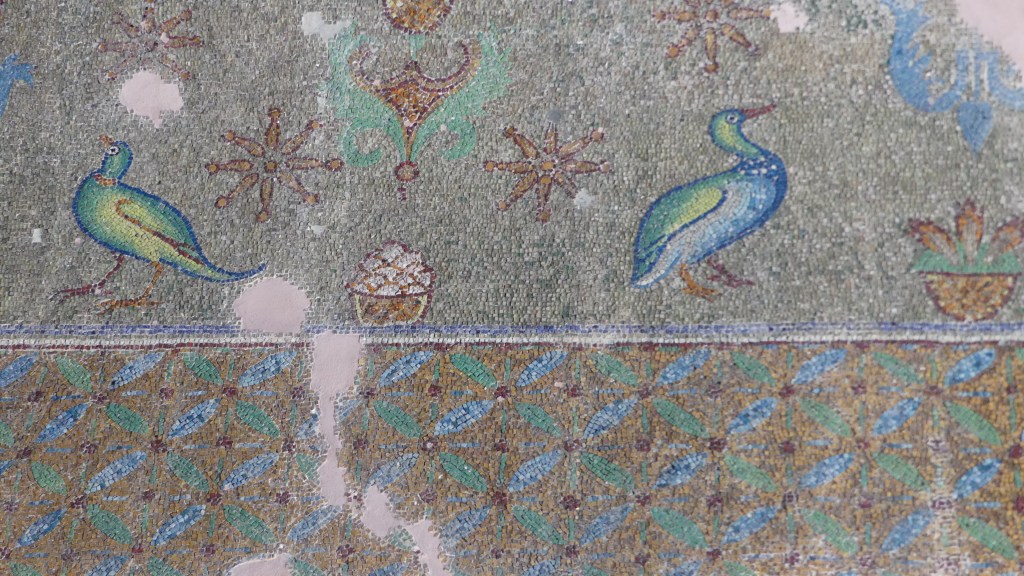 Mozaiki na sklepieniach przejść mają zupełnie inny charakter; przedstawiają wzory geometryczne oraz ptaki różnych gatunków, a ich zestawy kolorystyczne są dla mnie wręcz nieprzyjemne, nie wytrzymują porównania z ptakami na sklepieniu w pałacu arcybiskupim w Rawennie.