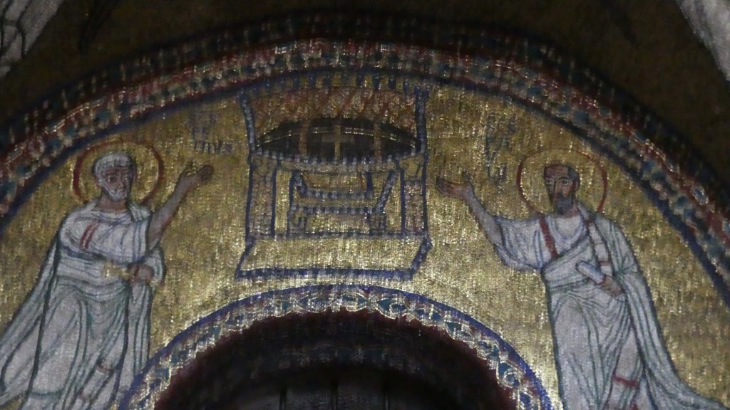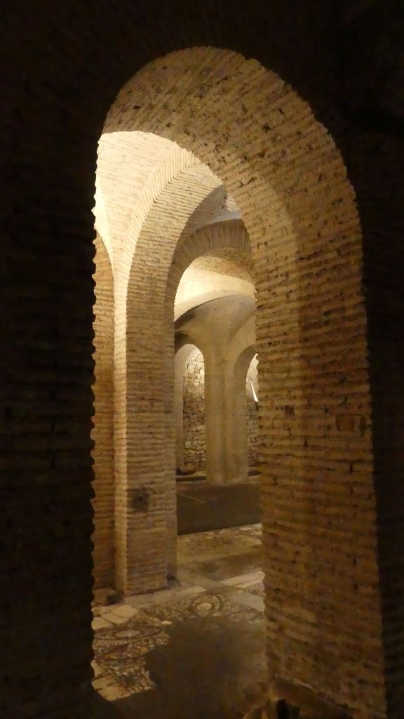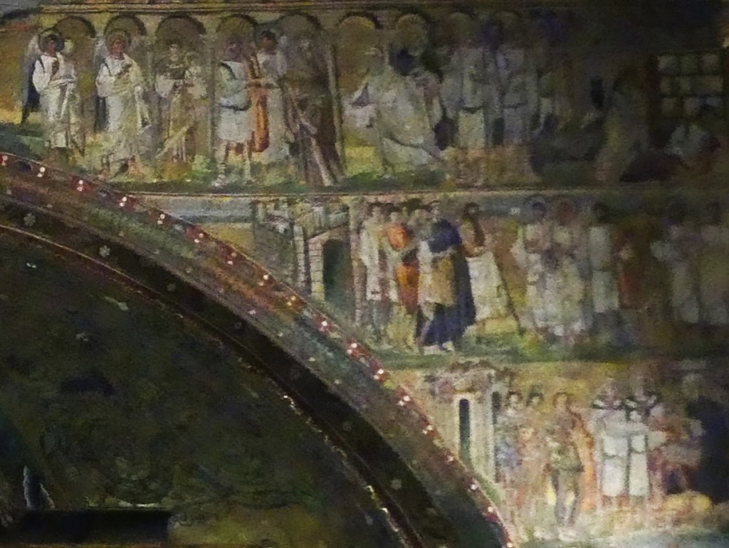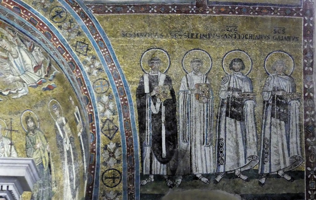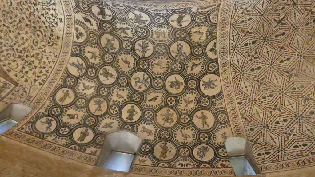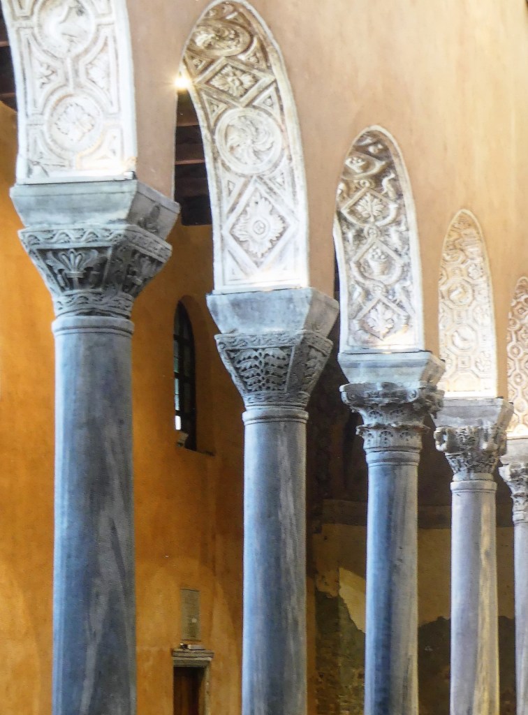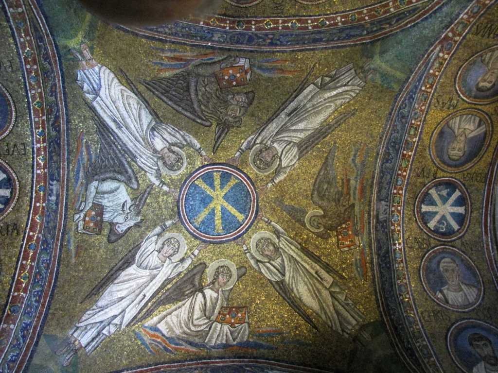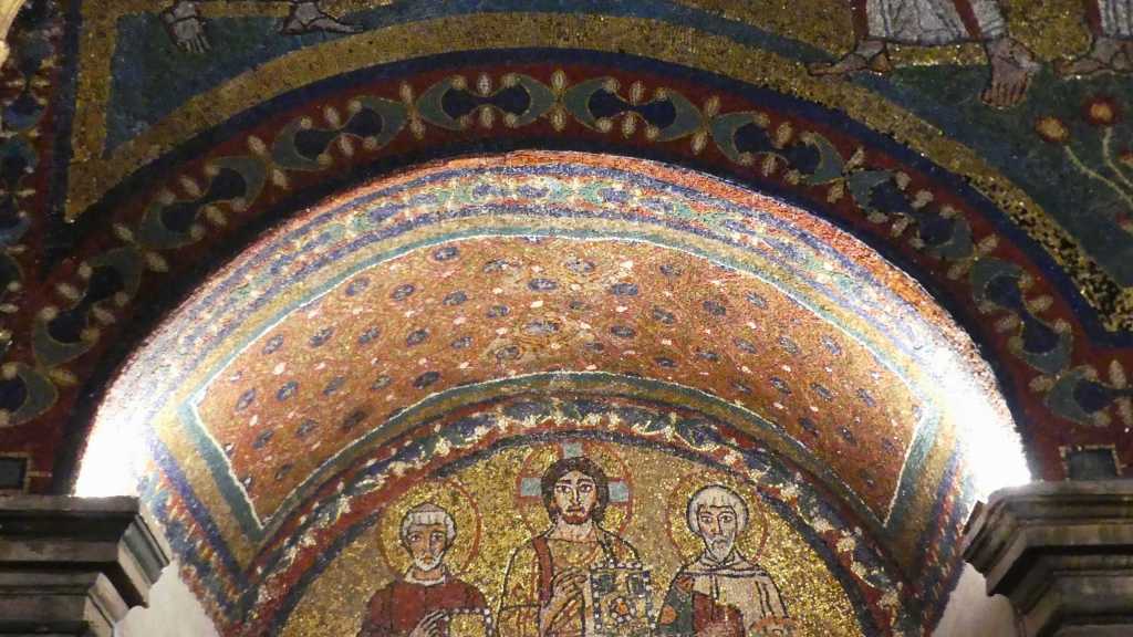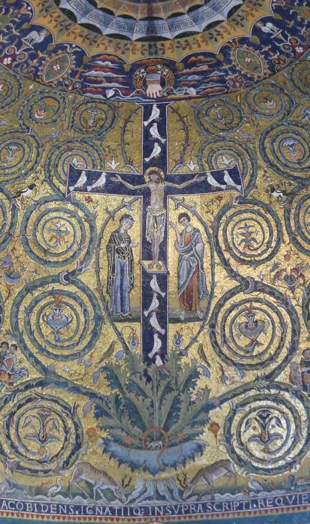 Mozaiki na sklepieniach przejść mają zupełnie inny charakter; przedstawiają wzory geometryczne oraz ptaki różnych gatunków, a ich zestawy kolorystyczne są dla mnie wręcz nieprzyjemne, nie wytrzymują porównania z ptakami na sklepieniu w pałacu arcybiskupim w Rawennie.