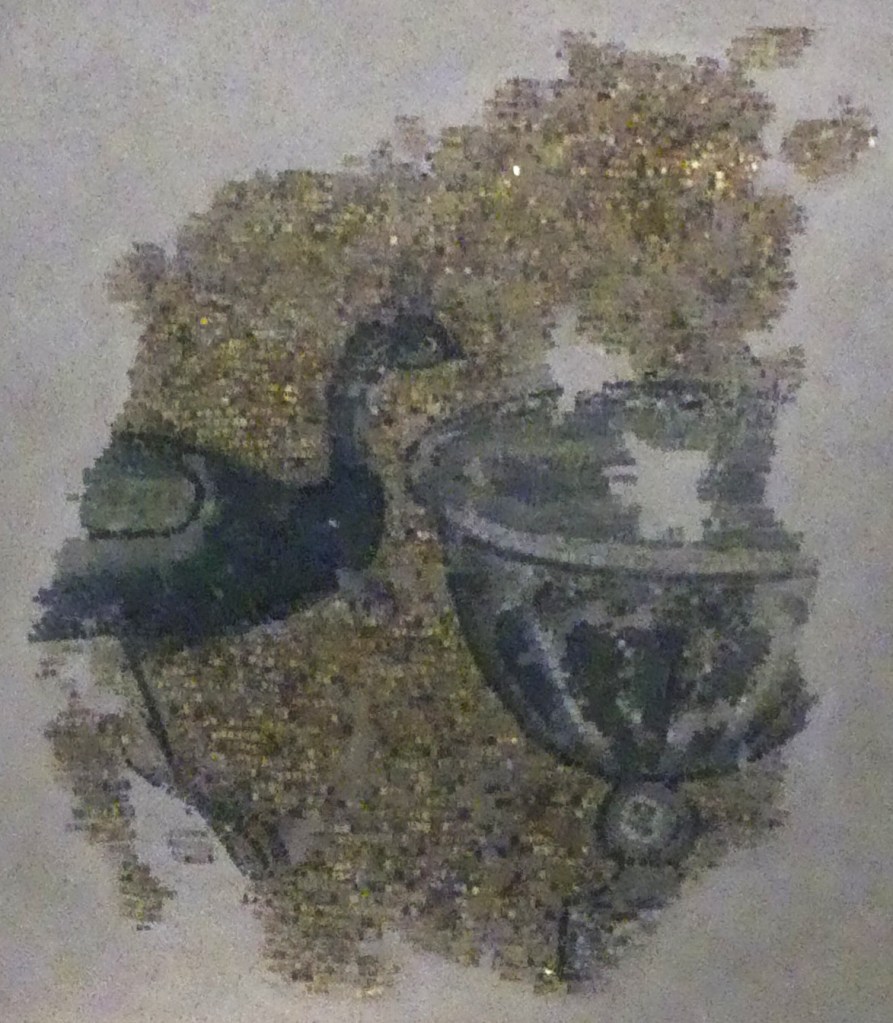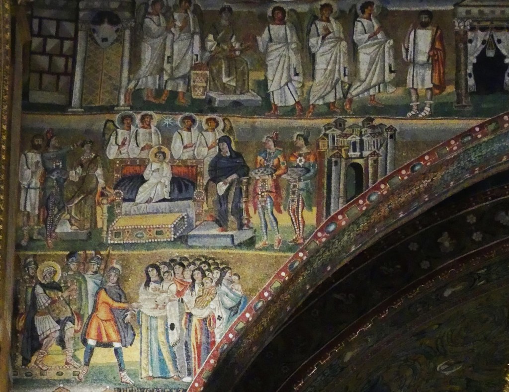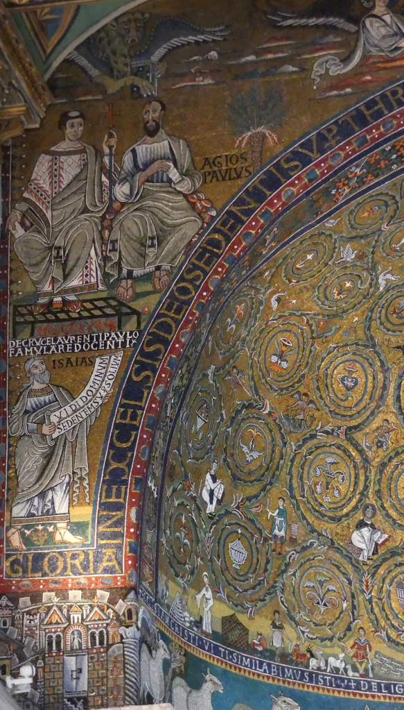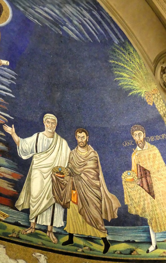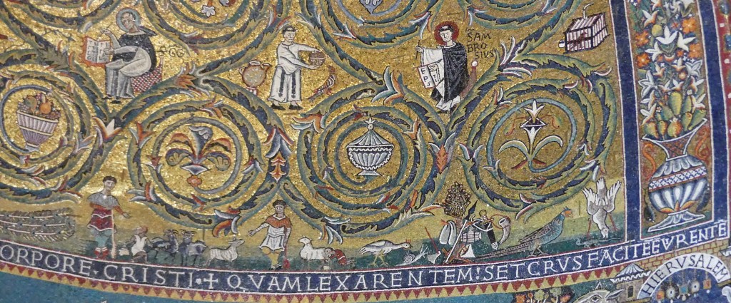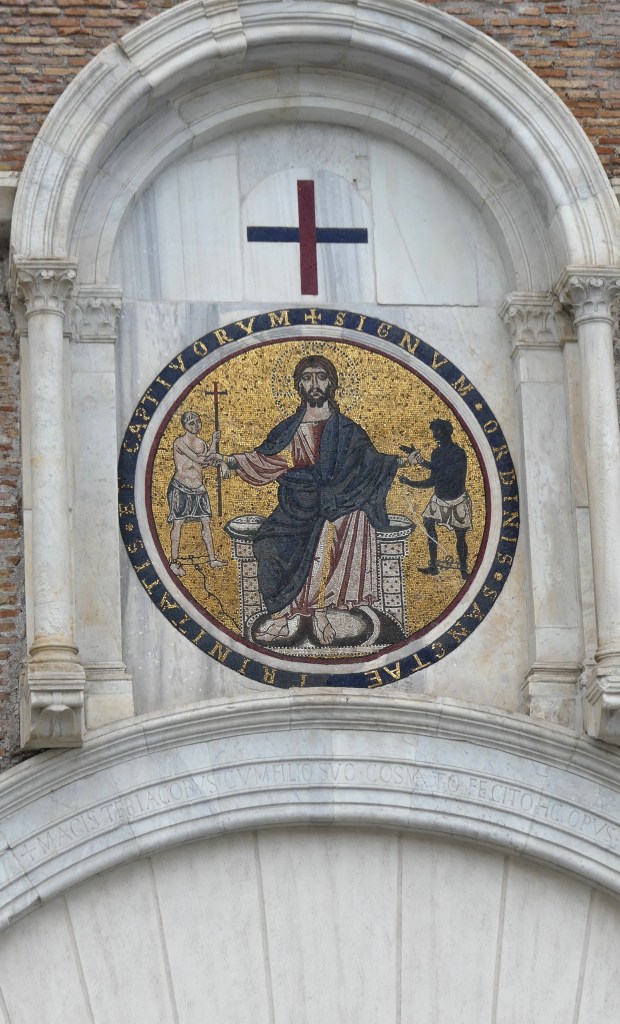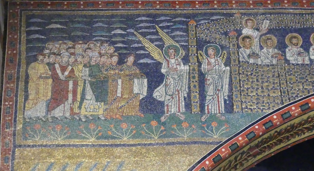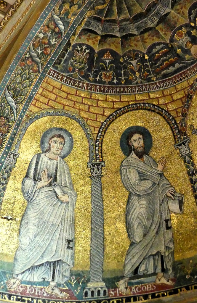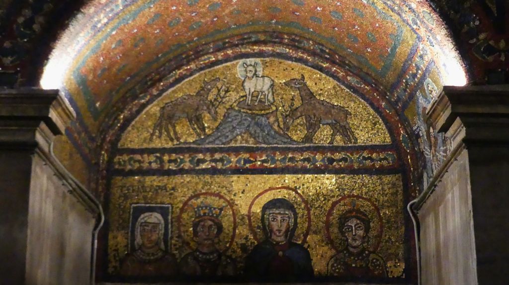 Mozaiki na sklepieniach przejść mają zupełnie inny charakter; przedstawiają wzory geometryczne oraz ptaki różnych gatunków, a ich zestawy kolorystyczne są dla mnie wręcz nieprzyjemne, nie wytrzymują porównania z ptakami na sklepieniu w pałacu arcybiskupim w Rawennie.