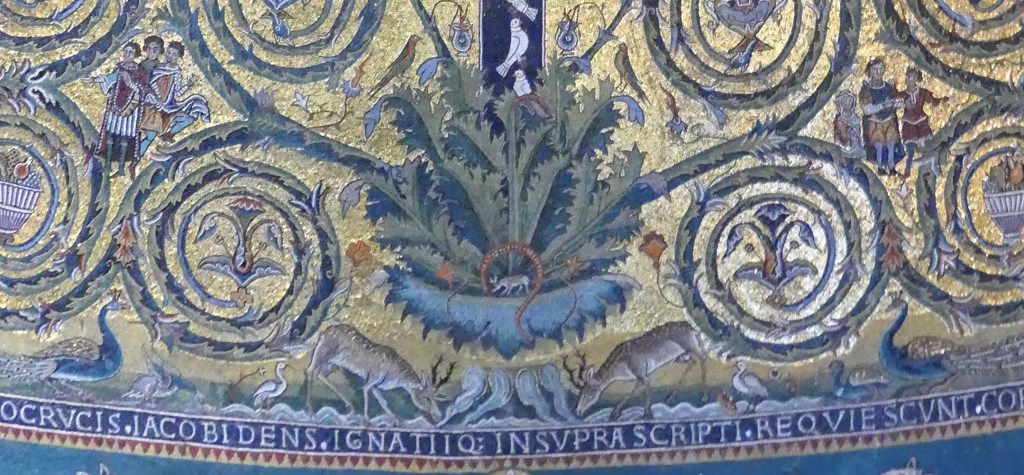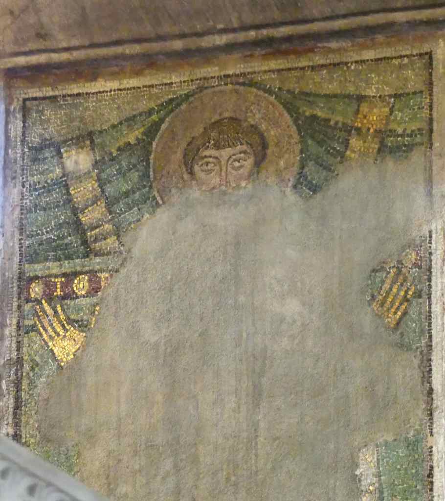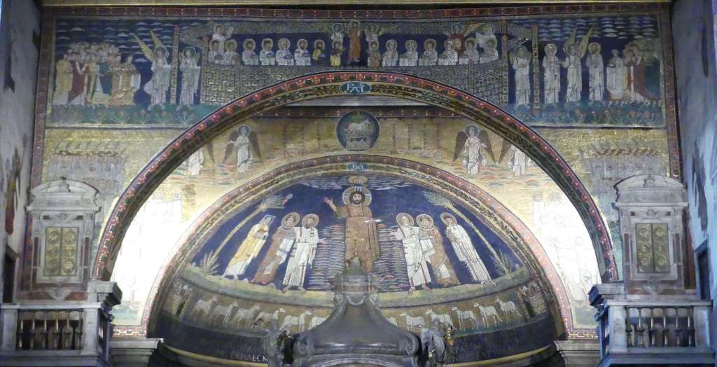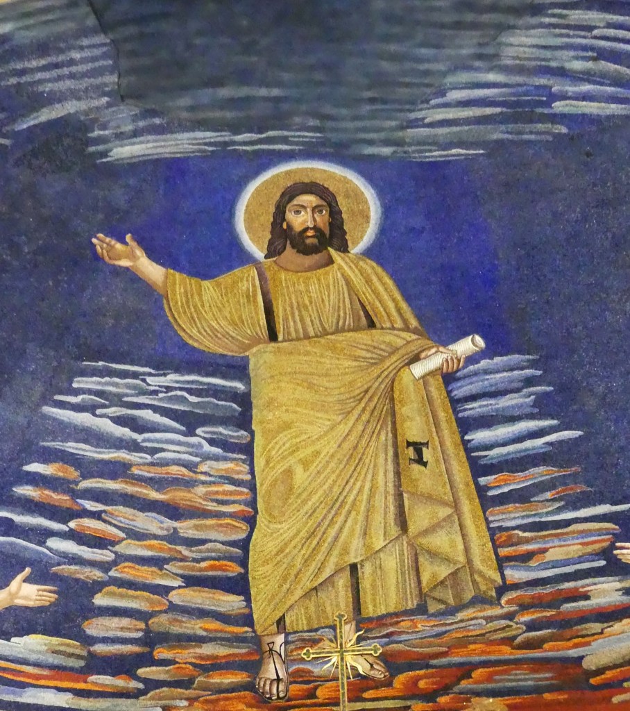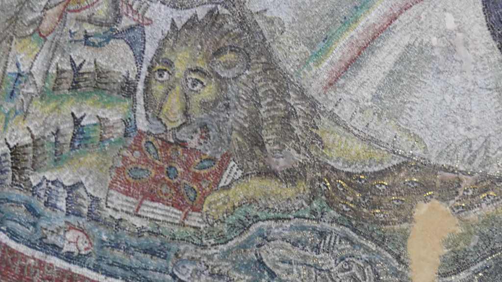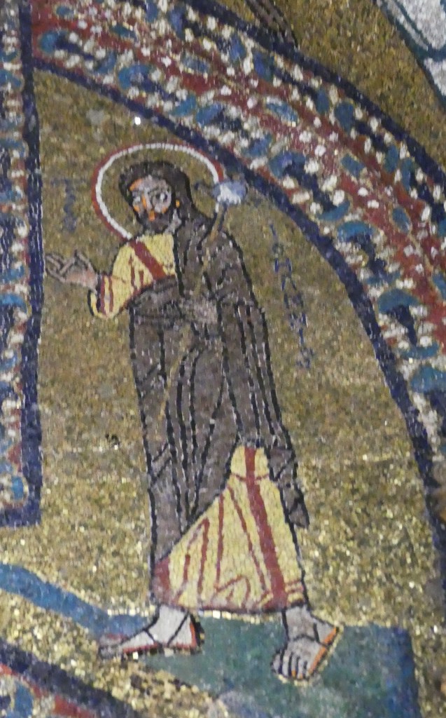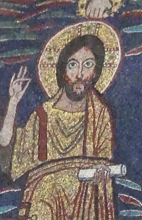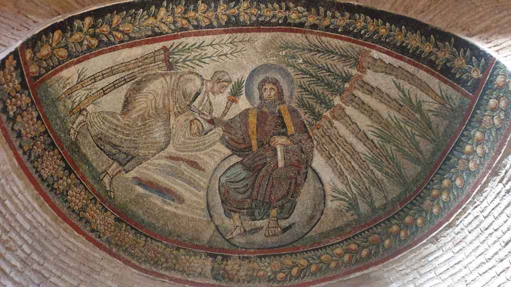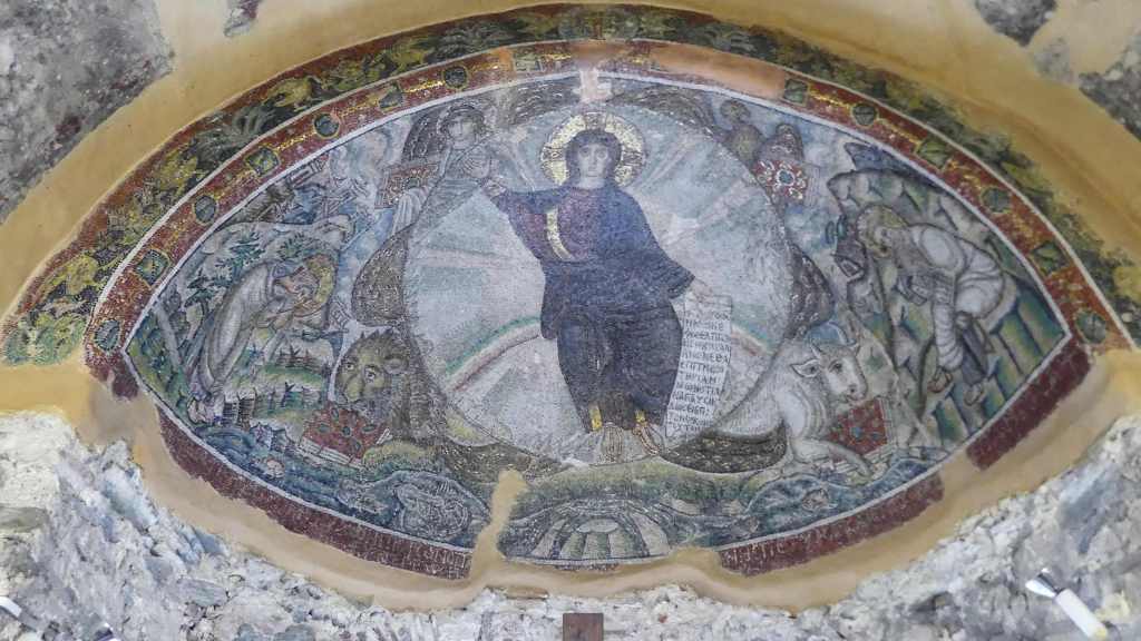 Na przełomie piątego i szóstego wieku konchę absydy kościoła udekorowano mozaiką, w stylu zbliżonym do mozaik pogańskich z tego okresu – uchodzącą za jedną najwybitniejszych mozaik wczesnochrześcijańskich – przedstawiającą młodzieńczego Chrystusa siedzącego na tęczy i otoczonego świetlistą nimbem, z prawą ręką wzniesioną w geście błogosławieństwa, a w lewej trzymającego rozwinięty zwój z napisem: „Oto nasz Bóg, Ten któremu zaufaliśmy, że nas wybawi” (Iz. 25:9). Wokół nimbu umieszczono symbole czterech Ewangelistów dzierżące ozdobne księgi Ewangelii, a po bokach figurują postacie proroków starotestamentowych, Ezechiela i Habakuka. Poniżej cztery rzeki raju spływają do Jordanu, w którym pluskają się ryby jak również pogański bóg rzeki, a w tle widać ukwieconą łąkę. Delikatne kolory mozaiki zapewniają harmonijną całość.