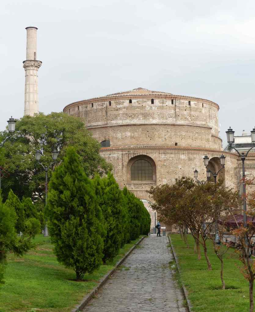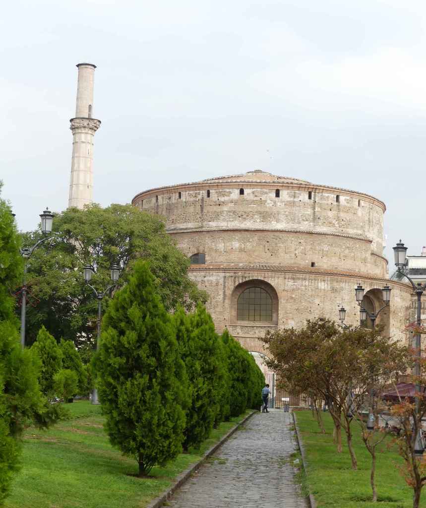 Rotunda Galeriusza, ukończona około roku 306, jest ogromną budowlą, wzniesioną na planie kolistym, z ceglanego muru cylindrycznego, o grubości 6,3 m i przykrytą płaską kopułą o średnicy 24,5 m, której zwornik wznosi się na wysokość niemal 30 m. W ścianach rotundy, na wysokości podłogi rozmieszczonych zostało symetrycznie osiem wielkich nisz przykrytych kolebkowymi sklepieniami. Wewnętrzne ściany oblicowane były marmurową wykładziną. Nie jest jasne, jakie było przeznaczenie rotundy. Być może miała ona służyć jako mauzoleum Galeriusza, chociaż nie został w nim pochowany, lub jako świątynia pogańska. Na kościół chrześcijański rotunda została przemieniona zapewne pod koniec czwartego wieku, za panowania Teodozjusza I. Dokonano w niej kilku zmian konstrukcyjnych, z którym najważniejszym było otoczenie całego budynku zewnętrznym murem koncentrycznym, odległym od dotychczasowego o około ośmiu metrów, lecz niższym i zadaszonym, dzięki czemu powstało wewnętrzne obejście, na które przebito przejścia, w miejscach istniejących wcześniej nisz.