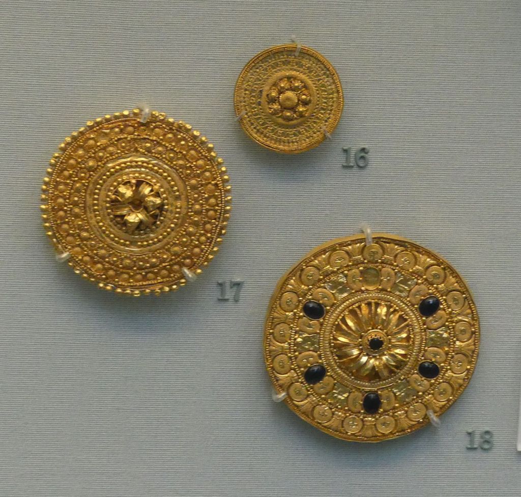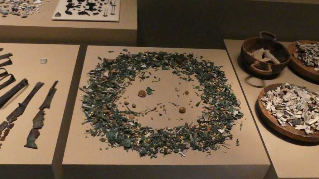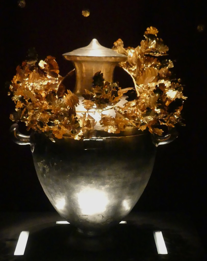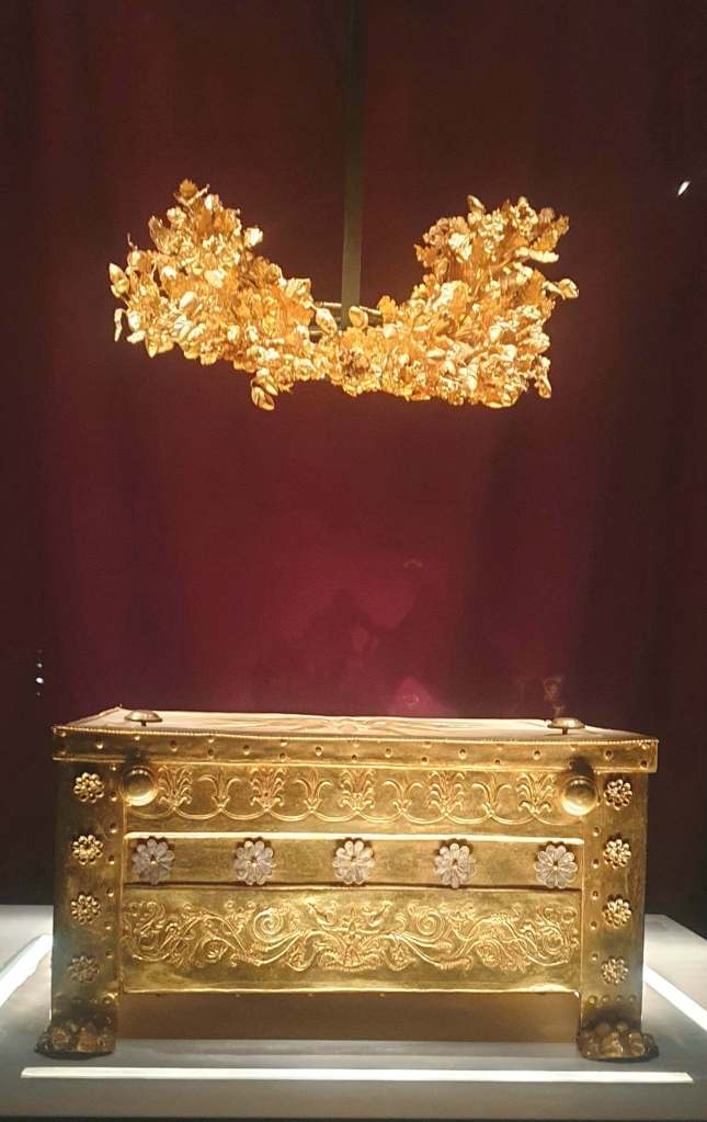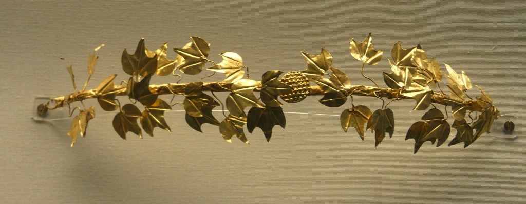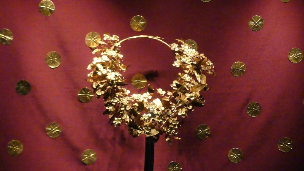 Złoty wieniec z liści i kwiatów mirtu oraz ozdobne złote krążki , z przedsionka Grobowca II