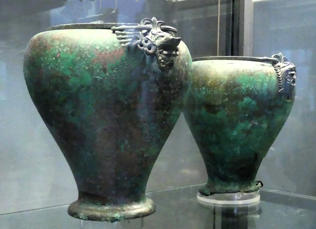 Częściowo zachowany, wspaniały wystrój malarski grobowców, oraz niezmiernie bogate wyposażenie Grobowców II i III – porównywalne z wyposażeniem grobu Tutenchamona – pozwoliło na ich zidentyfikowanie jako grobowców królewskich z drugiej połowy IV w. przed Chr. Andronikos zidentyfikował trzy odkryte przez siebie grobowce jako należące odpowiednio do królów Amyntasa III (391 – 370) – ojca Filipa II, samego Filipa (359 – 336), oraz Aleksandra IV – niepełnoletniego syna Aleksandra Wielkiego (zamordowanego około roku 310). Wysunięto jednak później alternatywną hipotezę, opartą na solidnych, lecz pozostawiających wątpliwości, przesłankach, według której miały to być groby Filipa II (Grobowiec I), Filipa III (323 – 317) – przyrodniego brata Aleksandra Wielkiego – (Grobowiec II) i Aleksandra IV (Grobowiec III). W latach 1990, we wspaniale odrestaurowanym i dostosowanym do potrzeb muzealnych zespole grobowców uruchomiono muzeum, w którym eksponowane jest in sito ich zachowane wyposażenie, opisane zgodnie z hipotezą Andronikosa.