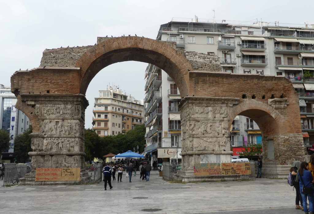 Łuk triumfalny, ustawiony w poprzek starożytnej Via Egnatia, wzdłuż której biegnie obecnie główna ulica Tesalonik, został wzniesiony na przełomie trzeciego i czwartego wieku, dla upamiętnienia wielkiego zwycięstwa nad perskimi Sasanidami, jakie Galeriusz odniósł w bitwie pod Satalą, w roku 297, po której splądrował ich stolicę, Ktezifolon. Łuk posiadał trzy przęsła, z których zachowały się dwa, częściowo licowane silnie zniszczonymi płaskorzeźbami przedstawiającymi epizody wojny z Persami oraz życia dworskiego.