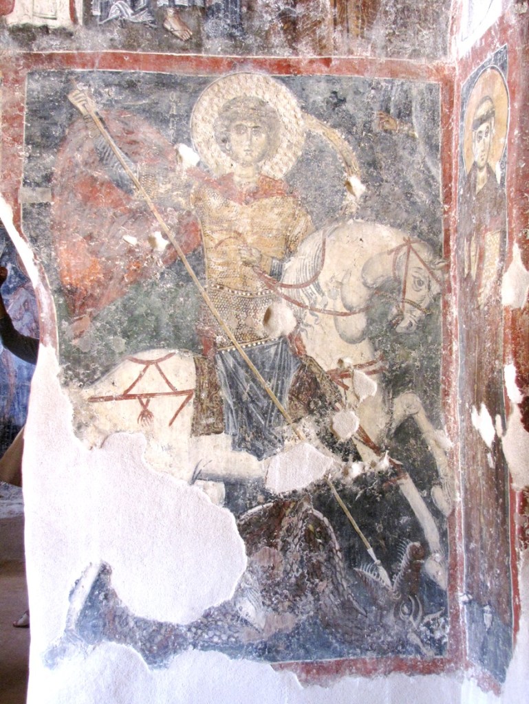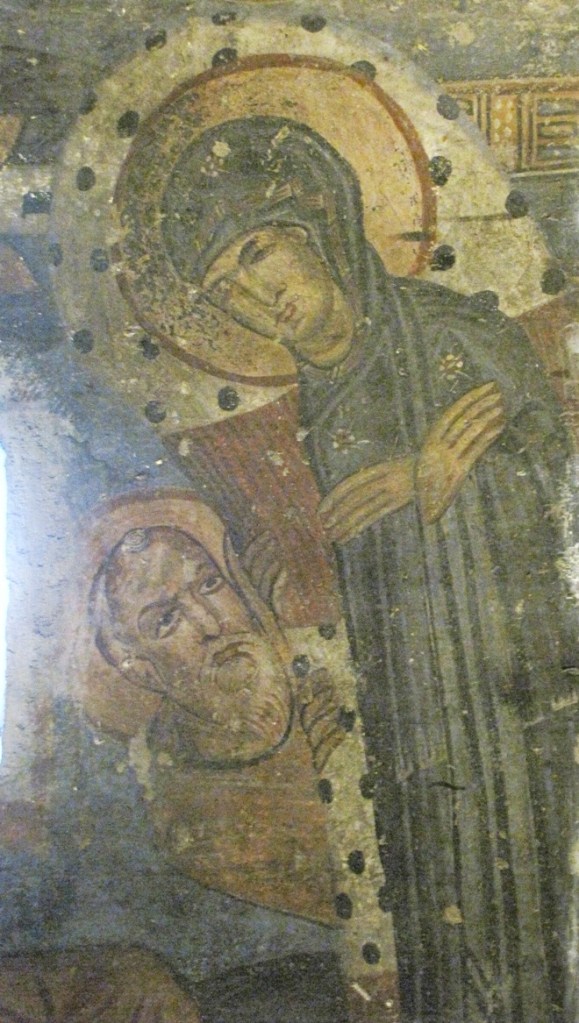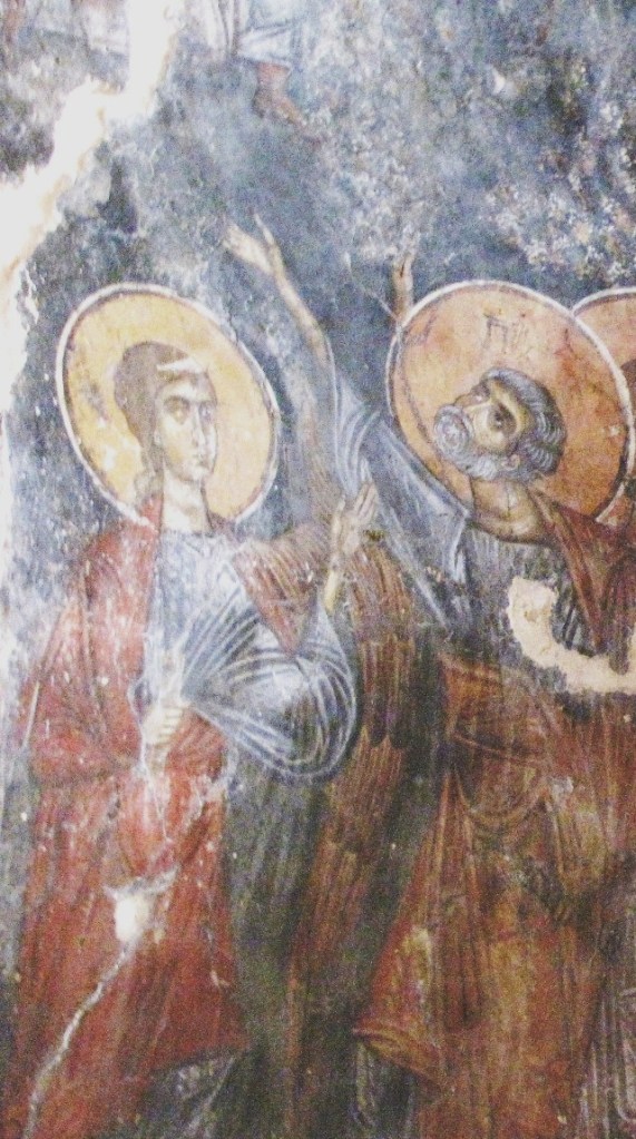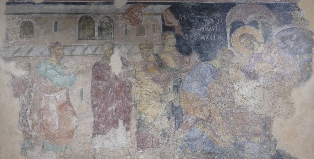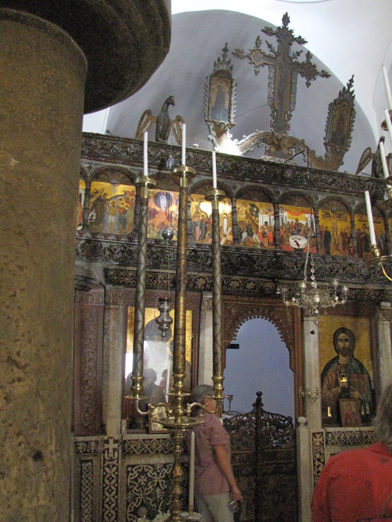 Najcenniejszym zabytkiem bizantyńskim, jaki obejrzeliśmy na Krecia był  maleńki kościółek Panaghia Kyra, usytuowany w starym sadzie oliwnym, w pobliżu wioski Kritsa, na wschodnim krańcu wyspy. Kościółek ten wzniesiony został XIII i XIV w., a w jego wnętrzu zachował się – co prawda w nie najlepszym stanie – niemal kompletny wystrój malarski. Jego powstanie przypadło na ostatni już okres rozkwitu sztuki bizantyńskiej, zwany „renesansem Paleologów”. Malarstwo bizantyńskie tego okresu charakteryzuje się pewnym  odejściem od monumentalności oraz skłonnością do liryzmu i anegdotyczności. Takimi cechami oznaczają się również freski w Panaghia Kyra, przedstawiające  pełne wyrazu podobizny Chrystusa i świętych, oraz dosyć naiwne sceny narracyjne – ewangeliczne, a także ilustrujące dzieciństwo Panny Maryi.