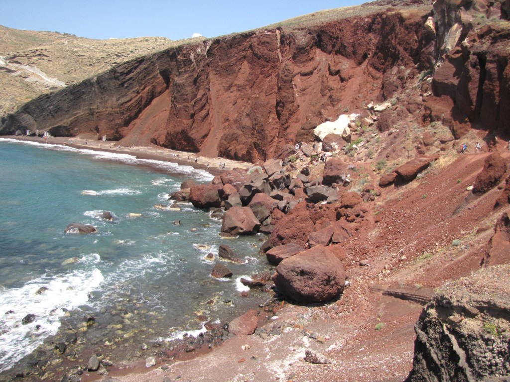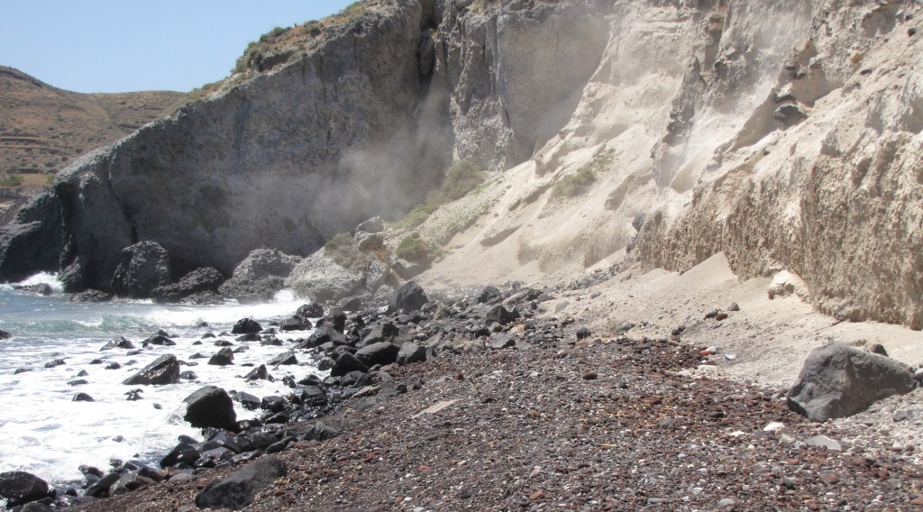 W wyniku erupcji z XVII w. przed Chr., ocalałe resztki Thery, pokryte zostały grubą warstwą pyłu wulkanicznego i pozostawały niezamieszkałe przez około cztery wieki, a olbrzymia fala tsunami, jaka powstała przy wybuchu, przyniosła straszliwe  zniszczenia tak zwanej kulturze minojskiej, z centrum na Krecie, w orbicie której leżała również Thera. Ten niszczycielski kataklizm przyczynił się jednakże do wyjątkowo pięknego ukształtowania całego archipelagu. Od strony kaldery,  brzegi wyspy Santorini opadają w dół stromymi klifami o rudawo-brunatnym odcieniu, których wysokość osiąga ponad trzysta metrów, natomiast od strony zewnętrznej teren zniża się łagodnie ku morzu, przedzielony tylko na pół pasmem jasnoszarych skalistych gór, których najwyższy szczyt (ok. 550 m)  nosi nazwę Profiti Ilia, pochodzącą od wznoszącego się na nim klasztoru. Plaże, z grubego wulkanicznego żwiru są na ogół czarnego koloru, choć trafiają się również czerwone, a także  białe, którym barwę nadają złoża pumeksu, intensywnie eksploatowane na  Santorini w ubiegłych wiekach.