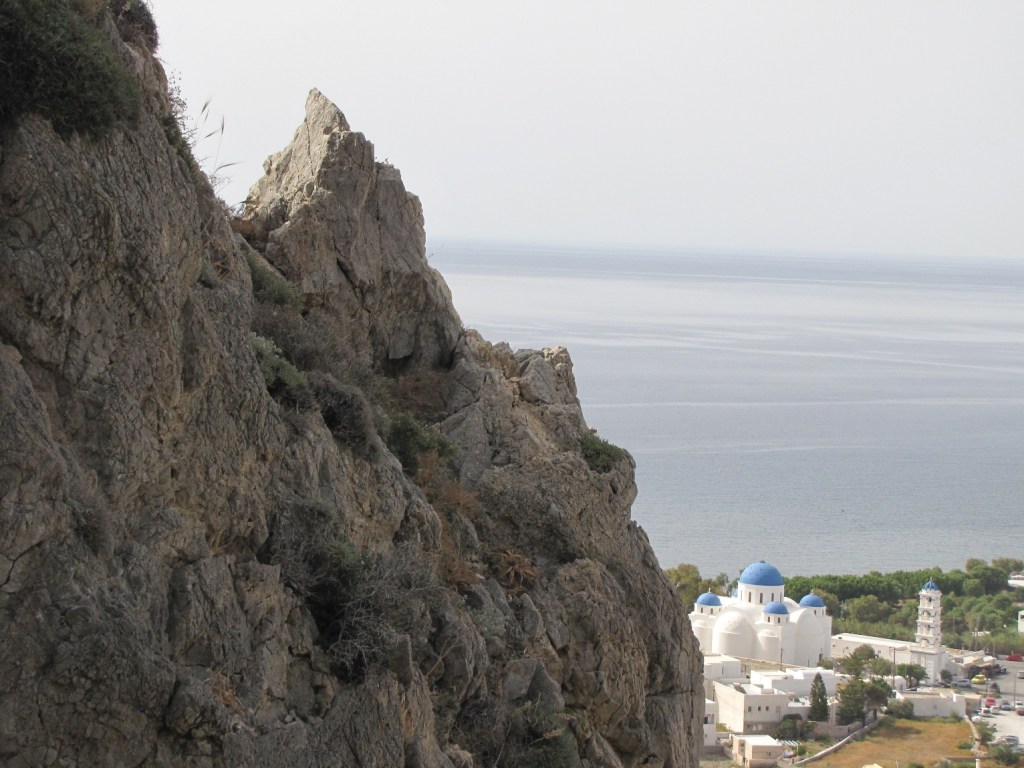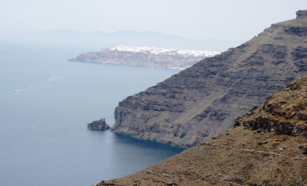 Skalisty łańcuch Profiti Ilia dochodzi do samego morza, gdzie kończy się niemal pionową ścianą skalną, pond trzystu metrowej wysokości, z której szczytu roztacza się fantastyczny widok. Na tym strategicznym cyplu wznosiło się niegdyś starożytne miasteczko, Archaia Thera, według tradycji założone przez spartanina Therasa, od imienia którego miała jakoby pochodzić nazwa nie tylko samego osiedla lecz i całej wyspy. Z badań archeologicznych wynika że miasteczko było zamieszkałe przez ponad tysiąc lat, poczynając od IX w. przed Chr., a okres największego rozkwitu przeżywało w trzecim i drugim wieku przed Chr. , gdy na Santorini mieściła się główna baza floty egipskich Ptolemeuszy. Z tego czasu zachowały się ruiny miasteczka, z agorą, kilkoma świątyniami, bazyliką z dużym portykiem oraz z wykutym w skale teatrem mieszczącym półtora tysiąca widzów. Podczas prac archeologicznych prowadzonych w ruinach miasteczka i związanej z nim nekropolii odkryto szereg ciekawych artefaktów, a wśród nich kilka rzeźb kurosów pochodzących z drugiej połowy siódmego wieku przed Chr. Natomiast na skałach przy brukowanej drodze antycznej prowadzącej do miasteczka, zachowało się kilka płaskorzeźb, mających zapewne charakter kultowy.
