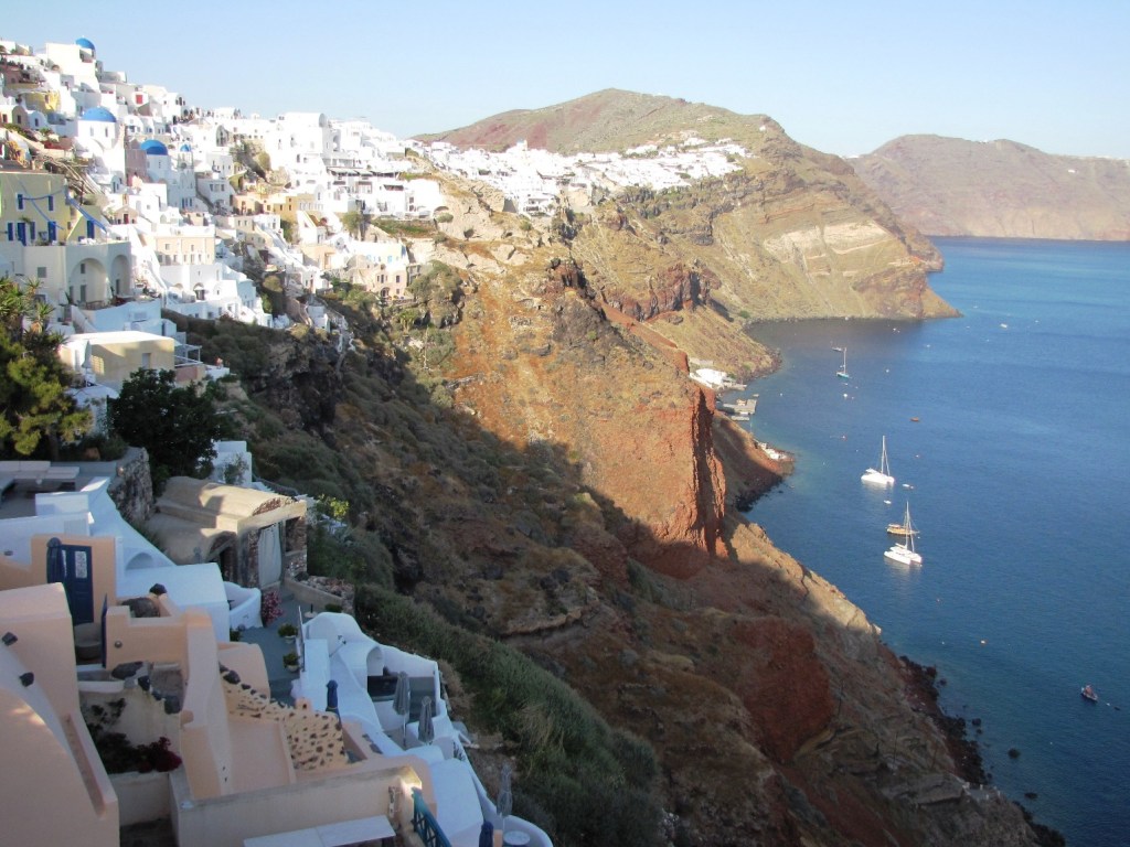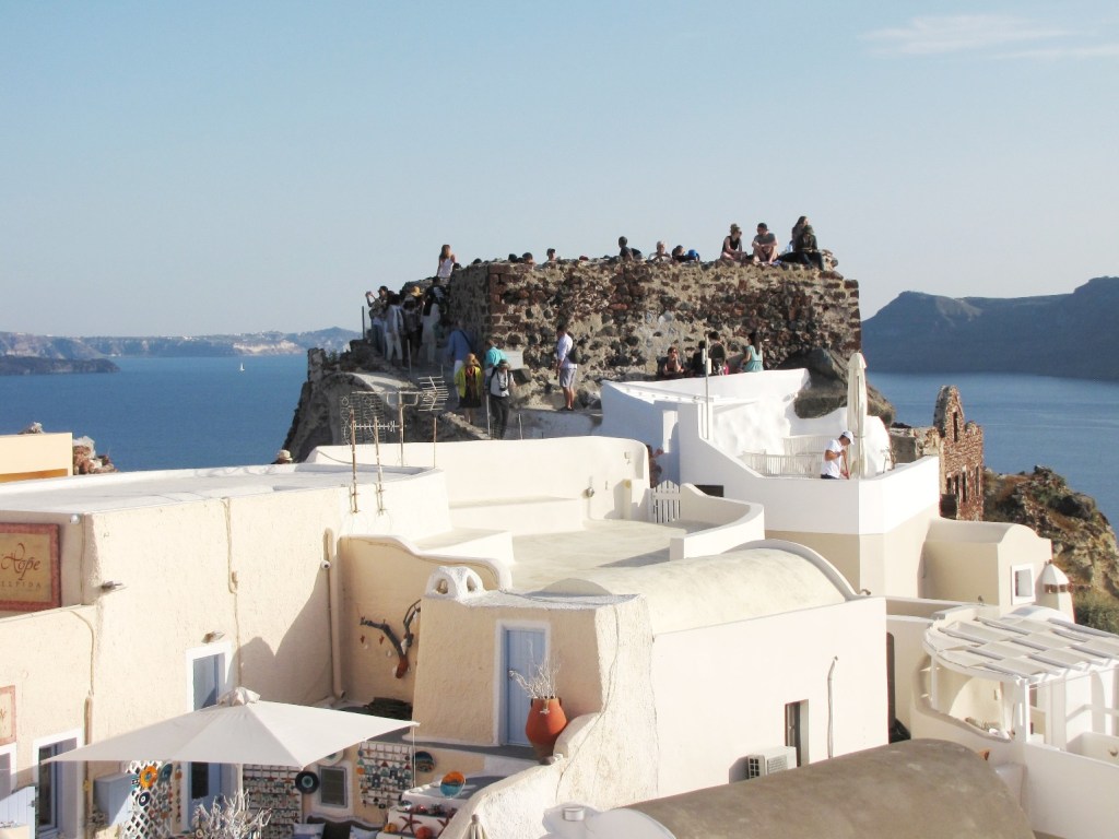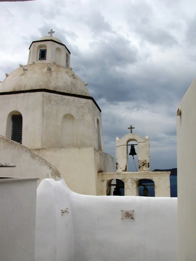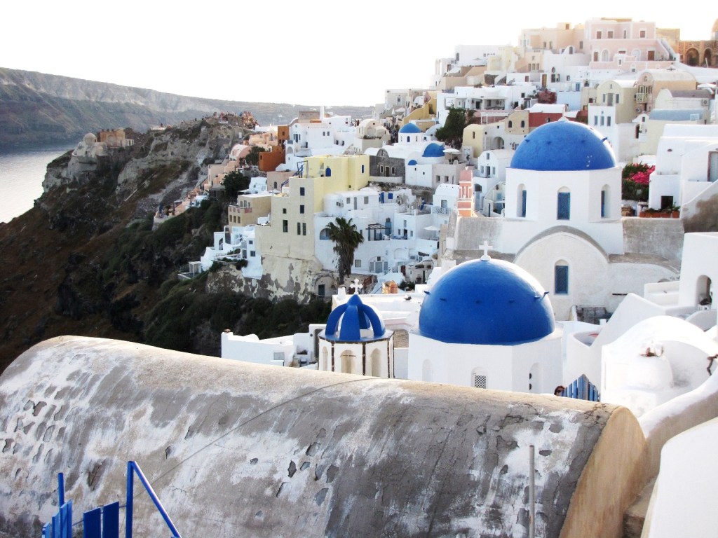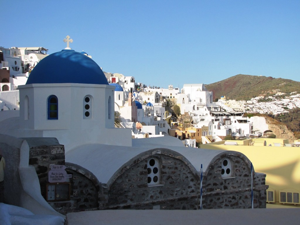Tą naturalną malowniczość podkreśla jeszcze charakterystyczna cykladzka zabudowa, olśniewająco biała, z niebieskimi akcentami kopuł cerkiewnych, która, niby bita piana,  spływa ze szczytów klifów. Najczęściej fotografowana jest stolica wyspy Fira, oraz Oia, znana ze wspaniałych zachodów słońca. Niestety nie mieliśmy możliwości podziwiać ich w pełnej krasie, gdyż tego wieczora, gdy wybraliśmy się do Oi, słońce złośliwie zaszło za chmurę.