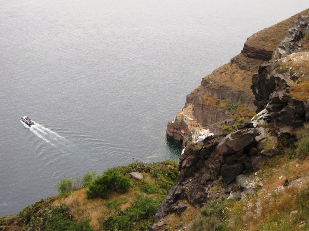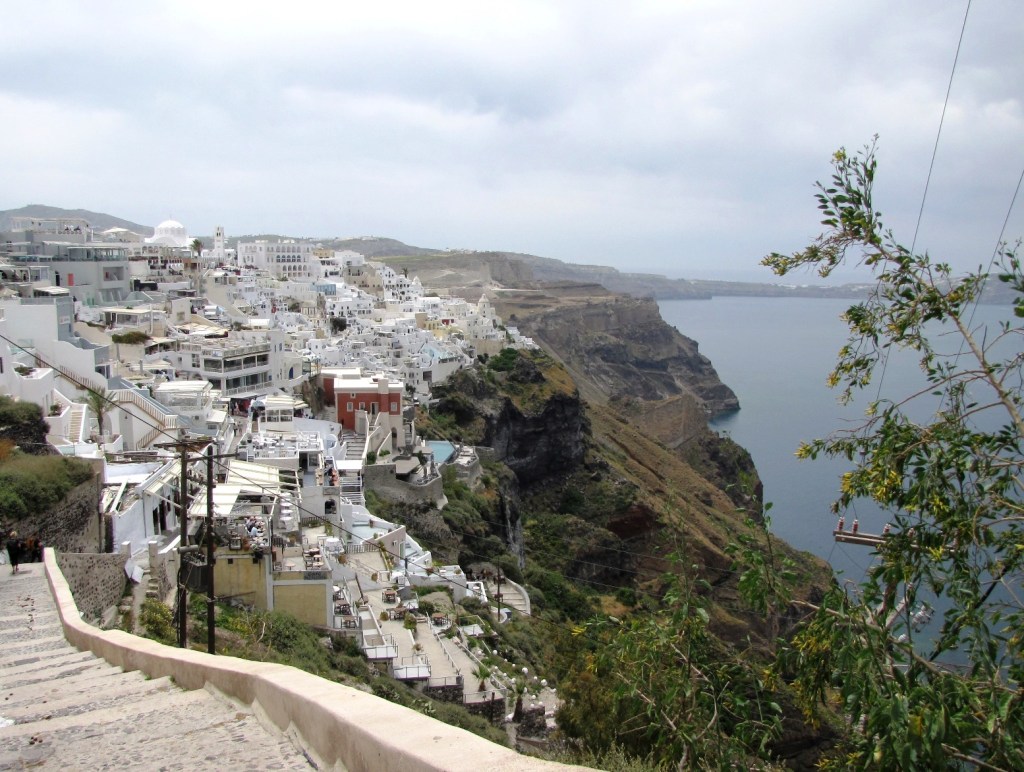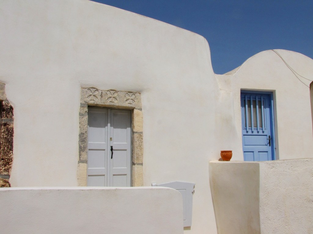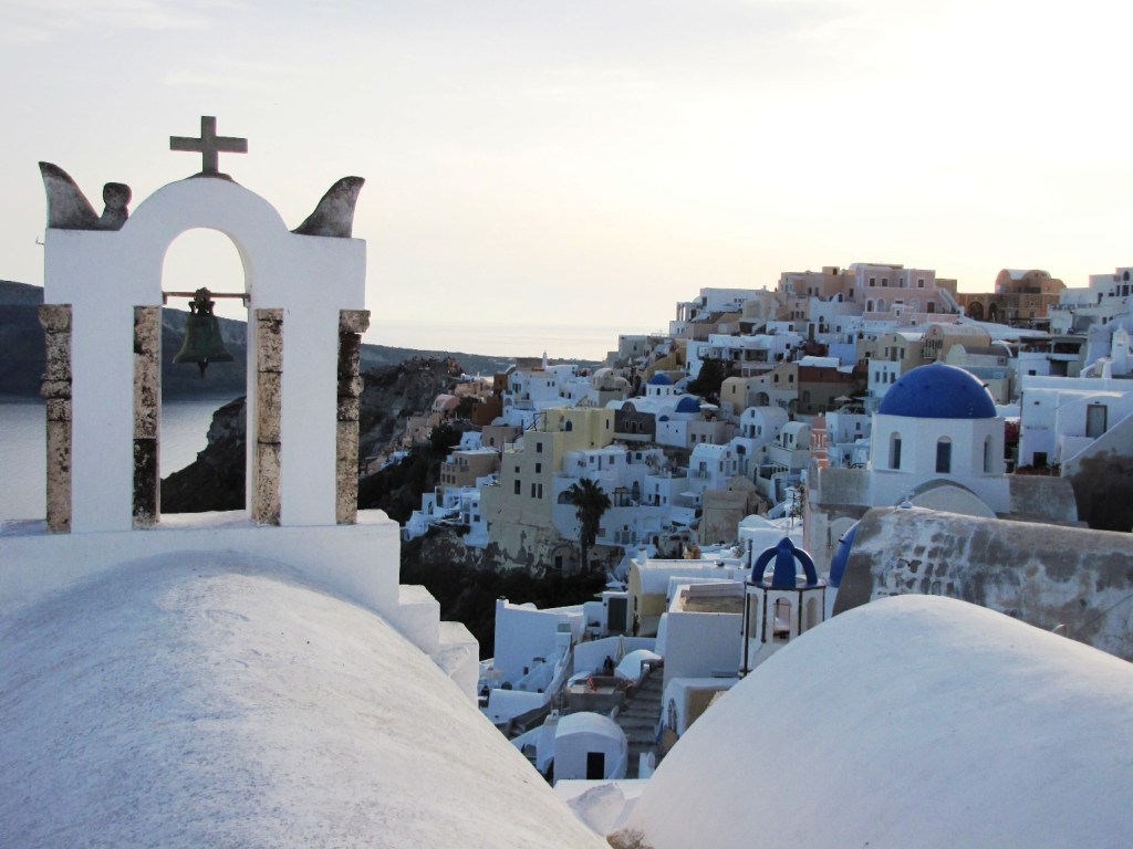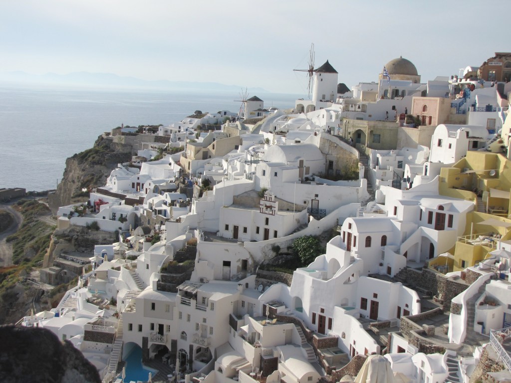 Tą naturalną malowniczość podkreśla jeszcze charakterystyczna cykladzka zabudowa, olśniewająco biała, z niebieskimi akcentami kopuł cerkiewnych, która, niby bita piana,  spływa ze szczytów klifów. Najczęściej fotografowana jest stolica wyspy Fira, oraz Oia, znana ze wspaniałych zachodów słońca. Niestety nie mieliśmy możliwości podziwiać ich w pełnej krasie, gdyż tego wieczora, gdy wybraliśmy się do Oi, słońce złośliwie zaszło za chmurę.