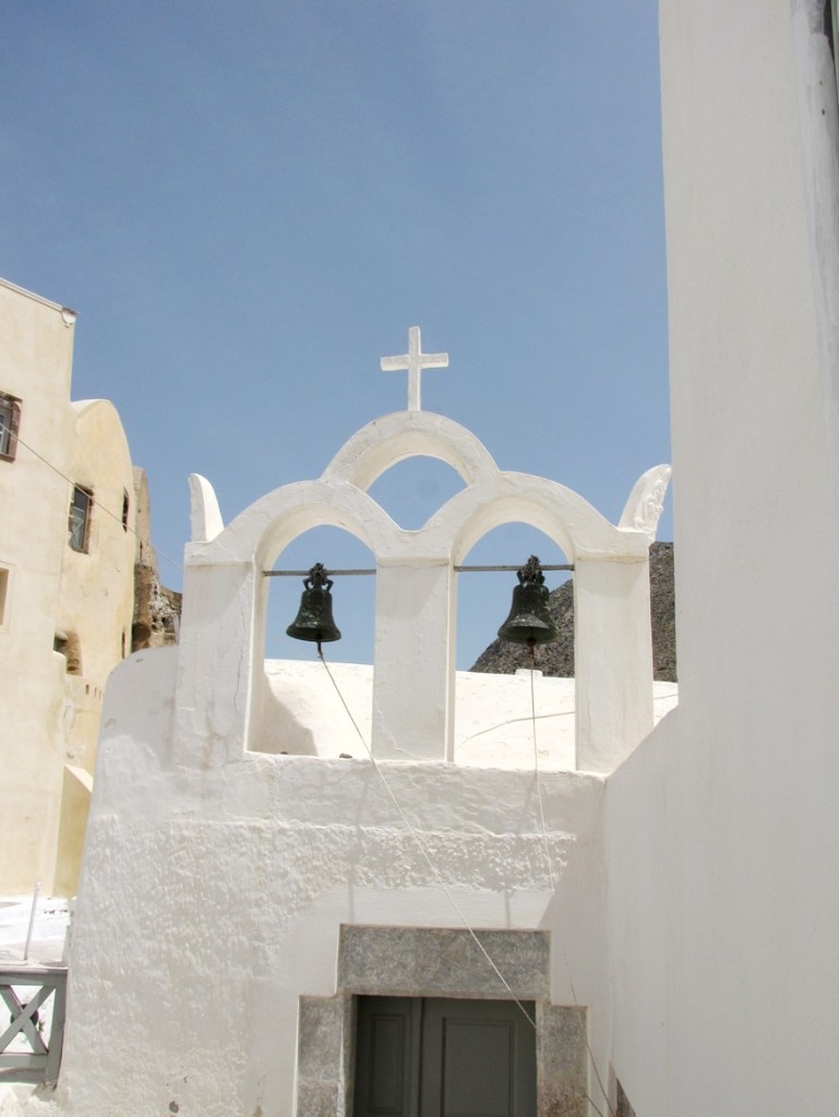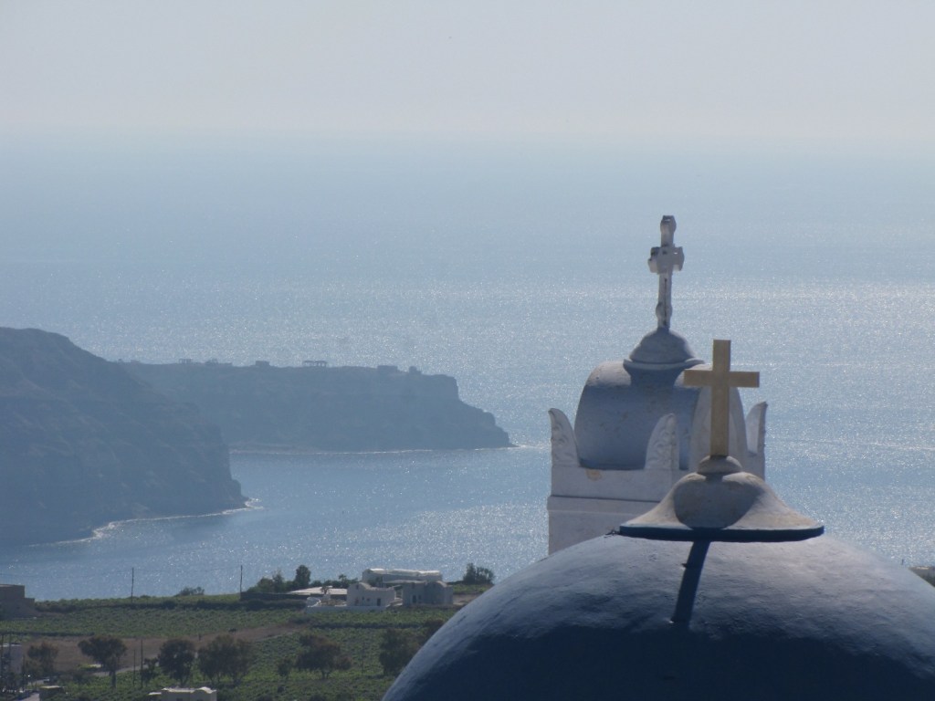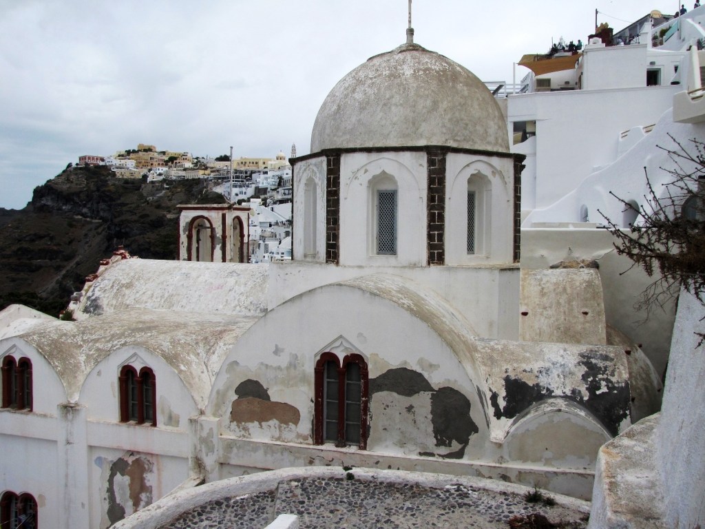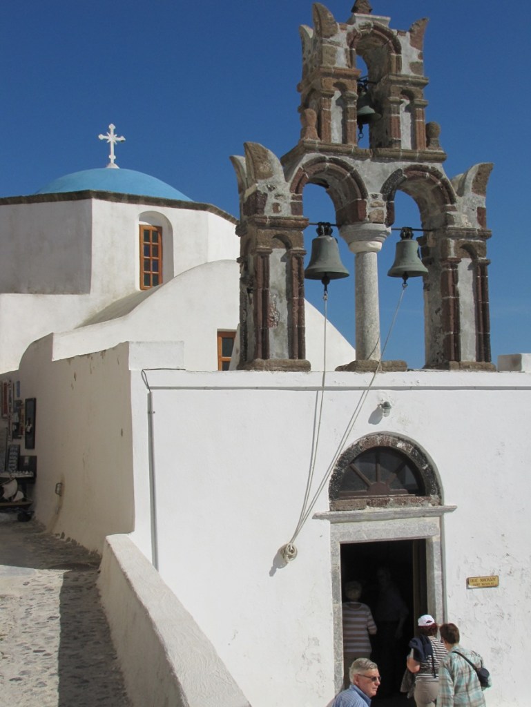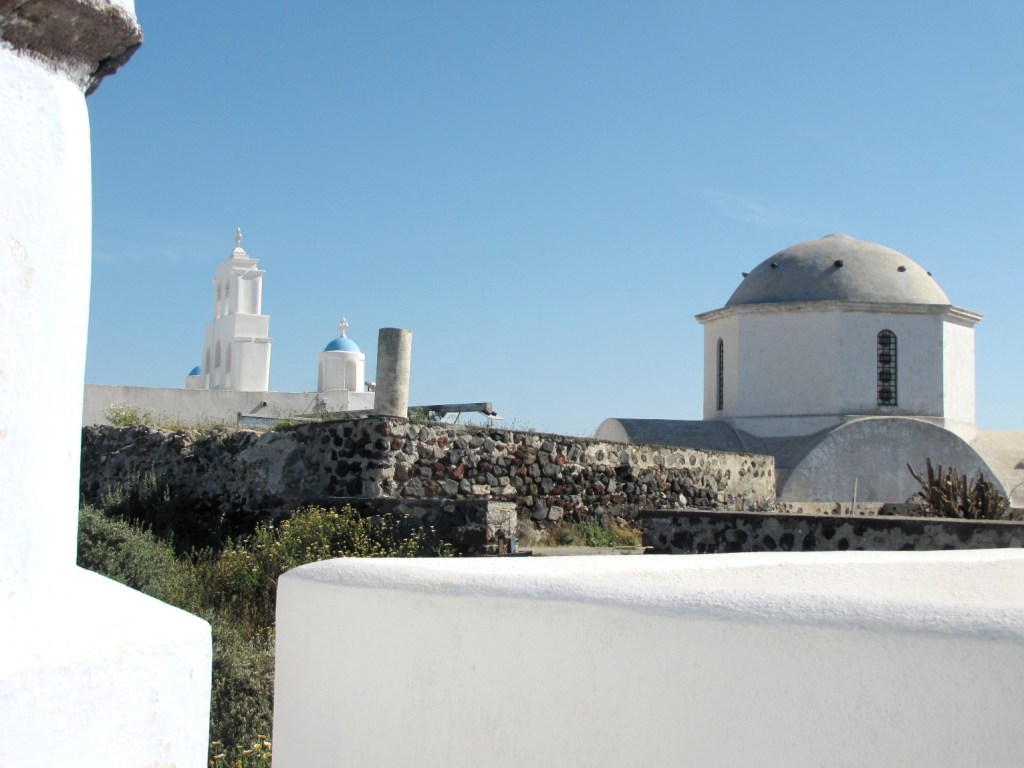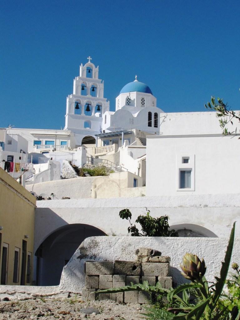 Na Santorini jest podobno ponad 250 kościołów, nie licząc wielkiej liczby „prywatnych” kaplic. Biorąc pod uwagę fakt, że liczba stałych mieszkańców wynosi około 15 tysięcy, jest to zapewne jedna najgęstszych sieci domów modlitwy na świecie. Ogromna ich większość to świątynie prawosławne, jest jednak również sporo katolickich, co stanowi spuściznę po Księstwie Archipelagu (Ducato dell’arcipelago), założonym przez  Wenecjan po łupieskiej IV Krucjacie, które przetrwało na Cykladach przez ponad 350 lat, aż do podboju tureckiego w roku 1566.