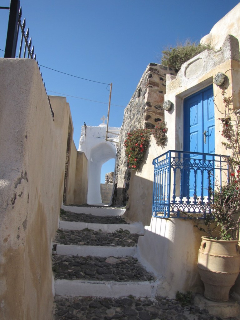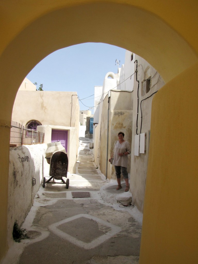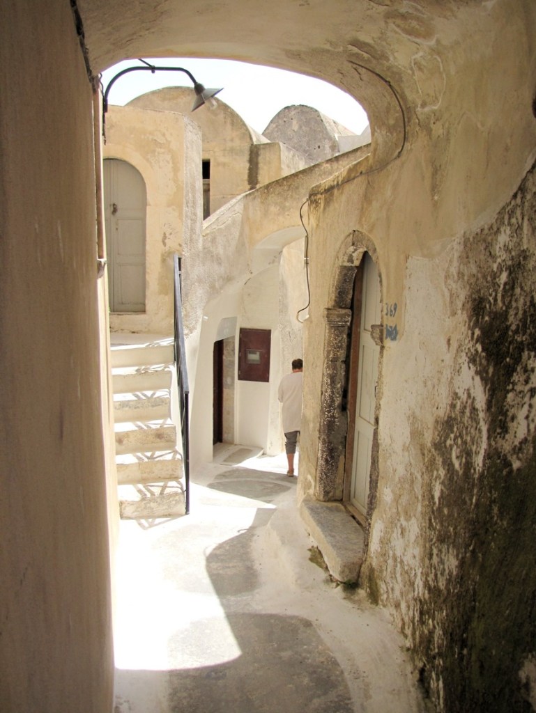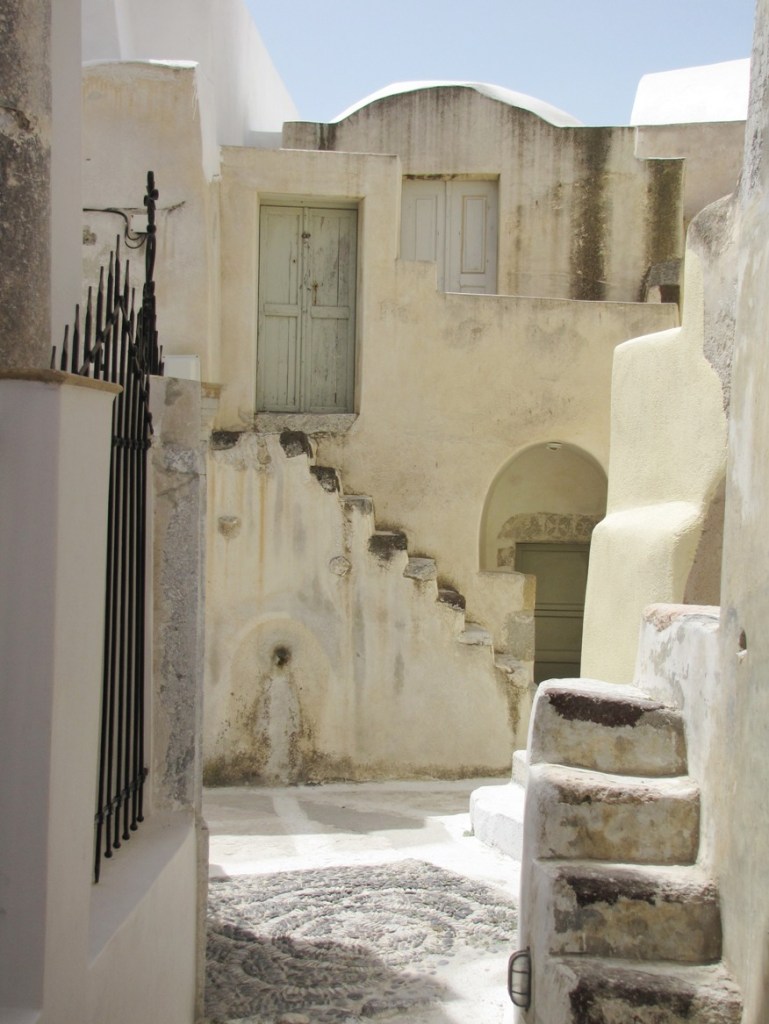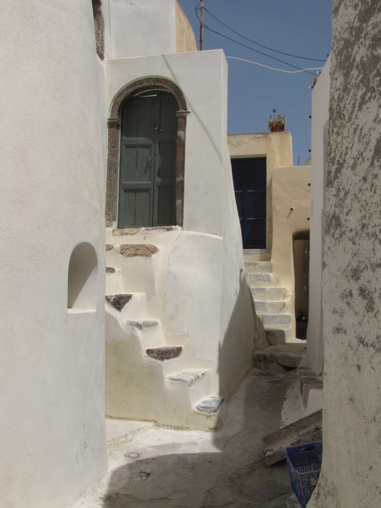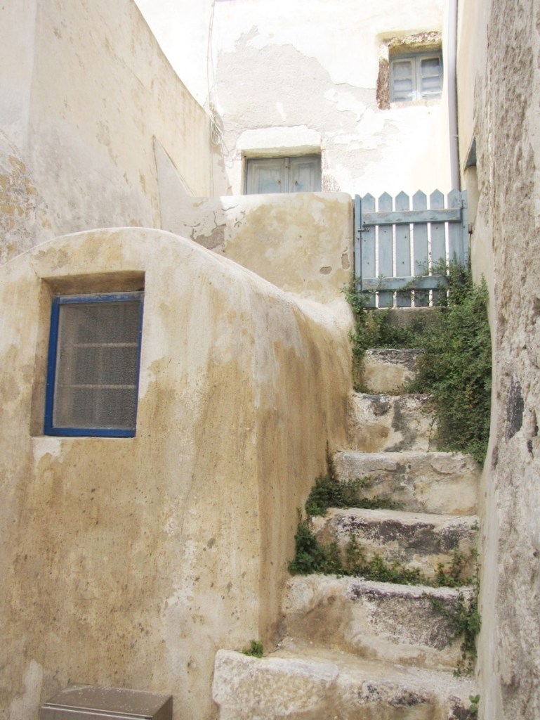 Może ze względu na to, że obie te miejscowości były ogromnie zatłoczone przez turystów, większe wrażenie zrobiły na nas dwa inne osiedla, Pirgos i Emporio, położone wewnątrz wyspy, z daleka od morza, a więc niewątpliwie mniej malownicze, ale za to bardziej „autentyczne”. W Emporio wydawało się nam, że zanurzamy się w jakimś  bajkowym świecie: całkowita cisza i pustka; wąskie i kręte uliczki, wspinające się schodami w górę, lub opadające w dół, wśród ścian o nieskazitelnej bieli, lub w kolorze kości słoniowej.