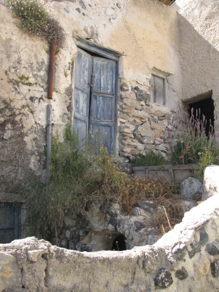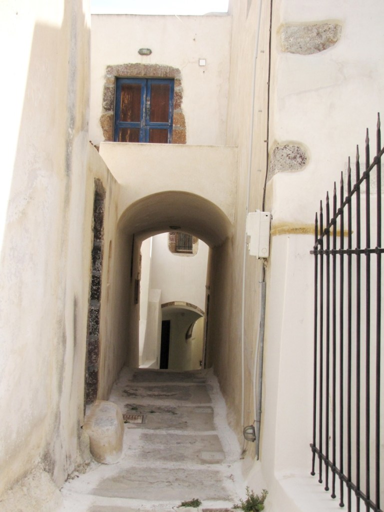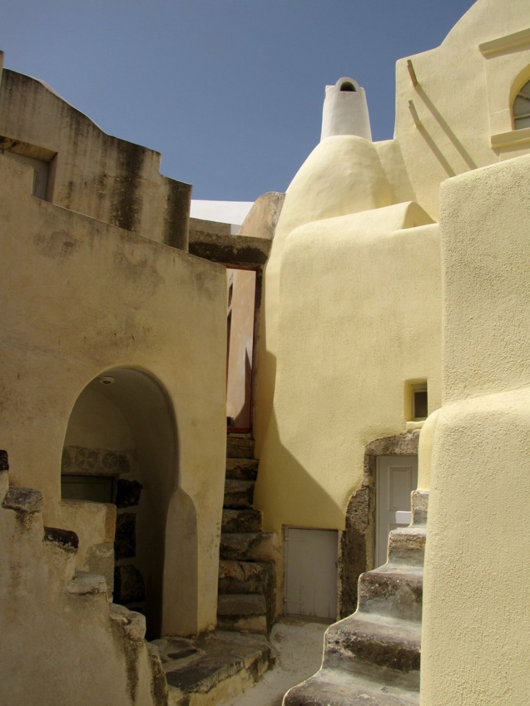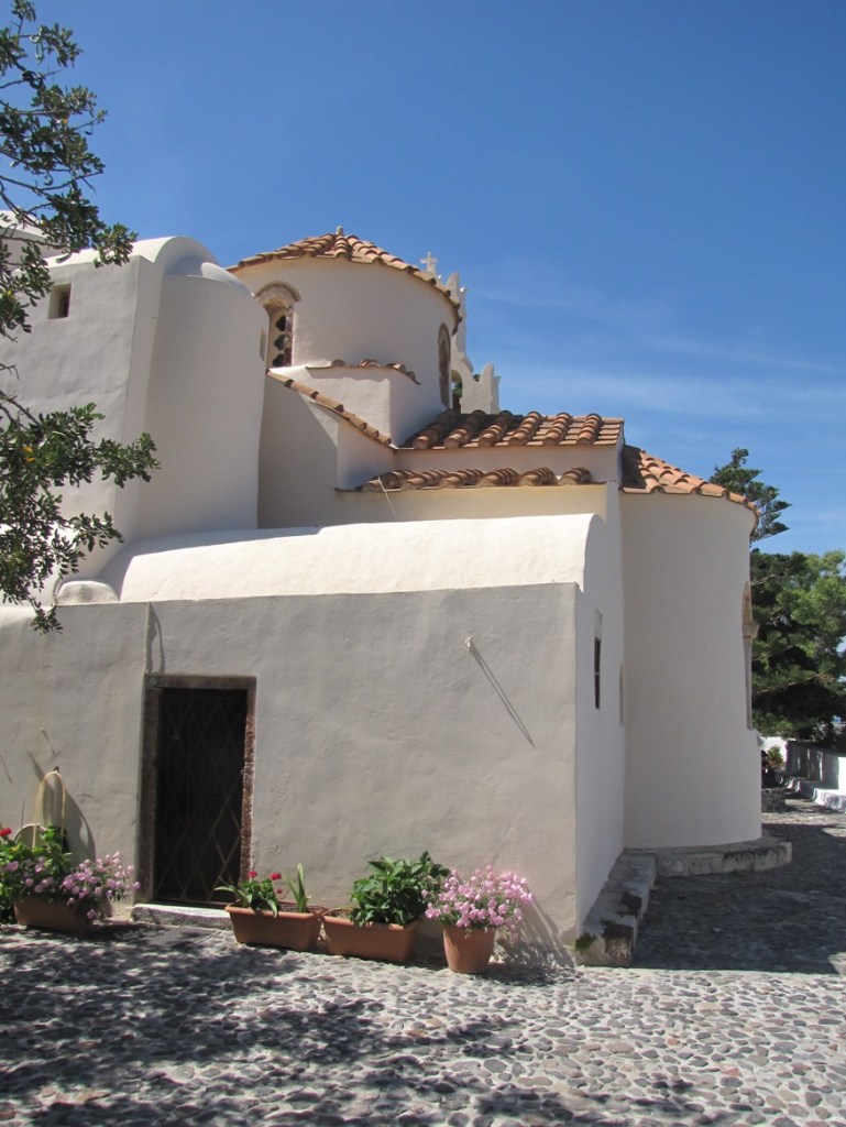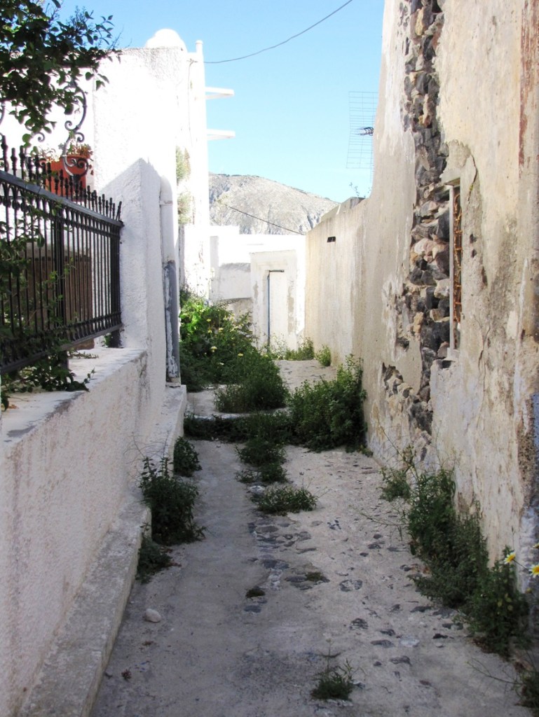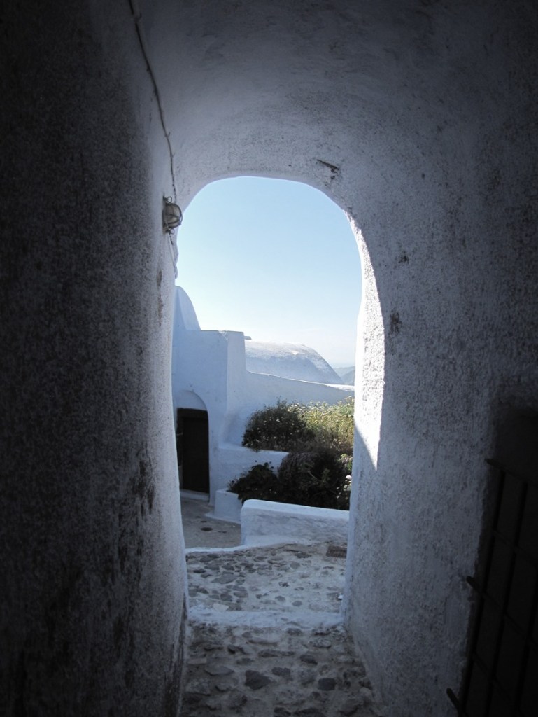 Może ze względu na to, że obie te miejscowości były ogromnie zatłoczone przez turystów, większe wrażenie zrobiły na nas dwa inne osiedla, Pirgos i Emporio, położone wewnątrz wyspy, z daleka od morza, a więc niewątpliwie mniej malownicze, ale za to bardziej „autentyczne”. W Emporio wydawało się nam, że zanurzamy się w jakimś  bajkowym świecie: całkowita cisza i pustka; wąskie i kręte uliczki, wspinające się schodami w górę, lub opadające w dół, wśród ścian o nieskazitelnej bieli, lub w kolorze kości słoniowej.