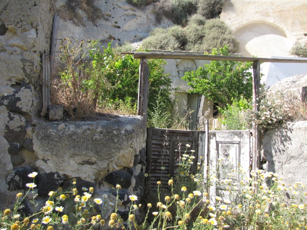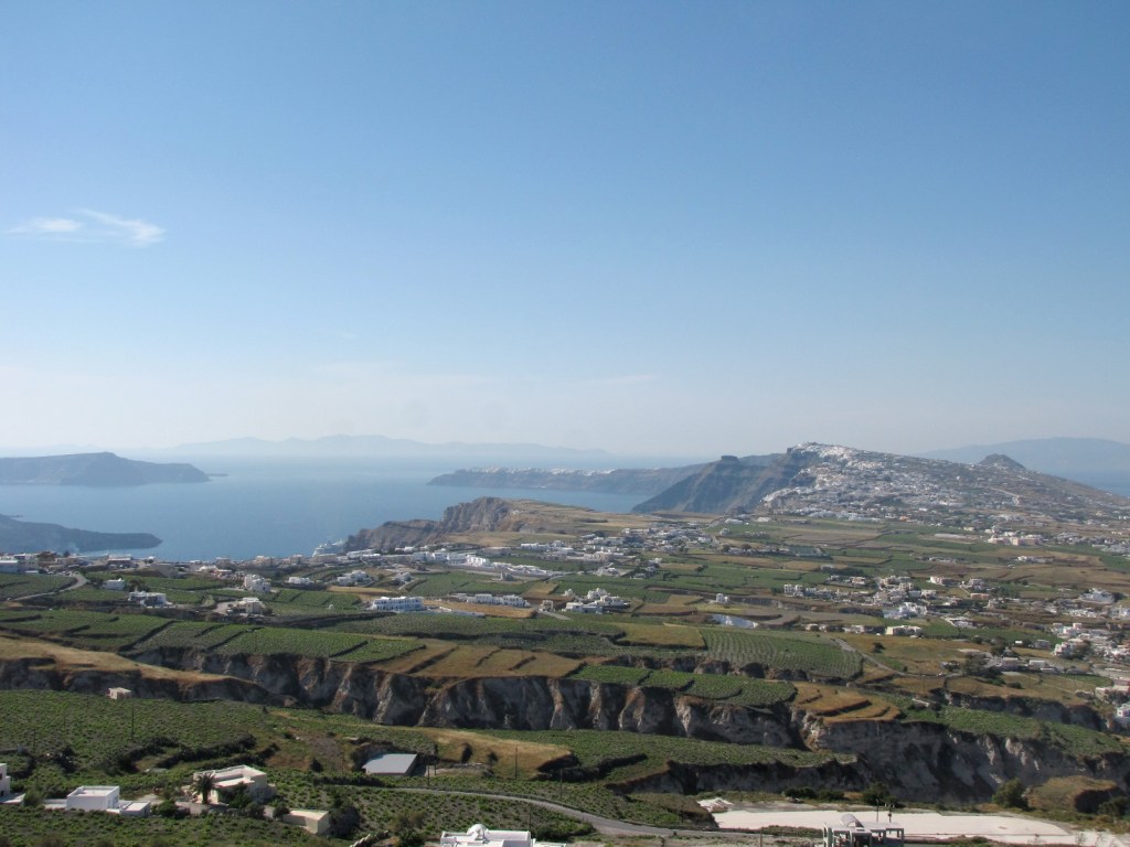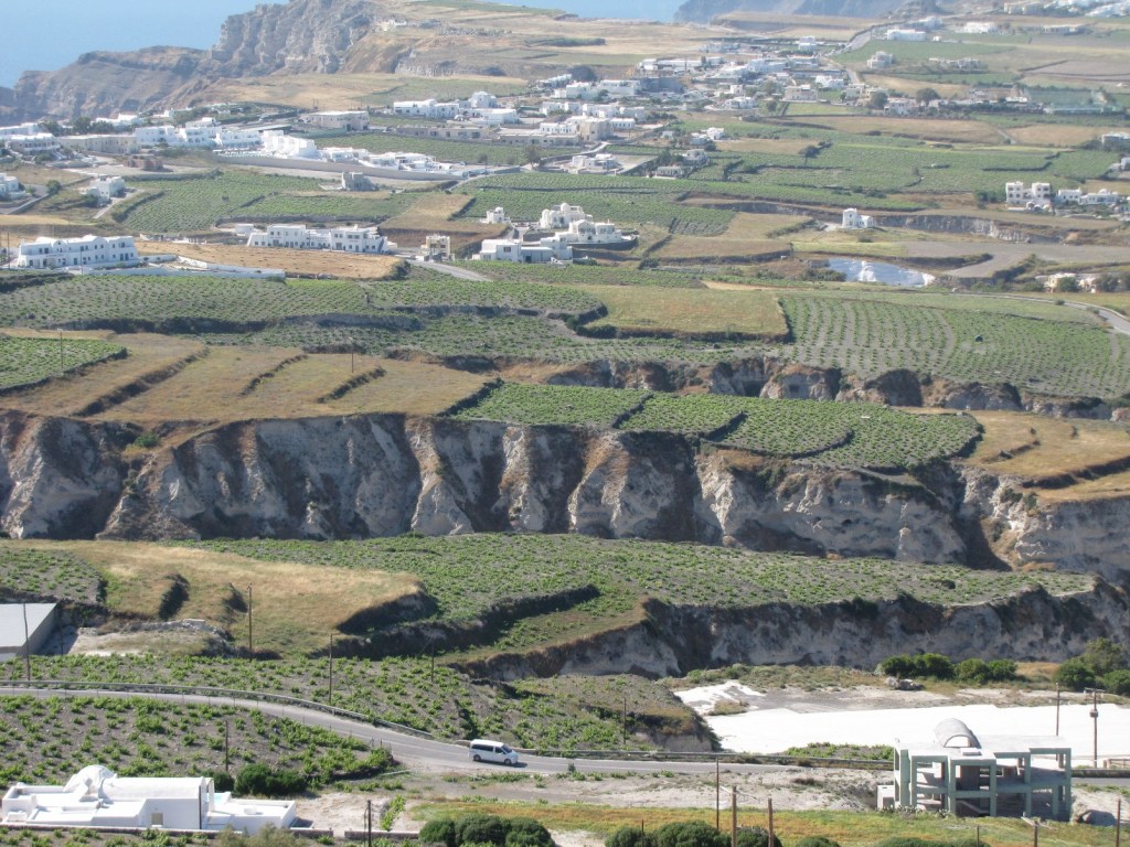 Z Pirgos – położonej na szczycie wzgórza dawnej stolicy wyspy – roztacza się piękny widok na dolinę, pokratkowaną murkami winnic. Wulkaniczna gleba sprzyja wysokiej jakości winogron; ich krzaki płożą się po ziemi, by jak najdłużej utrzymać wilgoć, której brak odczuwa się na Santorini.