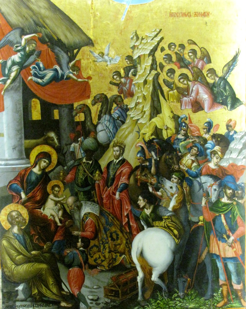 Michail Damaskinos, Pokłon Trzech Króli, Muzeum Sztuki Chrześcijańskiej w Heraklionie; król w koronie, przedstawiony na środku, uważany jest za autoportret artysty