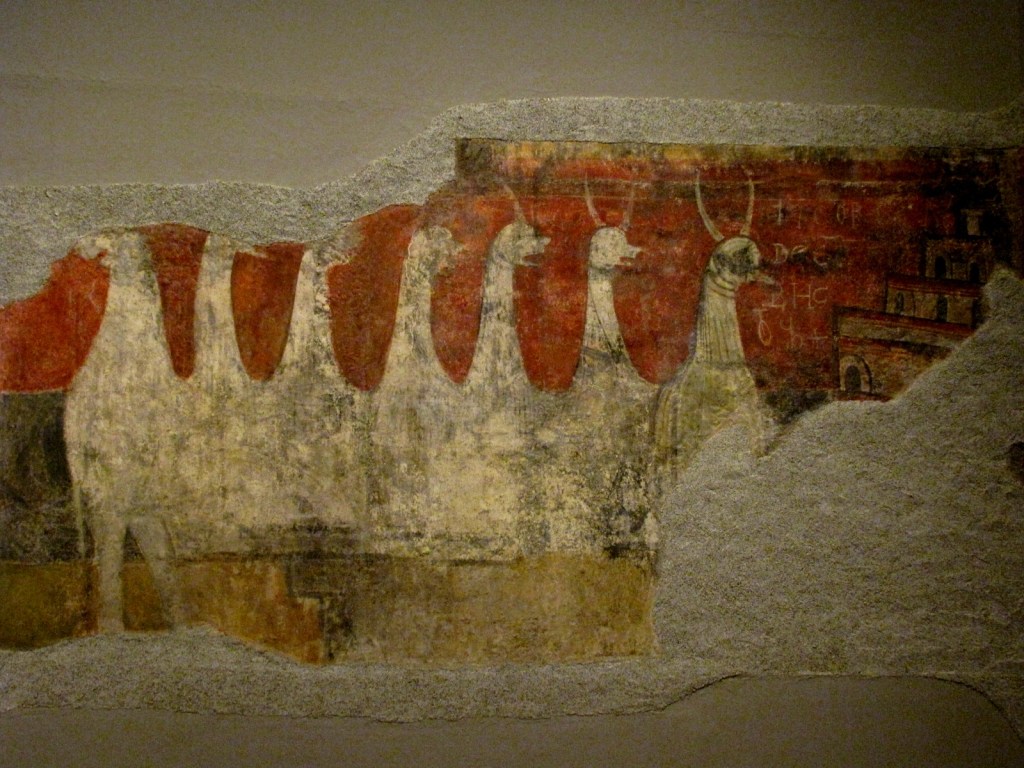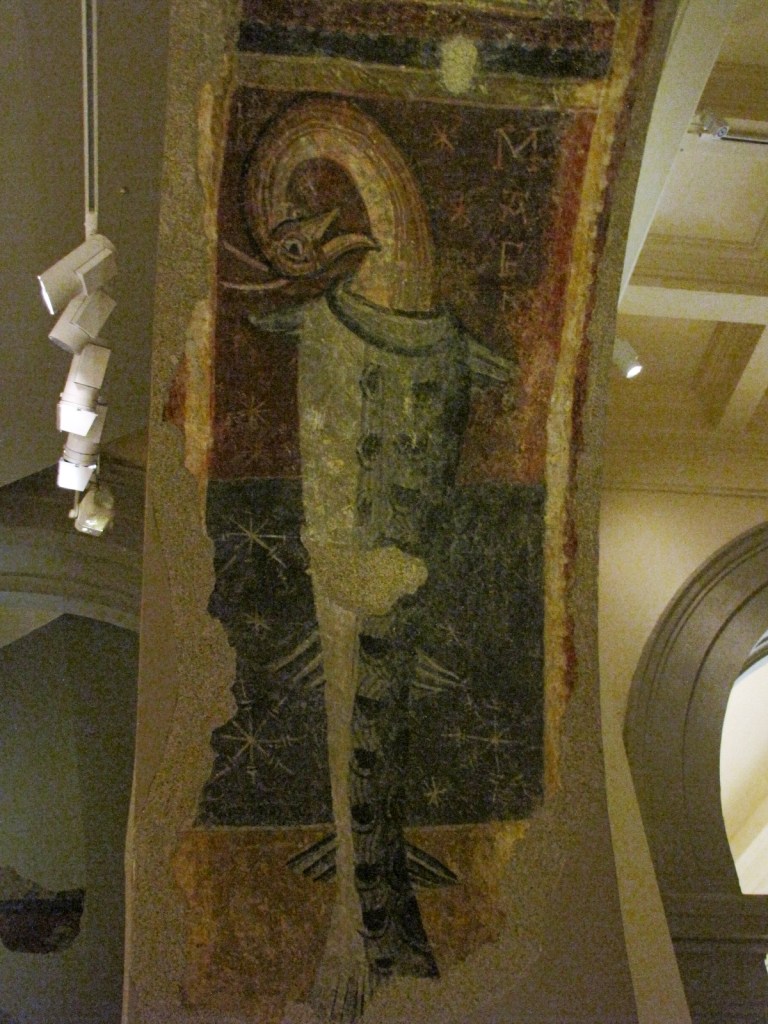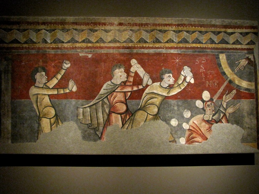 Do najstarszych fresków przechowywanych w MNAC należą pochodzące z kościoła Sant Joan w Boì, miejscowości leżącej w dolinie o tej samej nazwie, datowane na około roku 1100. Wystrój tego kościoła, zachowany tylko częściowo, nie pozwala na odtworzenie koncepcji ikonograficznej całej dekoracji malarskiej. Kościół jest trójnawowy, a nawy boczne oddzielają od środkowej kolumny wspierające łuki ścian. Stosunkowo dobrze zachowały się freski na wewnętrznej stronie tych łuków, przedstawiające fantastyczne zwierzęta, częściowo znane z bestiariuszy średniowiecznych; ich dokładne symboliczne znaczenie nie zawsze jest znana, na pewno jednak miały przedstawiać siły zła, natomiast skontrastowane z nimi siły dobra reprezentowały postacie świętych, umieszczone na ścianach, ponad łukami. Dobrze zachowała się scena kamienowania Św. Szczepana.