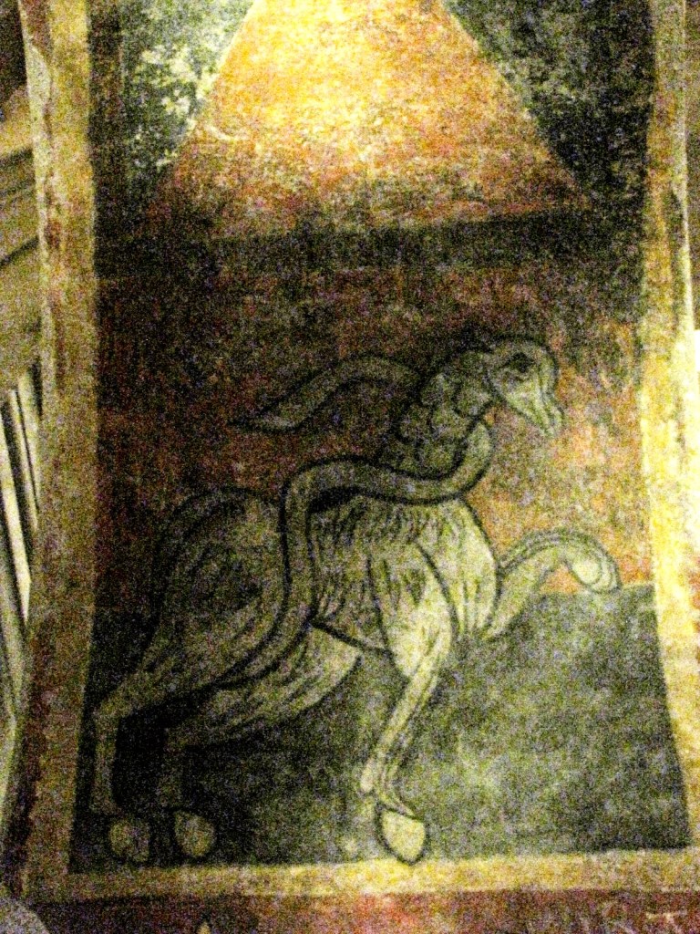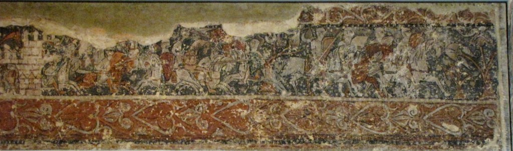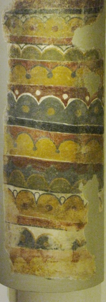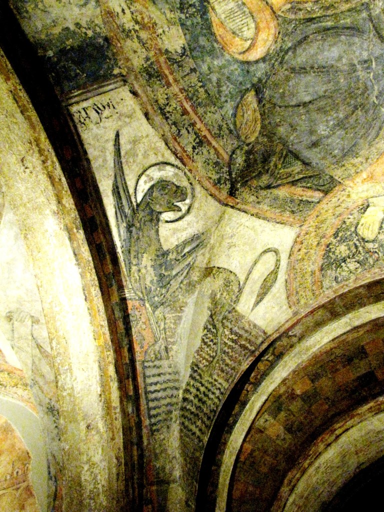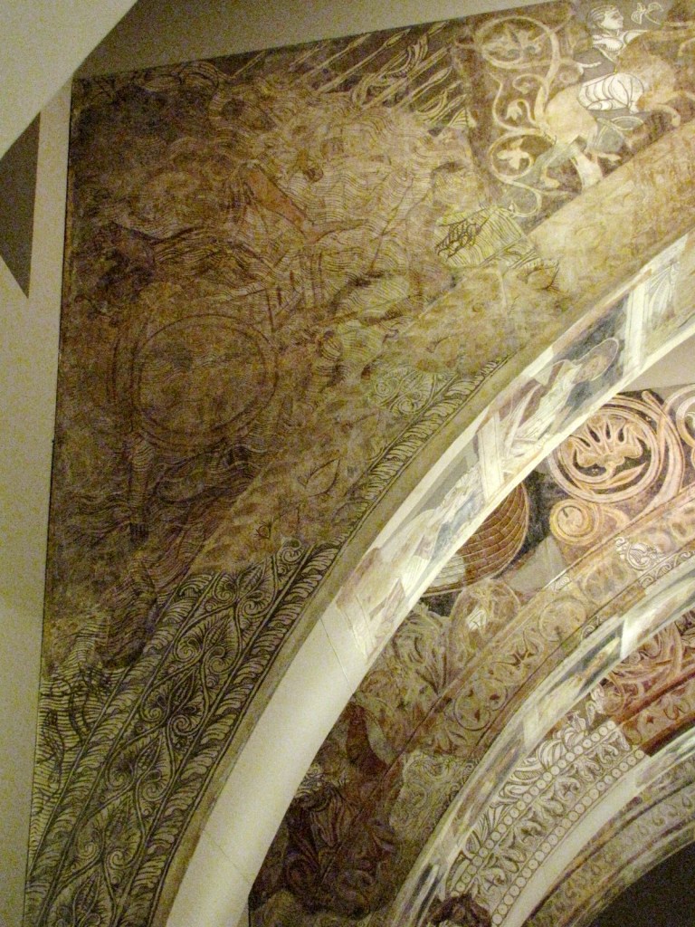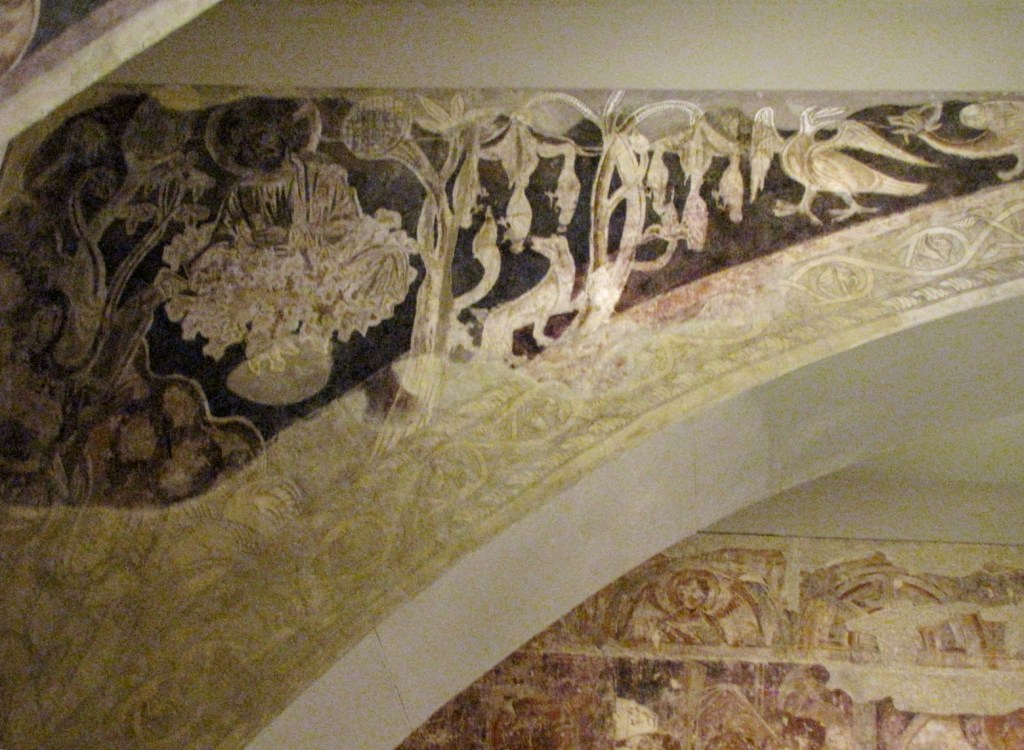 Na ścianach zewnętrznych kapitularza przedstawione były sceny ze Starego i Nowego Testamentu; szczególnie te ostatnie uległy silnemu zniszczeniu podczas pożaru. Sufit artesonado wsparty był na pięciu łukach, których wewnętrzne strony ozdobiono portretami mającymi przedstawiać przodków Jezusa, zgodnie z genealogiami podanymi w Ewangeliach Mateusza i Łukasza, a pachy łuków pokryte zostały ornamentami roślinnymi, z umieszczonymi wśród nich zwierzętami znanymi z biestiariuszy z miniatur angielskich. Podobieństwo do tych miniatur jest tak duże, że sugeruje nawet możliwość ich wykonania przez angielski warsztat wędrowny. Natomiast niewielka kwadratowa sala, położona pomiędzy kościołem a klasztorem, udekorowana była fryzem biegnącym wokoło na szczycie ściany, na którym, inaczej niż w kapitularzu, przedstawiono sceny z życia dworskiego. Wpływy bizantyńskie w tych freskach, przejawiają się w potraktowaniu twarzy na portretach, w modelowaniu figur i fałdach stroju cieniowanych kolorem, a także w kompozycji scen.