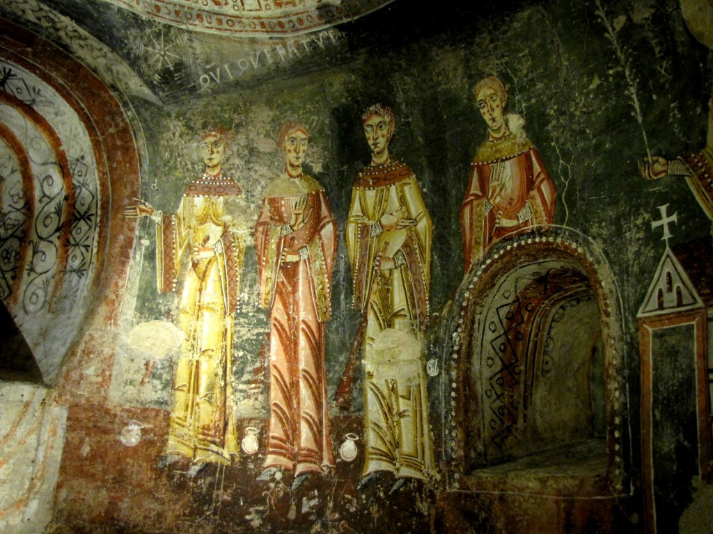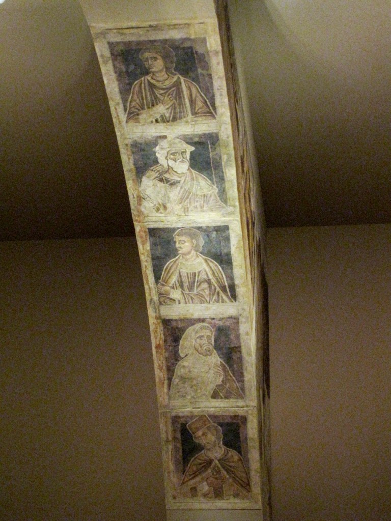 W środkowym registrze absydy widnieją postacie świętych poprzedzielane wąskimi, romańskimi oknami, których nisze wypełniają wzory roślinne, natomiast pomiędzy registrami przebiegają ozdobne fryzy geometryczne, a występujący w nich motyw korony wskazuje na lombardzki rodowód.