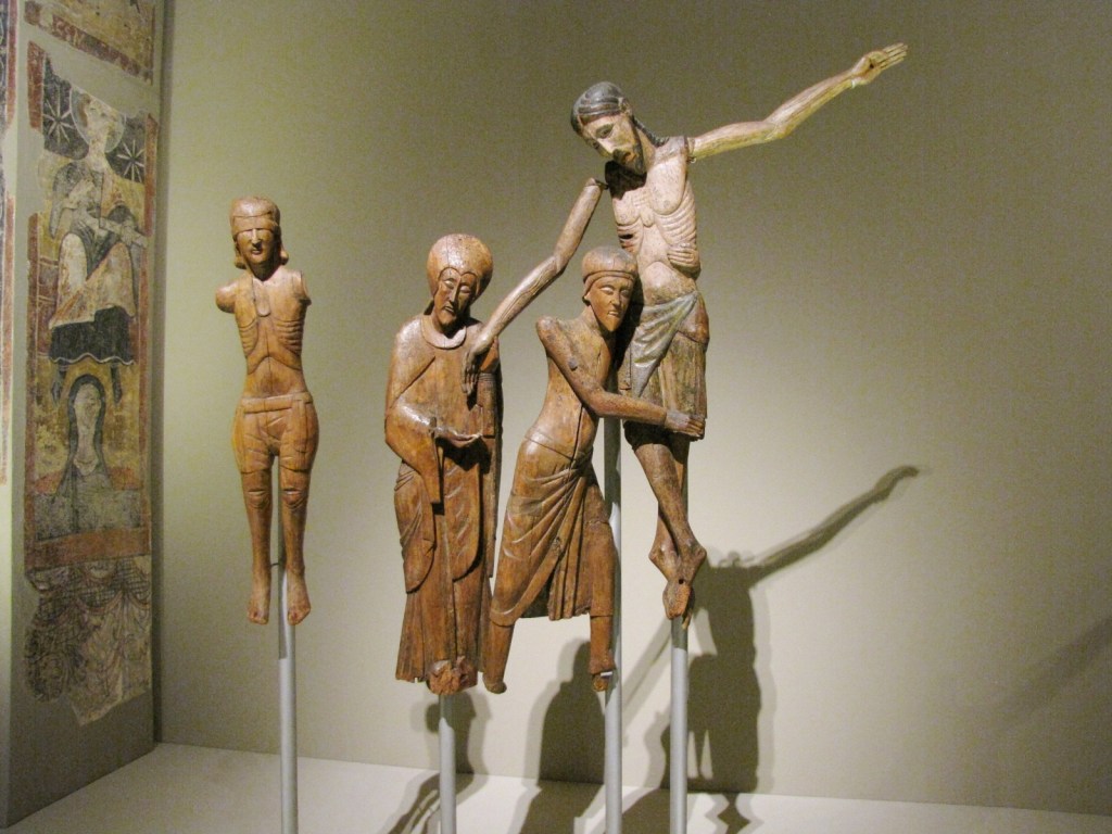 Charakterystycznymi katalońskimi grupami rzeźbiarskimi z tego okresu są sceny Zdjęcia z Krzyża, umieszczane w kościołach na belce tęczowej ponad głównym ołtarzem. W ich skład wchodziło na ogół siedem postaci: obok Nikodema i Józefa z Arymatei zdejmujących Ciało Chrystusa z Krzyża widniały figury Maryi i Św. Jana, oraz dwóch łotrów, ukrzyżowanych po obu stronach. Wydaje się, że warsztat rzeźbiarski wykonujący takie grupy rzeźbiarskie mógł znajdować się w okolicach doliny Boì i został umownie nazwany warsztatem z Erill la Vall, gdyż z kościoła Santa Eulalia z tej miejscowości pochodzi najstarsza ze wspomnianych grup, datowana na drugą połowę XII w. Figury Maryi i Św. Jana, z tej grupy, wystawione w MNAC oznaczają się wysokim poziomem artystycznym i starannym dopracowaniem szczegółów; zachowały się na nich jedynie ślady polichromii. Prawie identyczna figura Matki Boskiej pochodzi z kościoła Santa Maria z pobliskiego Durro, w szczególności ma na głowie taki sam ozdobny czepiec. Niewątpliwie z tego samego warsztatu, i również z XII w., pochodzą cztery postacie z grupy Zdjęcia z Krzyża z kościoła Santa Maria w Boi, które wywierają duże wrażenie, ustawione w MNAC zgodnie z domniemanym rozmieszczeniem oryginalnym.