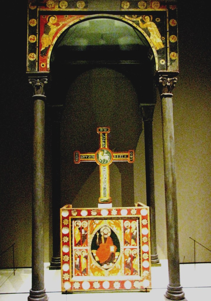 Efektowny zestaw Wystawiony w Muzeum, złożony z ołtarza i rozpostartego nad nim baldachimu, wspartego na drewnianych kolumnach, składa się z elementów pochodzących z różnych obiektów, znakomicie dobranych do siebie pod względem stylistycznym. Osłony ołtarza – fronton i ścianki boczne – pochodzą z kościoła Sant Roma w Encamp, w Andorze, natomiast pachy łuków wspierających baldachim należały kiedyś do baldachimu z kościoła San Cristofol w Toses. Jednak wszystkie te elementy wykonane zostały najpewniej w warsztacie katedralnym w Urgell, w latach 1200-1233. Fronton ołtarza obramowany jest bogatą bordiurą z polichromowanego stiuku, z dużymi rozetami i guzami wymodelowanymi przy użyciu sztanc, a wnętrze podzielono na kwatery wytłaczanymi pasmami stiuku. W kwaterach tych tradycyjnie figuruje Chrystus błogosławiący, w mandorli, otoczony tetramorfą, z postaciami świętych, po bokach.