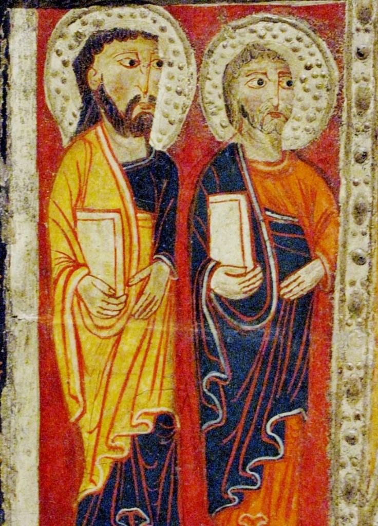Błękitne tło pięknych figur apostołów Tadeusza i Jakuba, z kościoła San Pere z Àger uzyskano przy użyciu farby z importowanego azurytu.