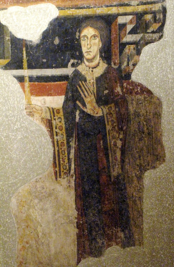 W dolnym registrze absydy z kościoła Sant Pere z Burgal zachował się szczęśliwie wizerunek donatorki, a towarzysząca mu inskrypcja, pozwoliła zidentyfikować ją jako Łucję hrabinę de Palares, a sam fresk datować na lata osiemdziesiąte jedenastego wieku. Hrabina, o bardzo hiszpańskim typie urody, z pociągłą twarzą i wielkimi patrzącymi na wprost oczami, ma na sobie paradną suknię, z szerokimi rękawami obrzeżonymi haftem; w prawym ręku trzyma zapaloną gromnicę, a lewą otwartą dłoń wysuwa do przodu.