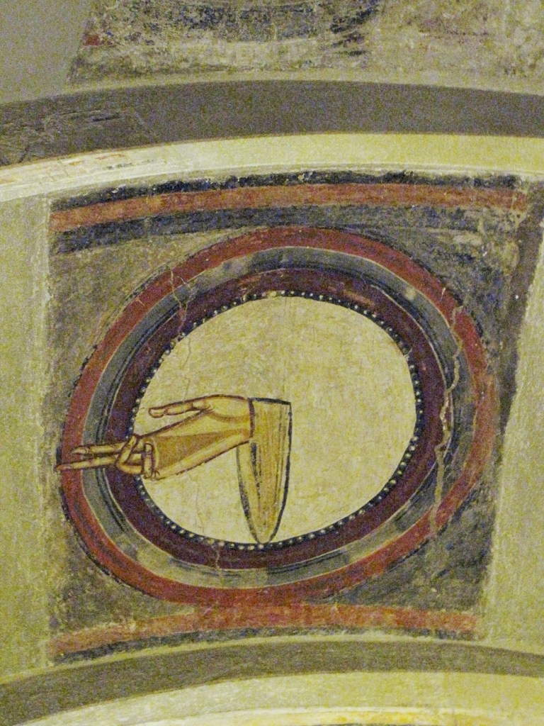 Wystrój środkowej absydy kościoła San Climent stanowi całkowite odejście od stylu narracyjnego i trójwymiarowego modelowania postaci, zapożyczonego z Lombardii. Postać tronującego Chrystusa-Pantokratora, dominująca w konsze absydy, jest uosobieniem majestatu i dostojeństwa, pozbawionym jednak surowości. Prawą rękę ma wzniesioną do góry w geście błogosławieństwa, a w lewej dzierży księgę otwartą na słowach EGO SUM LUX MUNDI. Wewnątrz mandorli otaczającej postać Chrystusa dominują zimne niebieskości szaty i tła, z białymi plamami aureoli i księgi, kontrastujące z ciepłą czerwienią i ochrą, barwami, w jakich utrzymane są symbole Ewengelistów i postacie aniołów, wypełniające wolną przestrzeń wokół mandorli. Podobna gra kolorystyczna charakteryzuje również fryz figuralny w cylindrze absydy. Mistrzowsko skomponowany wystrój całej absydy podzielony jest na poziome pasy. Anioły i symbole ewangelistów, wkomponowane w okręgi, tworzą poziomy fryz w dolnej części konchy i nadają mu formę falistą. Falistość ta powtarza się we fryzie figuratywnym we wnętrzu cylindra absydy, nadawana zarysem łuków i rytmem nimbów wokół głów postaci świętych. Na białym tle nimbów rysują się wyraźnie ich zróżnicowane uczesania. Szczególnie wyszukaną formę geometryczną przybiera zarys twarzy Madonny, otulonej białym czepcem.