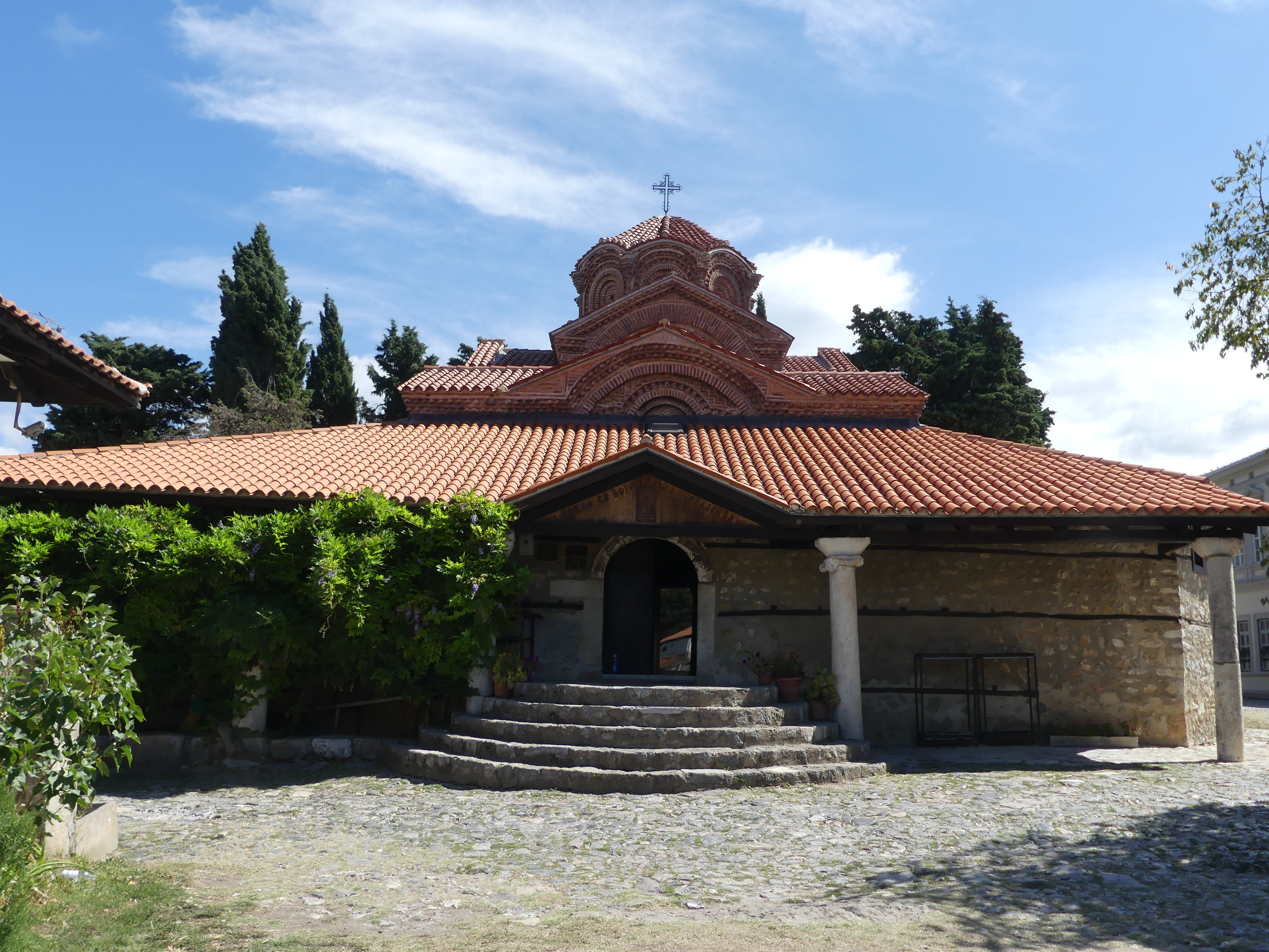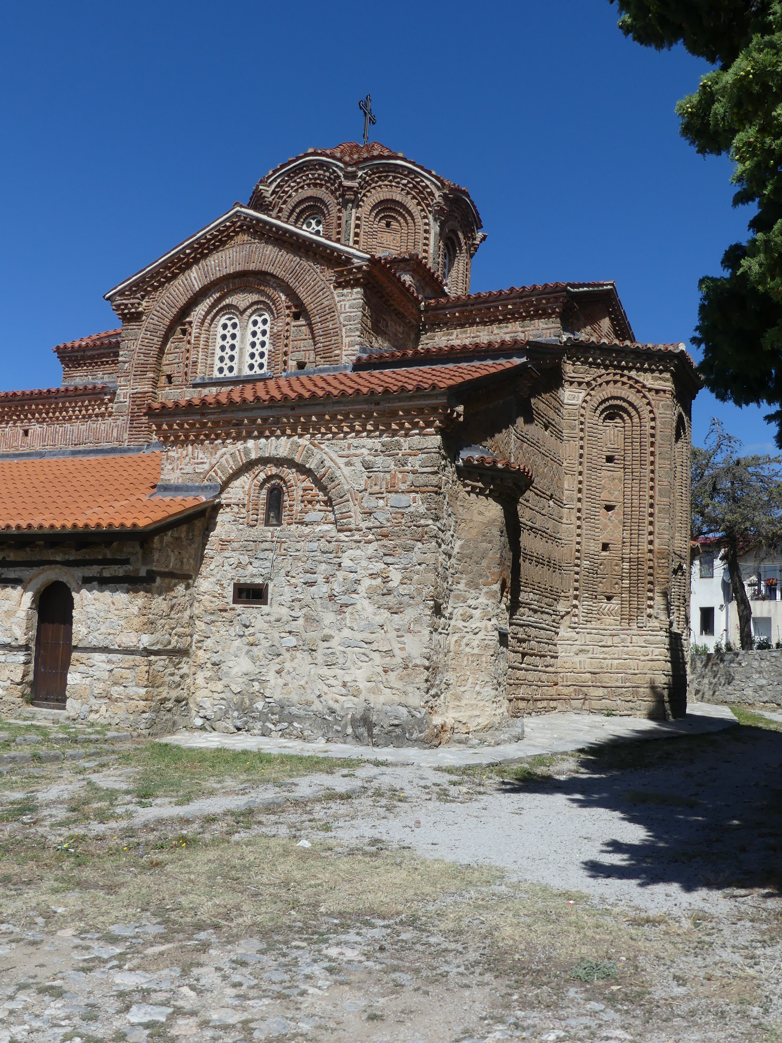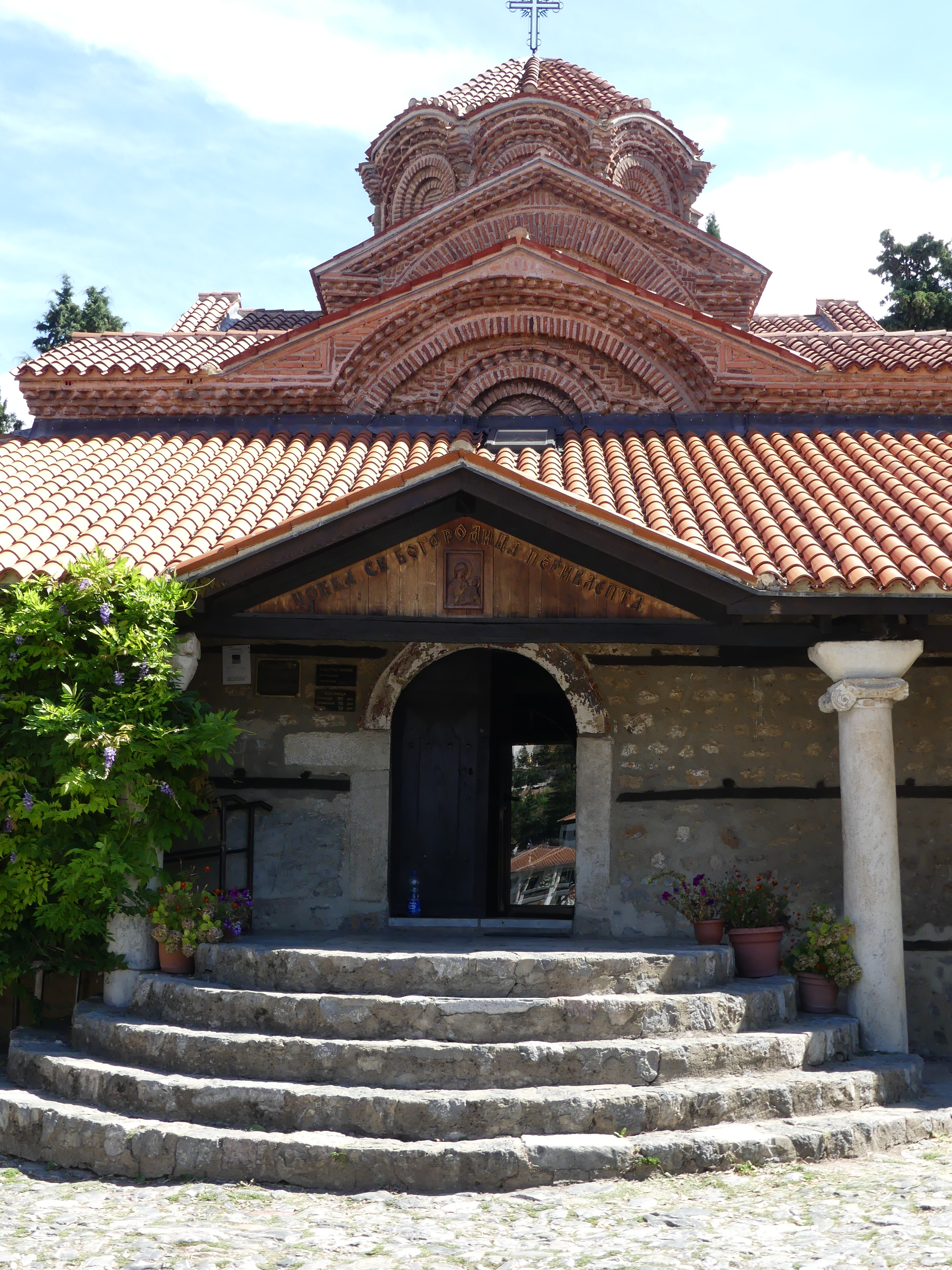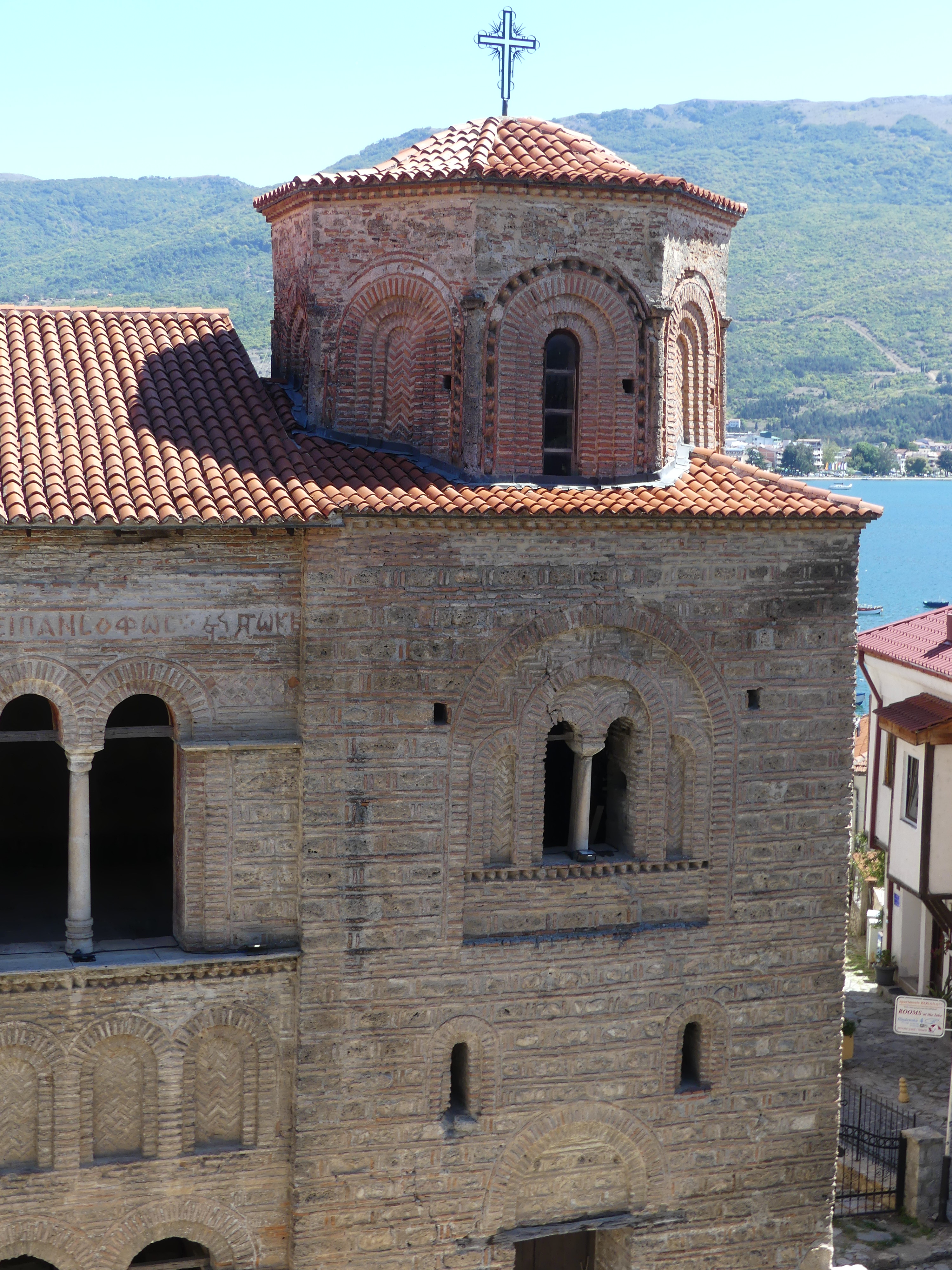 Pod tym względem zdecydowanie najciekawsze są dwie inne cerkwie: Sobór Św. Zofii i cerkiew pod wezwaniem św. Klimenta, ucznia Cyryla i Metodego, osiadłego w Ochrydzie, gdzie założył szkołę, która w dużym stopniu przyczyniła się do rozwoju języka i piśmiennictwa starosłowiańskiego. Niestety w Macedonii funkcjonuje zakaz fotografowania fresków i obrazów w cerkwiach, co jest w pełni uzasadnione przy korzystaniu z flesza, ale nie zrozumiałe, jeśli się go nie używa. Stosunek do tego   zakazu bywa mniej lub bardziej liberalny: u Św. Zofii patrzono przez palce na robienie zdjęć, natomiast u Św. Klimenta o mało nie zostałem wyrzucony za próbę fotografowania i udało mi się zrobić tylko jedno zdjęcie wewnętrznego wystroju,  przez oszklone drzwi. A szkoda bo we wnętrzu cerkwi Św. Klimena, wzniesionej na przełomie XIII i XIV wieku, zachował się w świetnym stanie kompletny zespół fresków z tego samego okresu, wykonany w stylu bizantyńskiego renesansu Paleologów, którym,  zachwyciłem się, swojego czasu,  w konstantynopolitańskim Kościele Zbawiciela na Chorze.