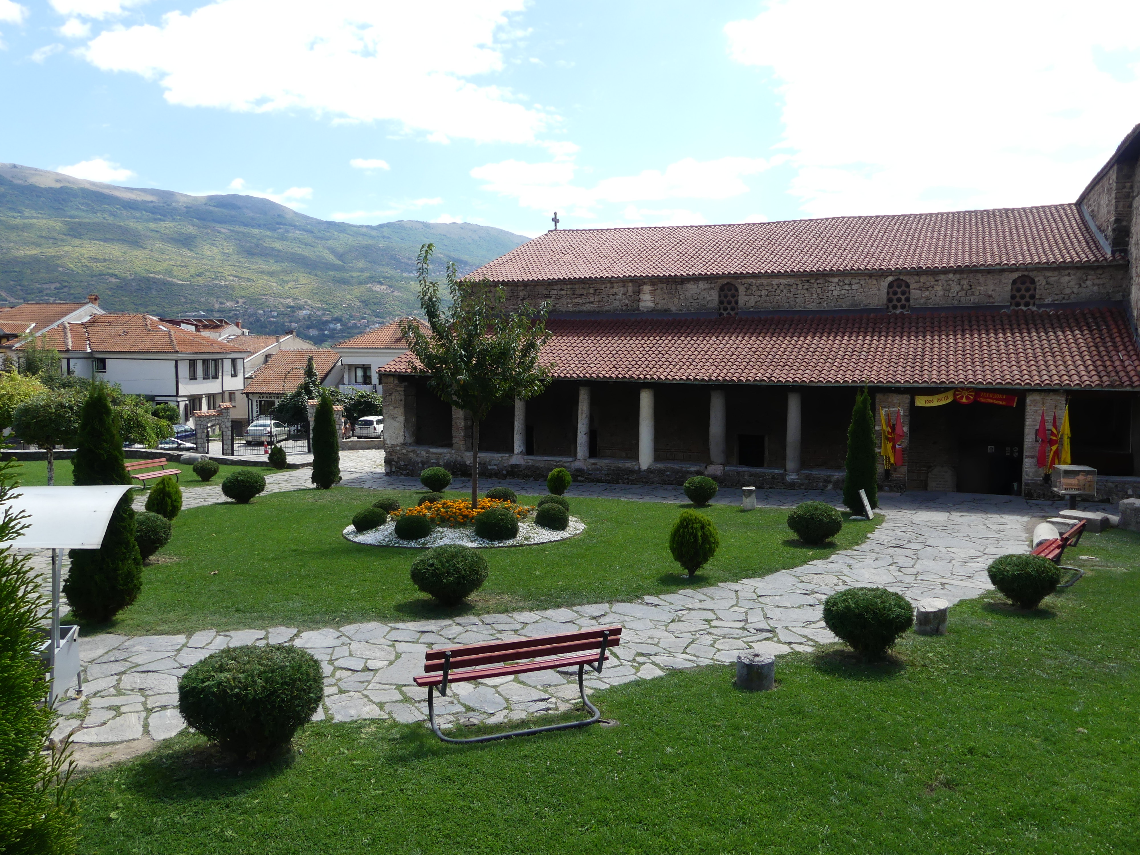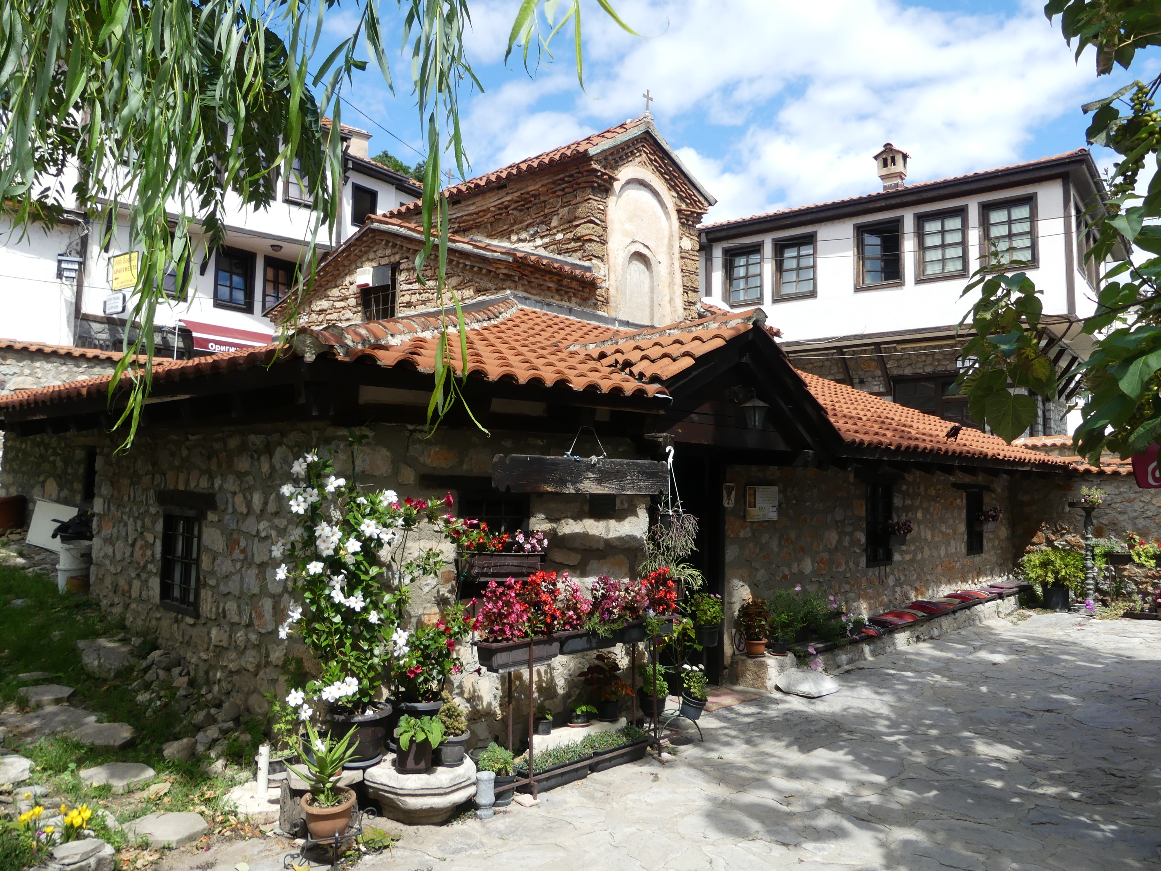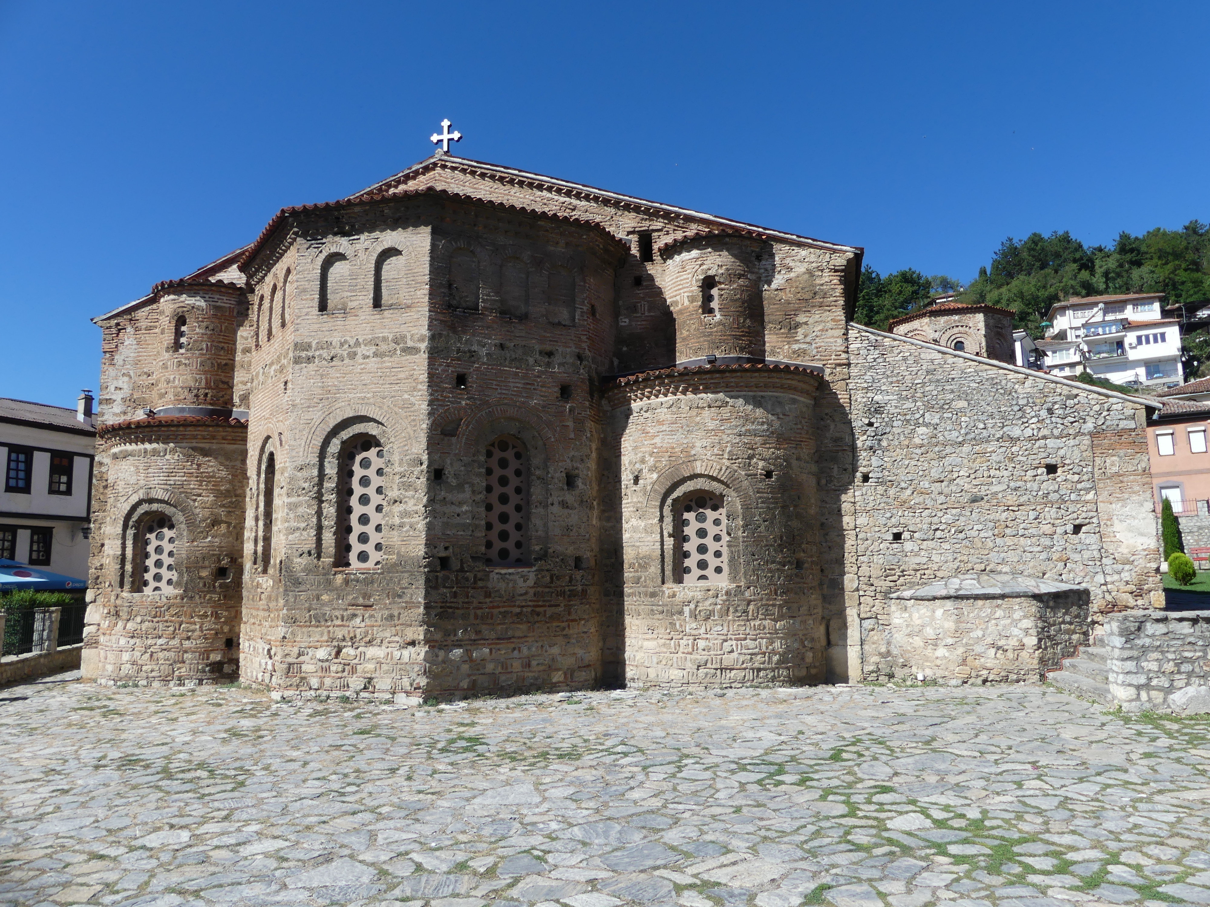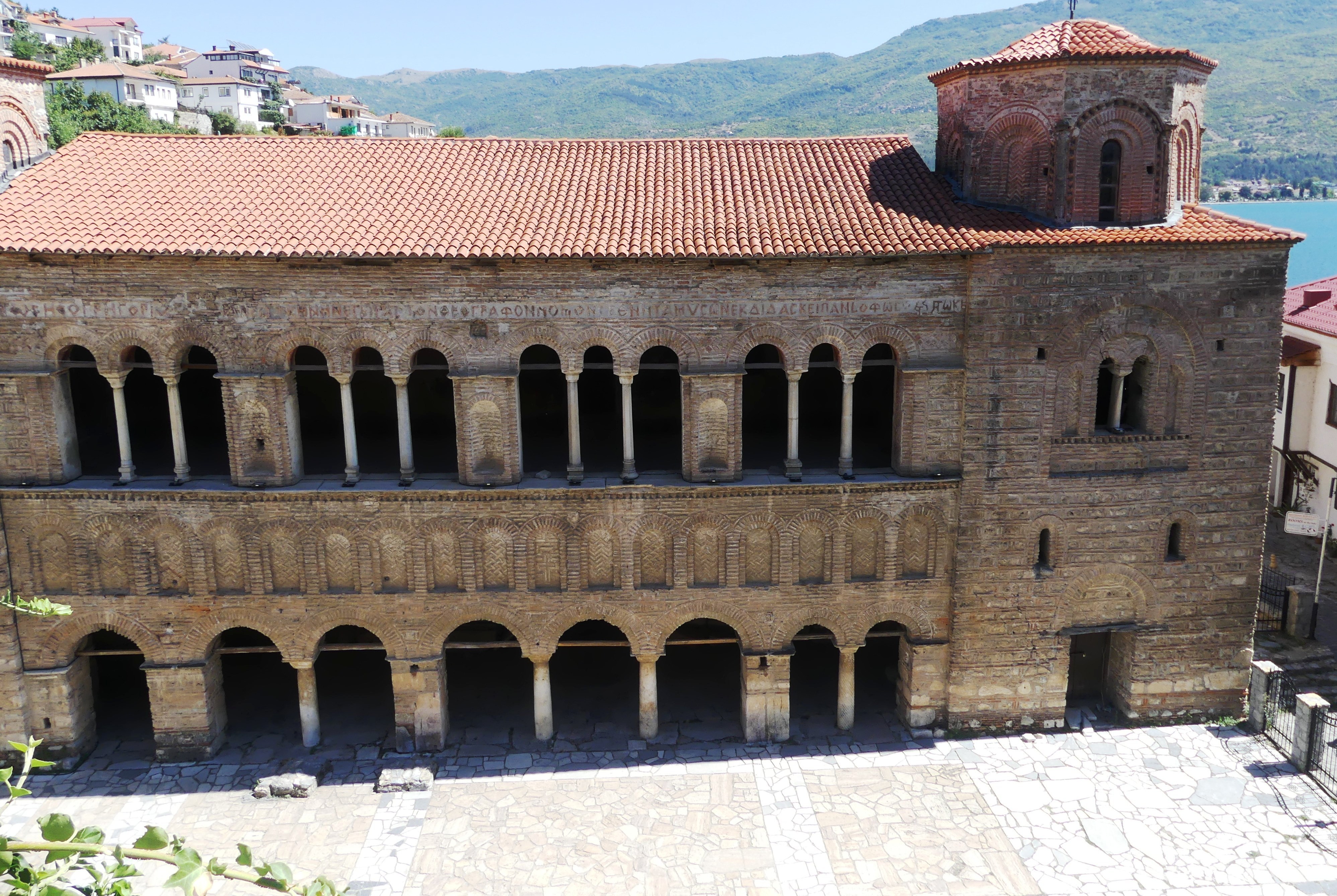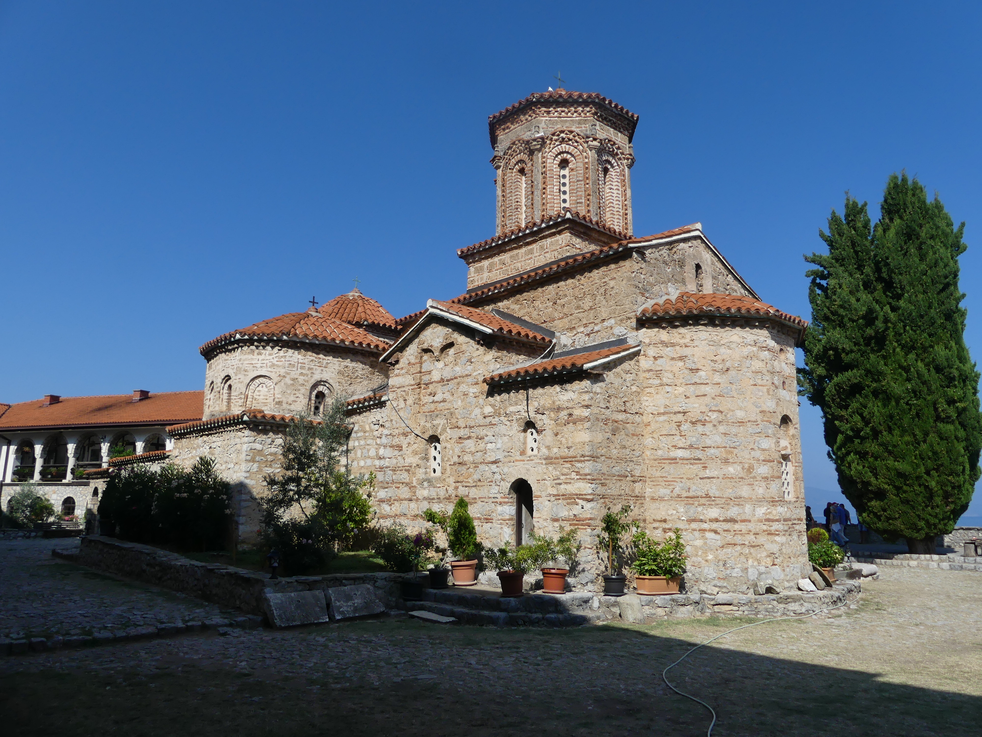 Pod tym względem zdecydowanie najciekawsze są dwie inne cerkwie: Sobór Św. Zofii i cerkiew pod wezwaniem św. Klimenta, ucznia Cyryla i Metodego, osiadłego w Ochrydzie, gdzie założył szkołę, która w dużym stopniu przyczyniła się do rozwoju języka i piśmiennictwa starosłowiańskiego. Niestety w Macedonii funkcjonuje zakaz fotografowania fresków i obrazów w cerkwiach, co jest w pełni uzasadnione przy korzystaniu z flesza, ale nie zrozumiałe, jeśli się go nie używa. Stosunek do tego   zakazu bywa mniej lub bardziej liberalny: u Św. Zofii patrzono przez palce na robienie zdjęć, natomiast u Św. Klimenta o mało nie zostałem wyrzucony za próbę fotografowania i udało mi się zrobić tylko jedno zdjęcie wewnętrznego wystroju,  przez oszklone drzwi. A szkoda bo we wnętrzu cerkwi Św. Klimena, wzniesionej na przełomie XIII i XIV wieku, zachował się w świetnym stanie kompletny zespół fresków z tego samego okresu, wykonany w stylu bizantyńskiego renesansu Paleologów, którym,  zachwyciłem się, swojego czasu,  w konstantynopolitańskim Kościele Zbawiciela na Chorze.