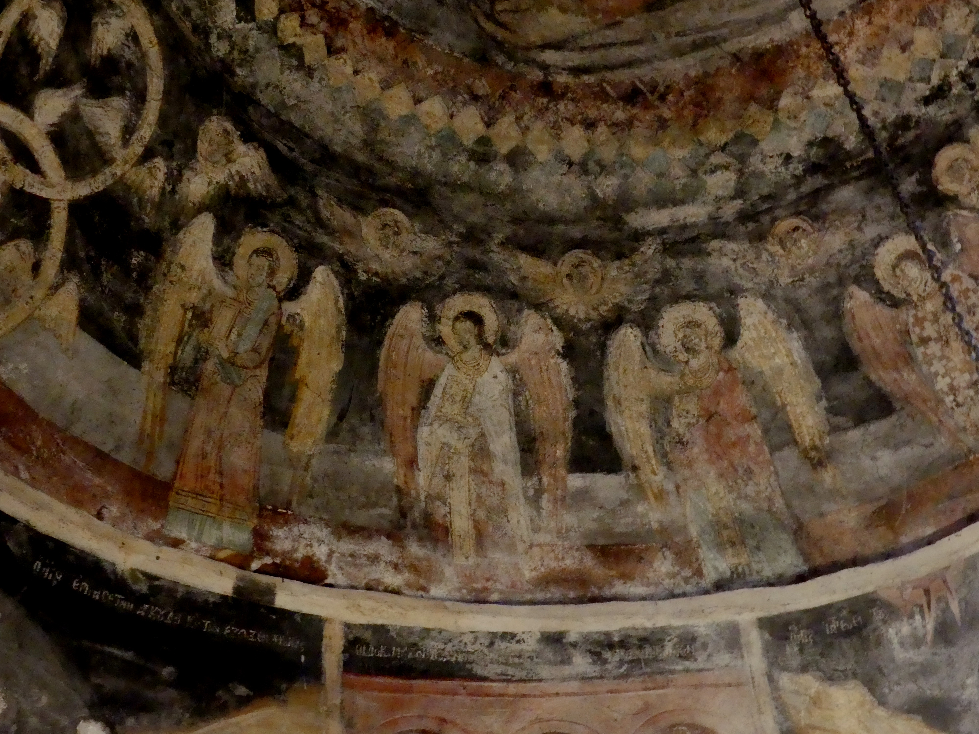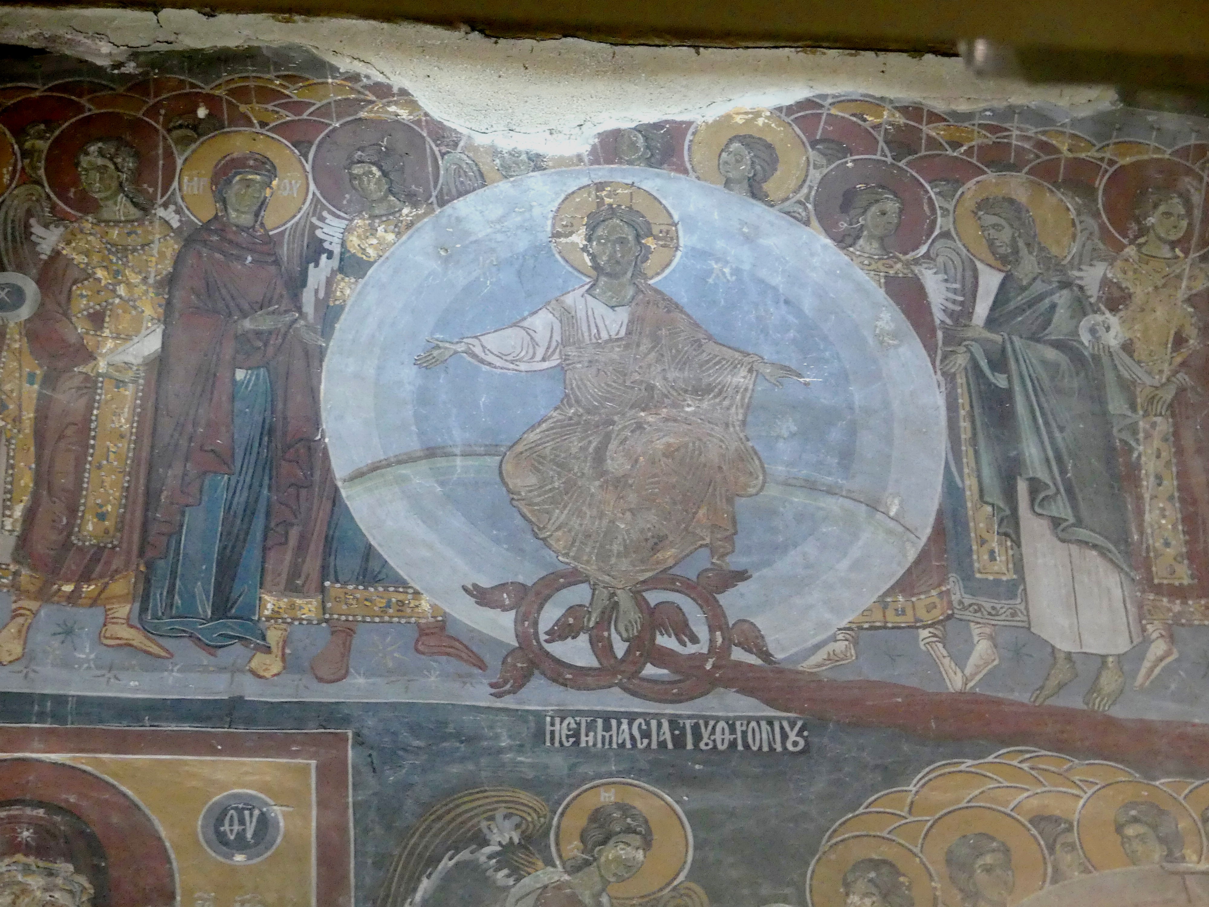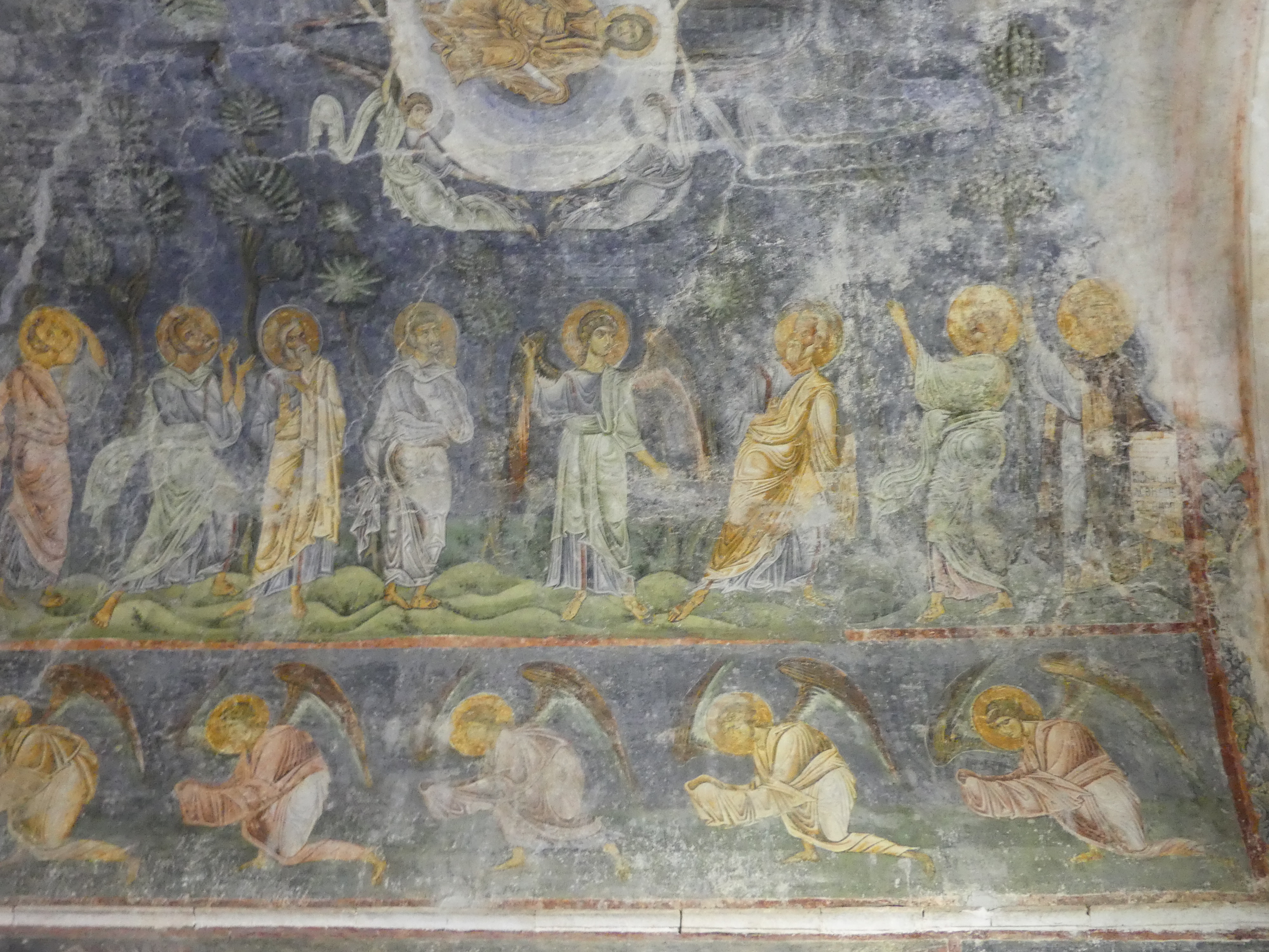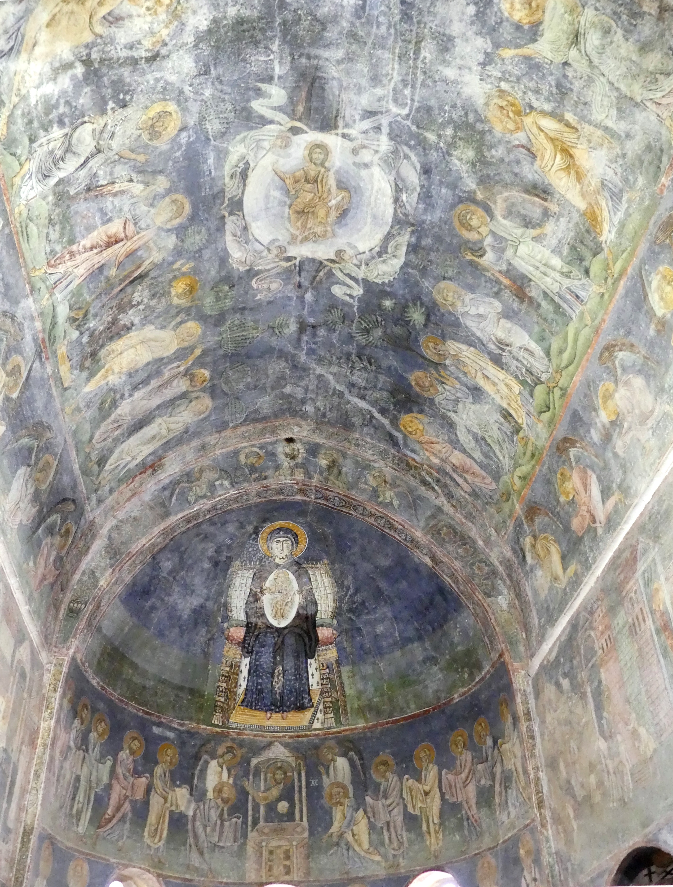 Podczas wielowiekowej okupacji tureckiej sobór został zamieniona na meczet, ale na szczęście znaczna część fresków z XI-XIII w. zachowała się, przykryta warstwą tynku. Stanowią one na prawdę wyjątkowo piękny zespół, namalowany delikatnymi pastelowymi barwami. W konsze absydy zasiada na tronie Madonna z Dzieciątkiem na piersiach, a na fryzie poniżej, Chrystus rozdaje Komunię Apostołom, którzy zbliżają się do Niego rzędami z obu stron. Wszystko to na tle szarobłękitnego nieba, z pasem przełamanej zieleni symbolizującym ziemię . Na szczycie kolebkowego sklepienia przykrywającego prezbiterium, pełen majestatu  Chrystus, w złocistej szacie – otoczony delikatną niebiesko-szarą mandorlą, podtrzymywaną przez anioły – błogosławi Apostołów, którzy asystują przy  Jego Wniebowstąpieniu, w postawach wyrażających zdumienie i olśnienie, uszeregowani wzdłuż osi sklepienia, na łące przypominającej pofalowane morze, z ciemnymi sylwetkami stylizowanych drzew rysującymi się na tle nieba. Delikatne seledynowe pasmo łąki oddziela  biegnący poniżej fryz z aniołami, klęczącymi  w pozie adoracji. Na szaroniebieskim tle – identycznym jak niebo u góry – ciemne  brzegi skrzydeł anielskich kreślą regularne półokręgi, układające się w falisty szlak geometryczny.