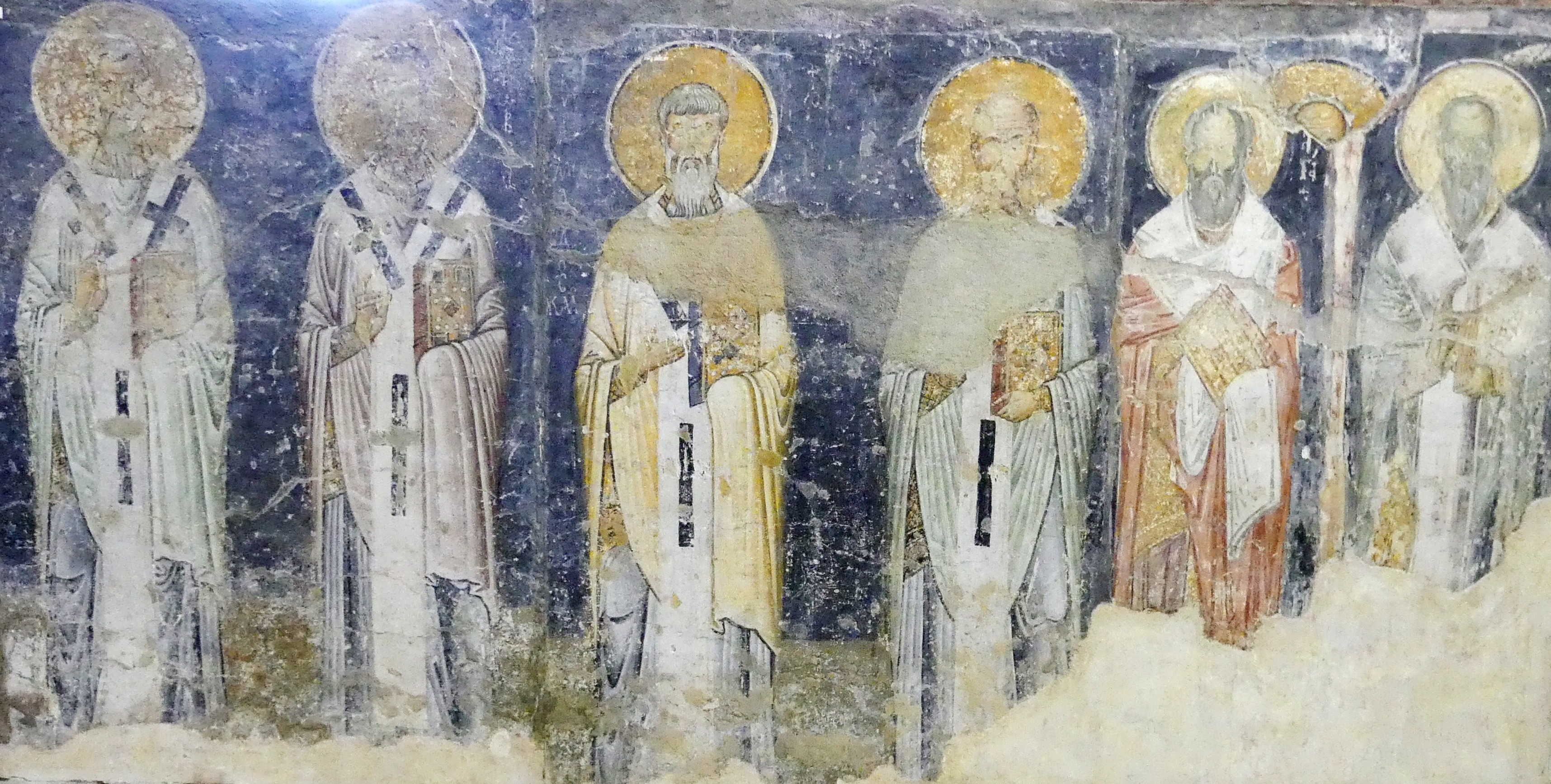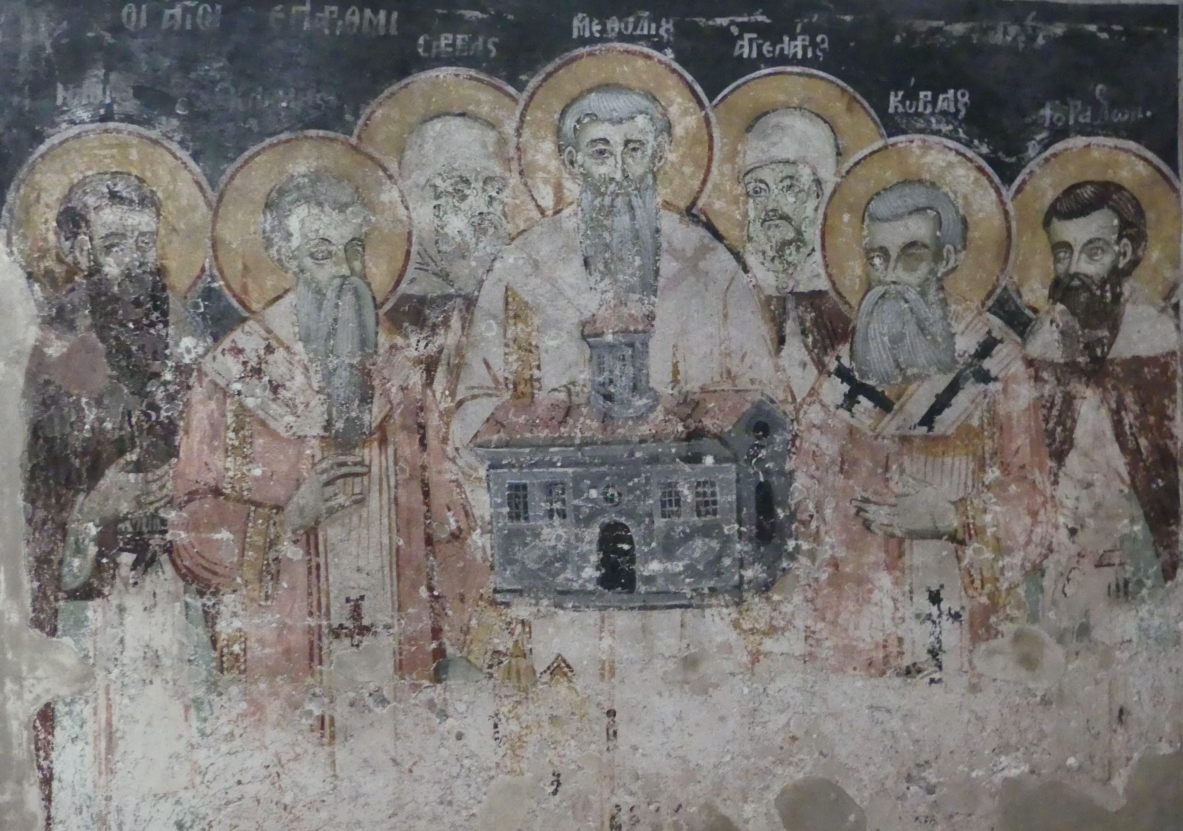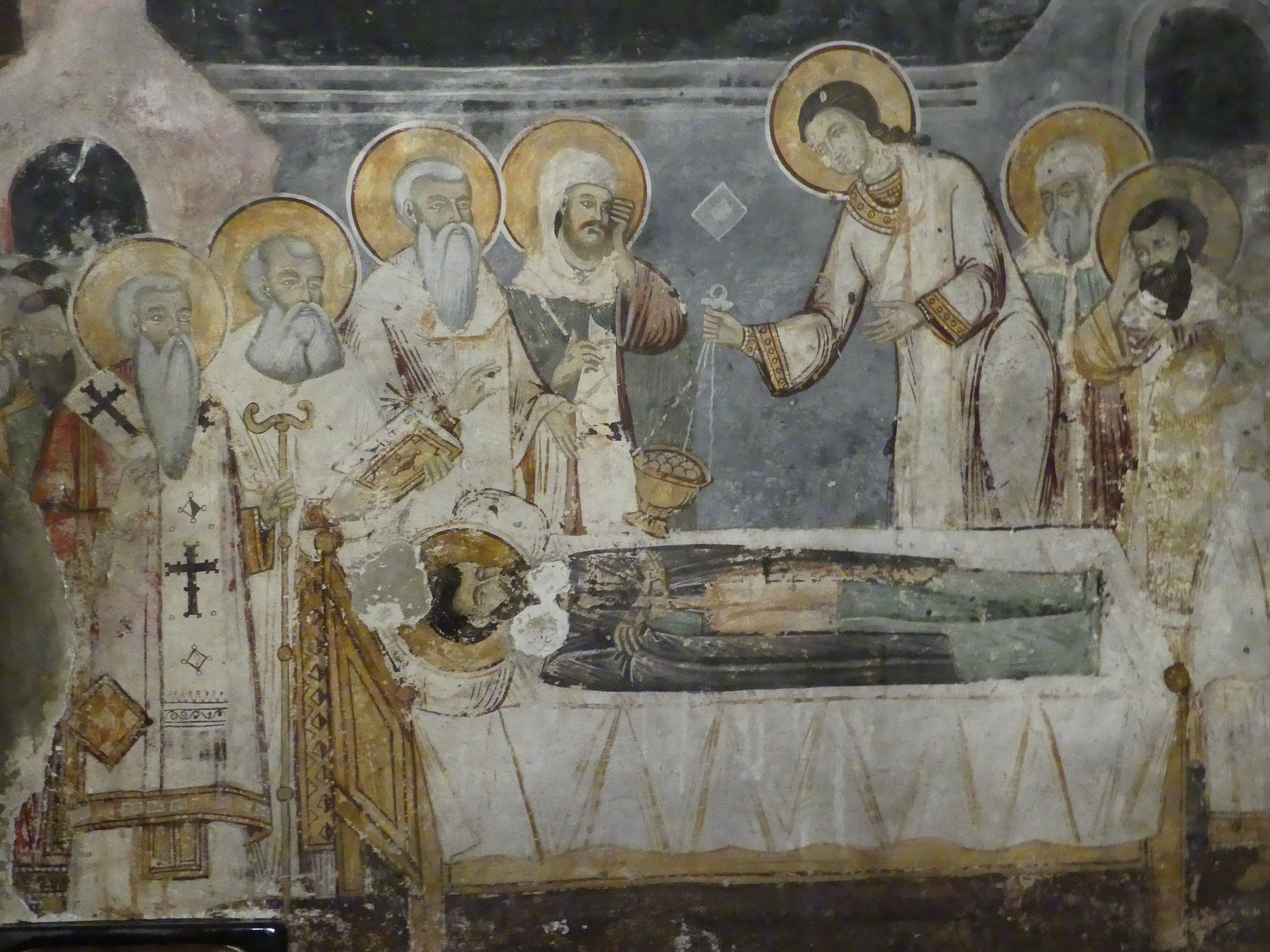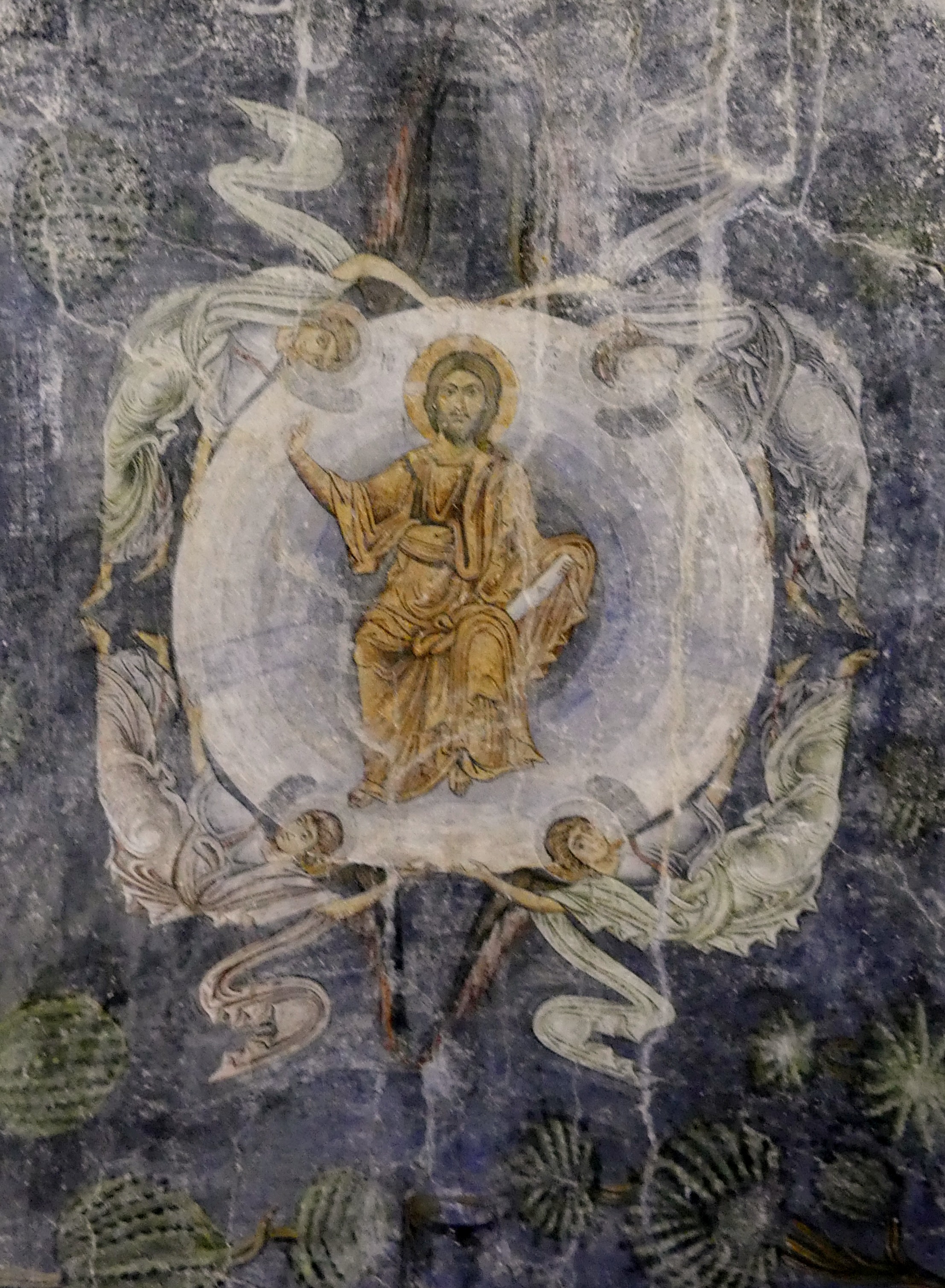Podczas wielowiekowej okupacji tureckiej sobór został zamieniona na meczet, ale na szczęście znaczna część fresków z XI-XIII w. zachowała się, przykryta warstwą tynku. Stanowią one na prawdę wyjątkowo piękny zespół, namalowany delikatnymi pastelowymi barwami. W konsze absydy zasiada na tronie Madonna z Dzieciątkiem na piersiach, a na fryzie poniżej, Chrystus rozdaje Komunię Apostołom, którzy zbliżają się do Niego rzędami z obu stron. Wszystko to na tle szarobłękitnego nieba, z pasem przełamanej zieleni symbolizującym ziemię . Na szczycie kolebkowego sklepienia przykrywającego prezbiterium, pełen majestatu  Chrystus, w złocistej szacie – otoczony delikatną niebiesko-szarą mandorlą, podtrzymywaną przez anioły – błogosławi Apostołów, którzy asystują przy  Jego Wniebowstąpieniu, w postawach wyrażających zdumienie i olśnienie, uszeregowani wzdłuż osi sklepienia, na łące przypominającej pofalowane morze, z ciemnymi sylwetkami stylizowanych drzew rysującymi się na tle nieba. Delikatne seledynowe pasmo łąki oddziela  biegnący poniżej fryz z aniołami, klęczącymi  w pozie adoracji. Na szaroniebieskim tle – identycznym jak niebo u góry – ciemne  brzegi skrzydeł anielskich kreślą regularne półokręgi, układające się w falisty szlak geometryczny.