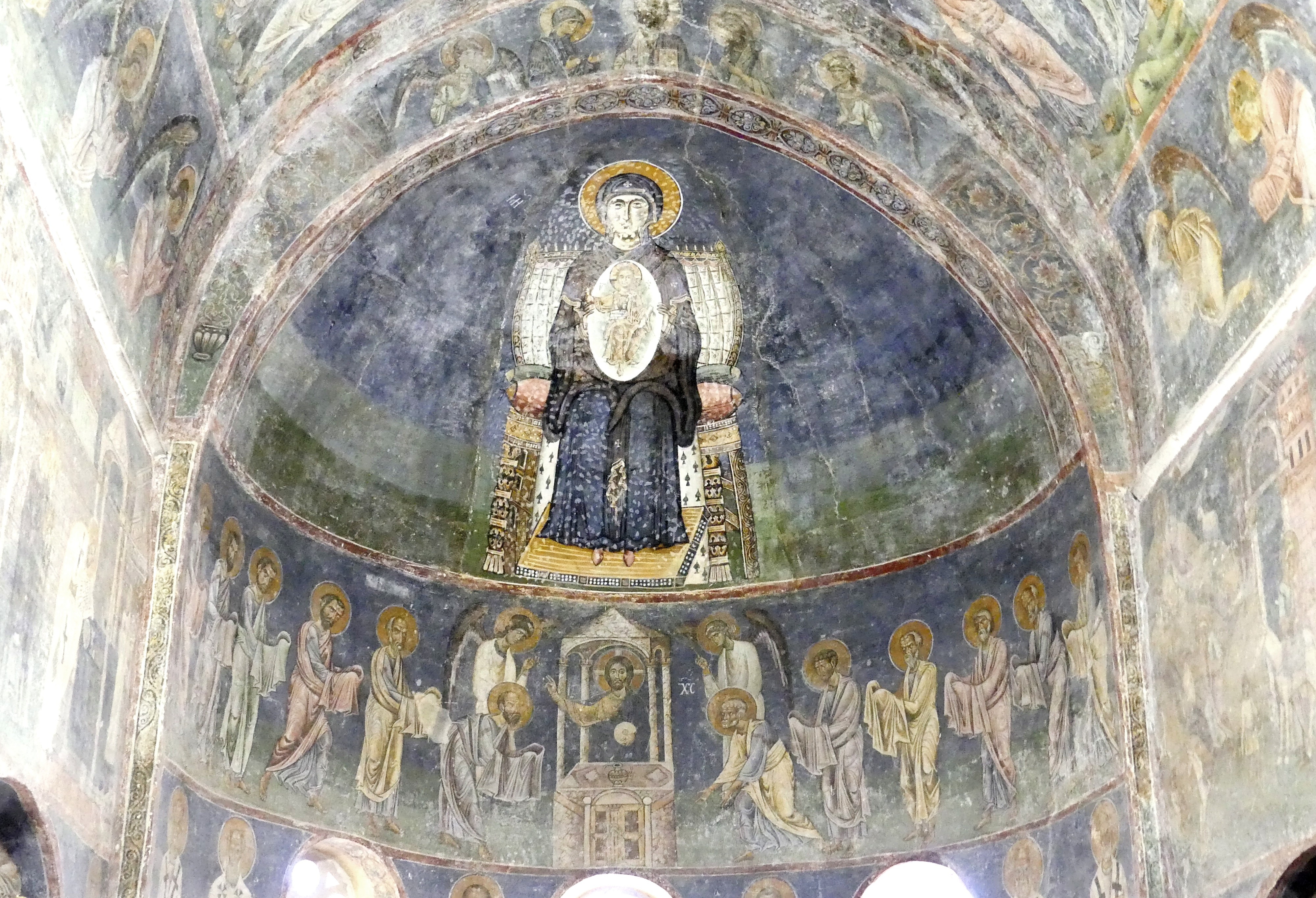 Podobnie jak u Św. Zofii, i tu, w konsze absydy widnieje wizerunek tronującej Madonny z Dzieciątkiem na kolanach, którą po bokach  adorują dwaj aniołowie, w postawie pełnej czci i gracji, z rozwianymi szatami. Poniżej dwa rzędy wiotkich postaci Ojców Kościoła, pochylają się w ukłonie ku Madonnie, z rozwiniętymi zwojami pergaminowymi w rekach. W przeciwieństwo do delikatnego szaroniebieskiego tła u Św. Zofii, tu ma ono piękny ciemnobłękitny odcień wieczornego, bezgwiezdnego nieba, z którym kontrastują złociste aureole postaci, oraz białe bizantyńskie ornaty Ojców Kościoła.