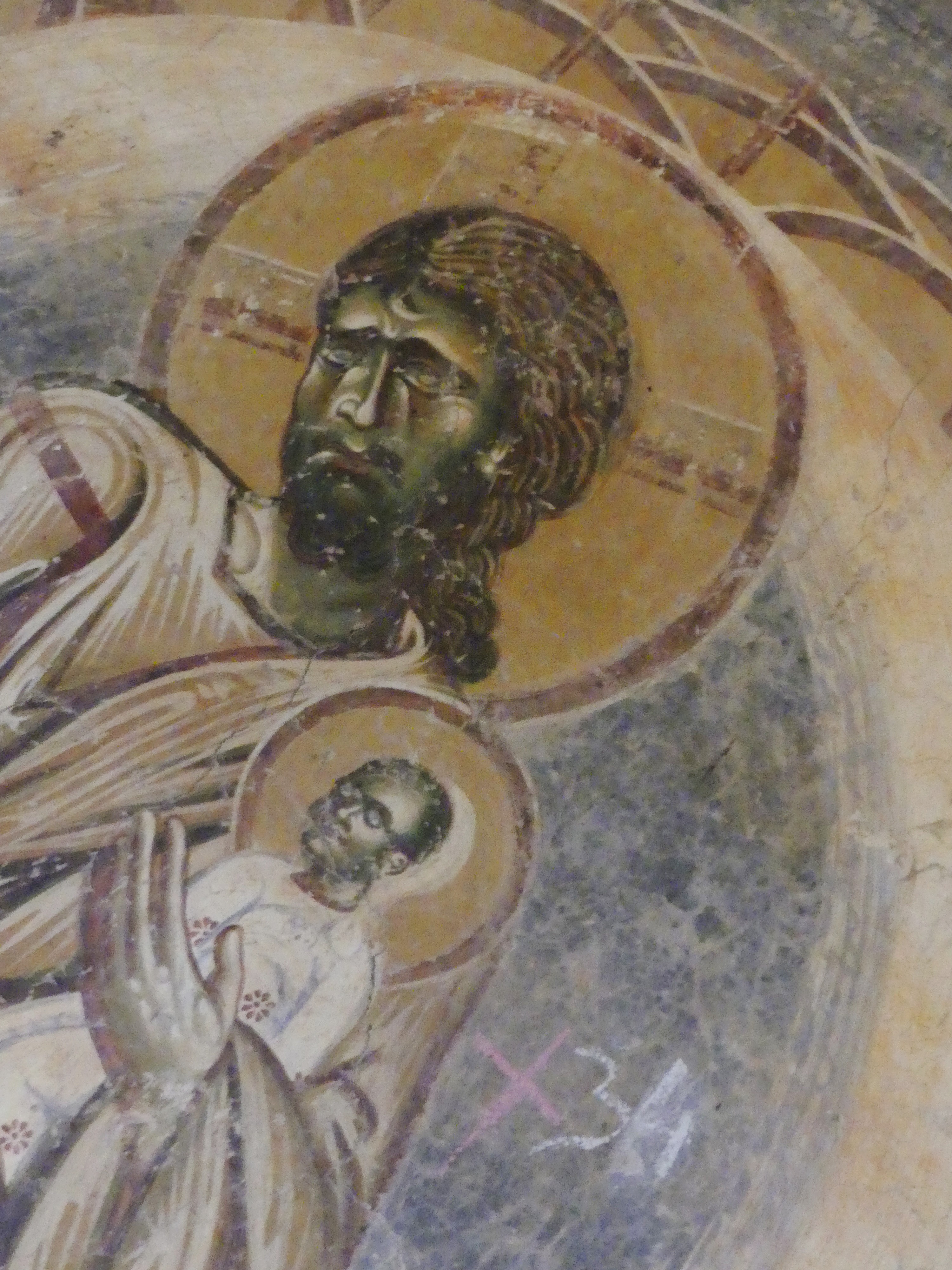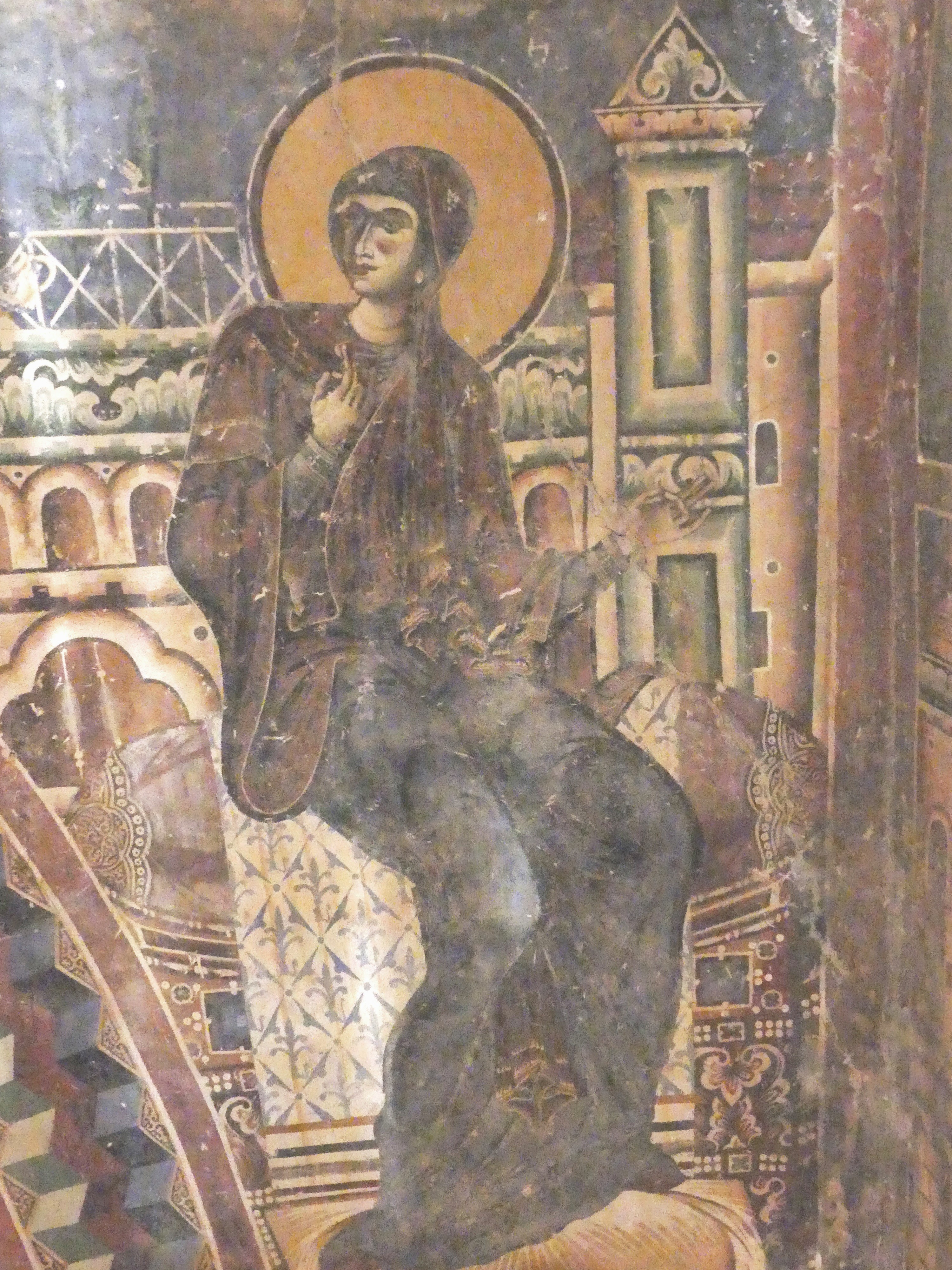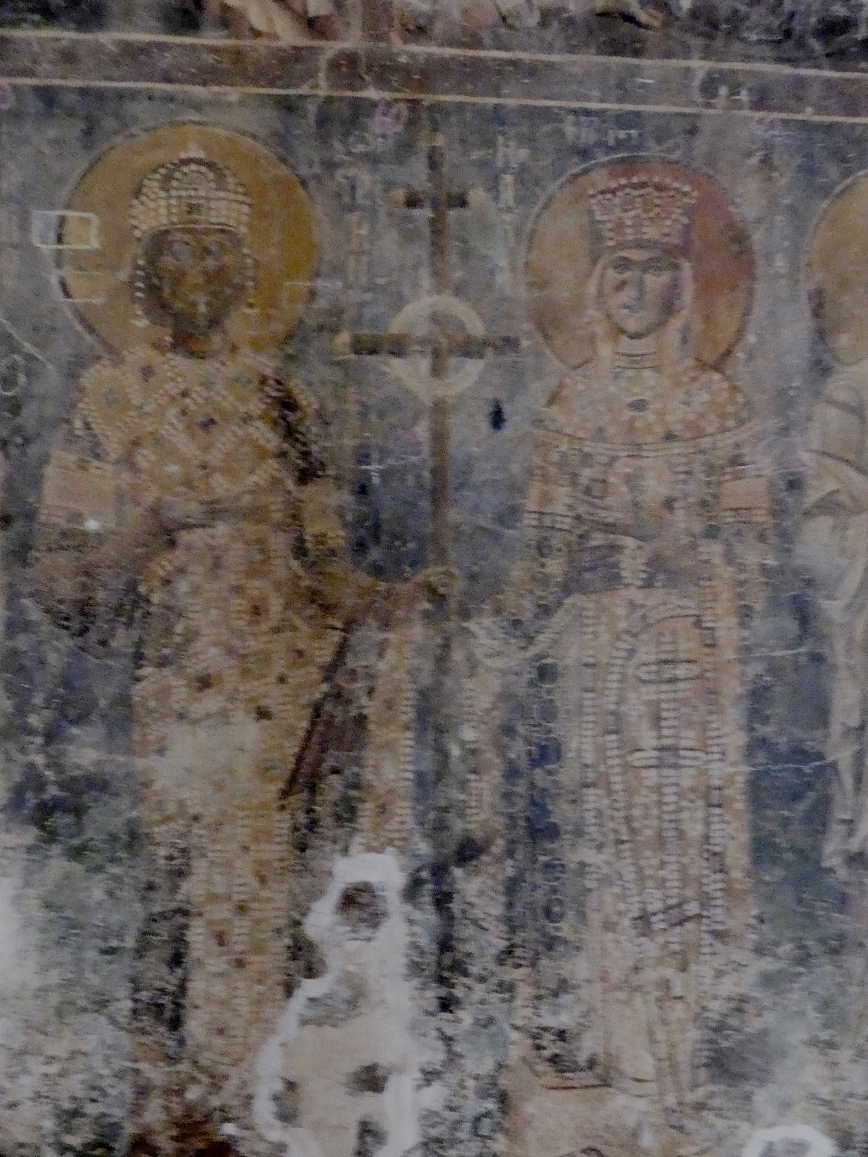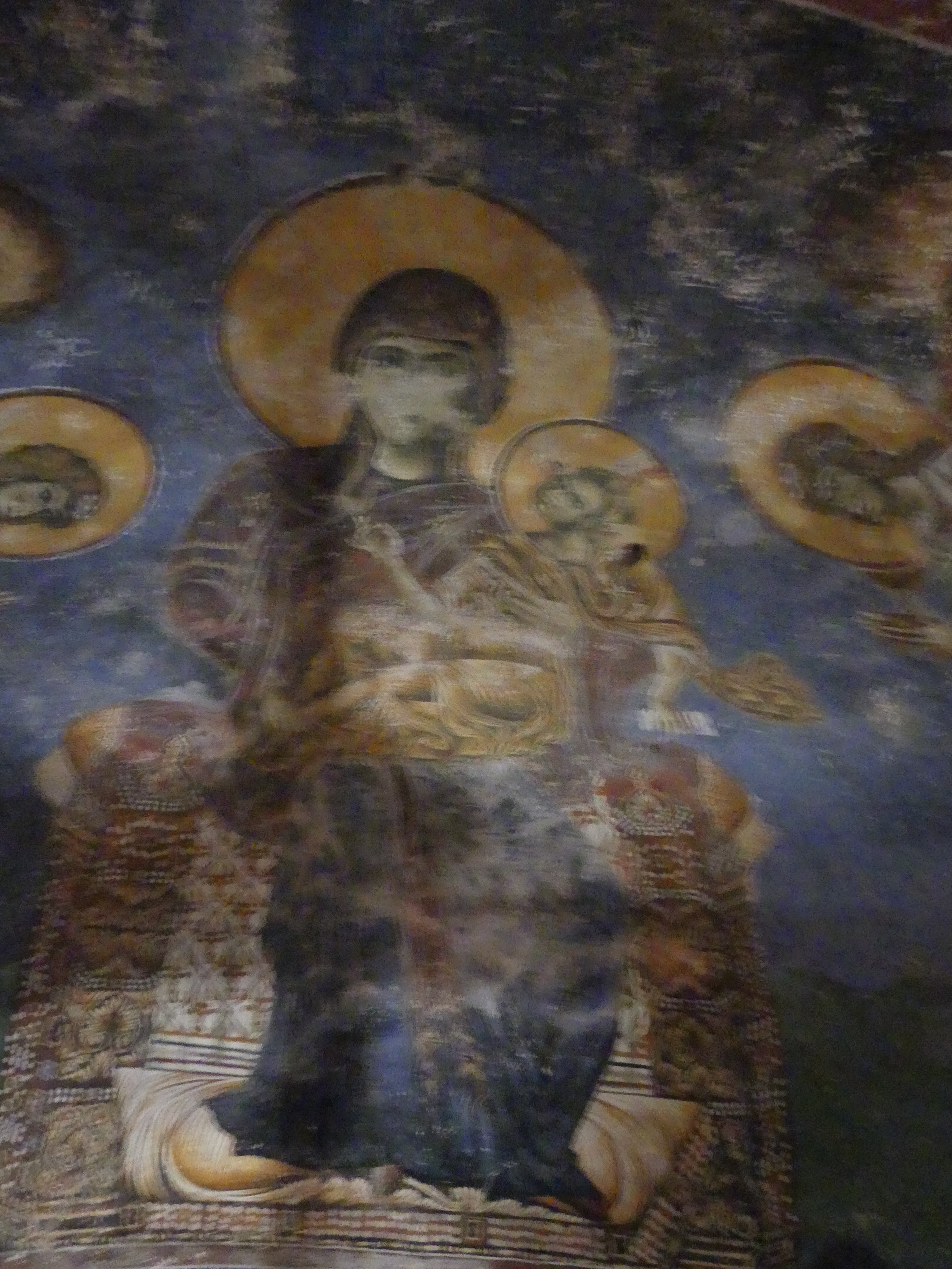 Na innym fresku przedstawiona jest Św. Anna, karmiąca dziecięcą Mayję. Poza tym udało mi się sfotografować kilka fragmentów scen narracyjnych z Nowego Testamentu, a także głowę Chrystusa – o pięknych i smutnych oczach, ze zrośniętymi ze sobą brwiami – oraz postać młodzieńczego świętego, o delikatnych rysach i eleganckiej fryzurze, odzianego w paradną, haftowaną szatę. W podobnie ceremonialnych strojach, z koronami na głowach, przedstawieni zostali cesarz Konstantyn Wielki i jego matka, Św. Helena.