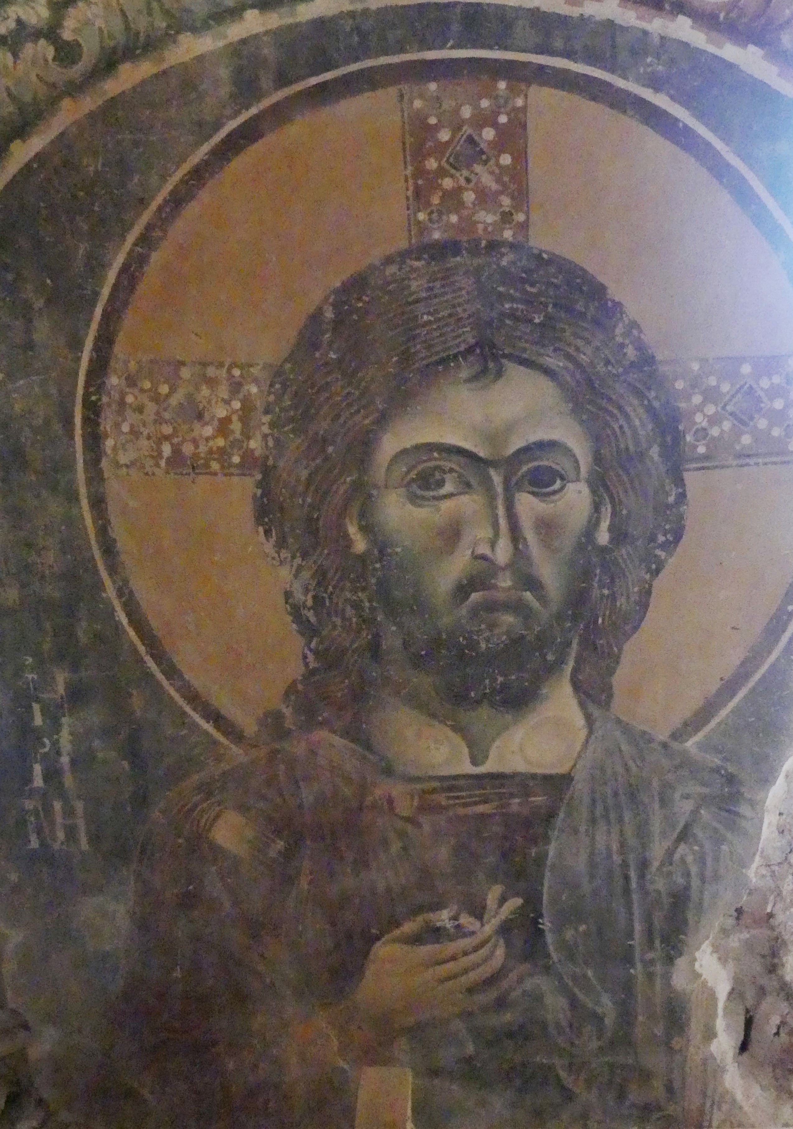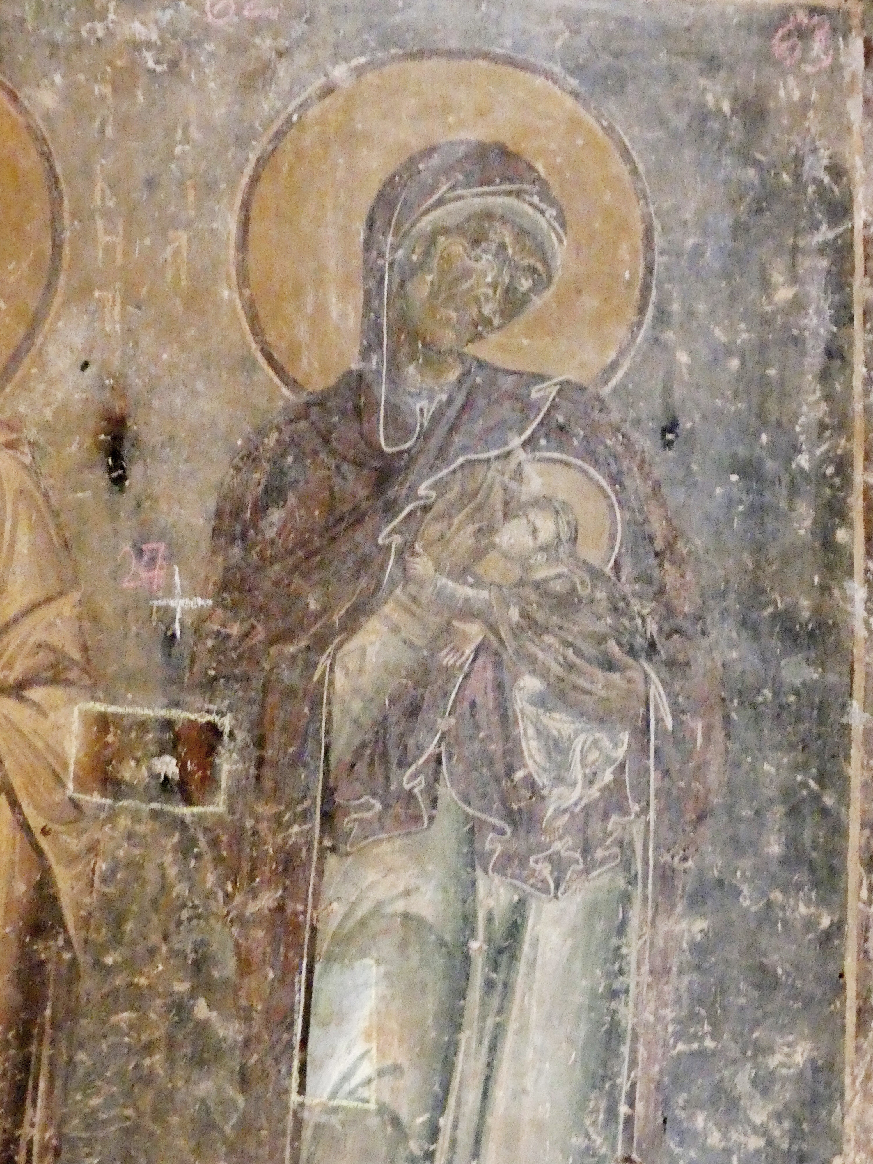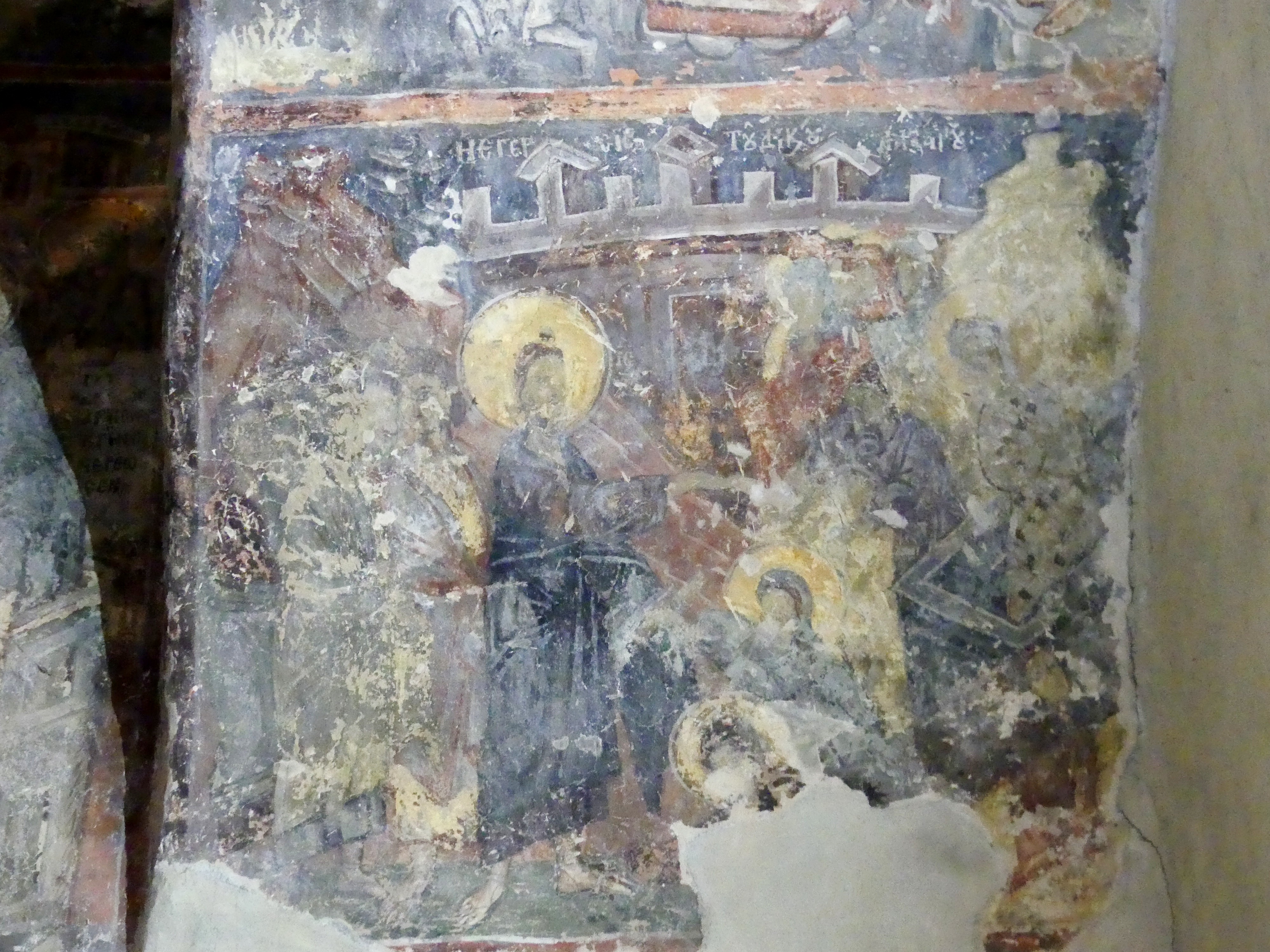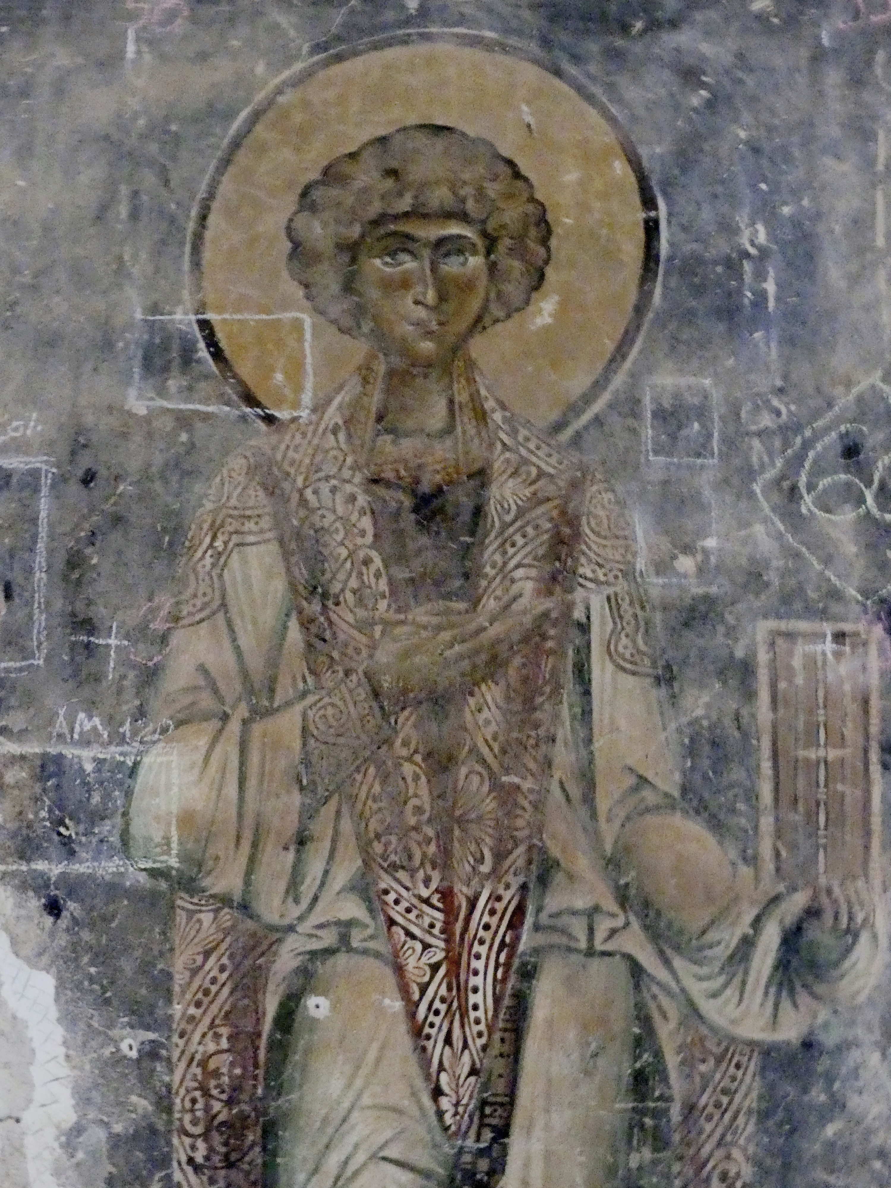 Na innym fresku przedstawiona jest Św. Anna, karmiąca dziecięcą Mayję. Poza tym udało mi się sfotografować kilka fragmentów scen narracyjnych z Nowego Testamentu, a także głowę Chrystusa – o pięknych i smutnych oczach, ze zrośniętymi ze sobą brwiami – oraz postać młodzieńczego świętego, o delikatnych rysach i eleganckiej fryzurze, odzianego w paradną, haftowaną szatę. W podobnie ceremonialnych strojach, z koronami na głowach, przedstawieni zostali cesarz Konstantyn Wielki i jego matka, Św. Helena.