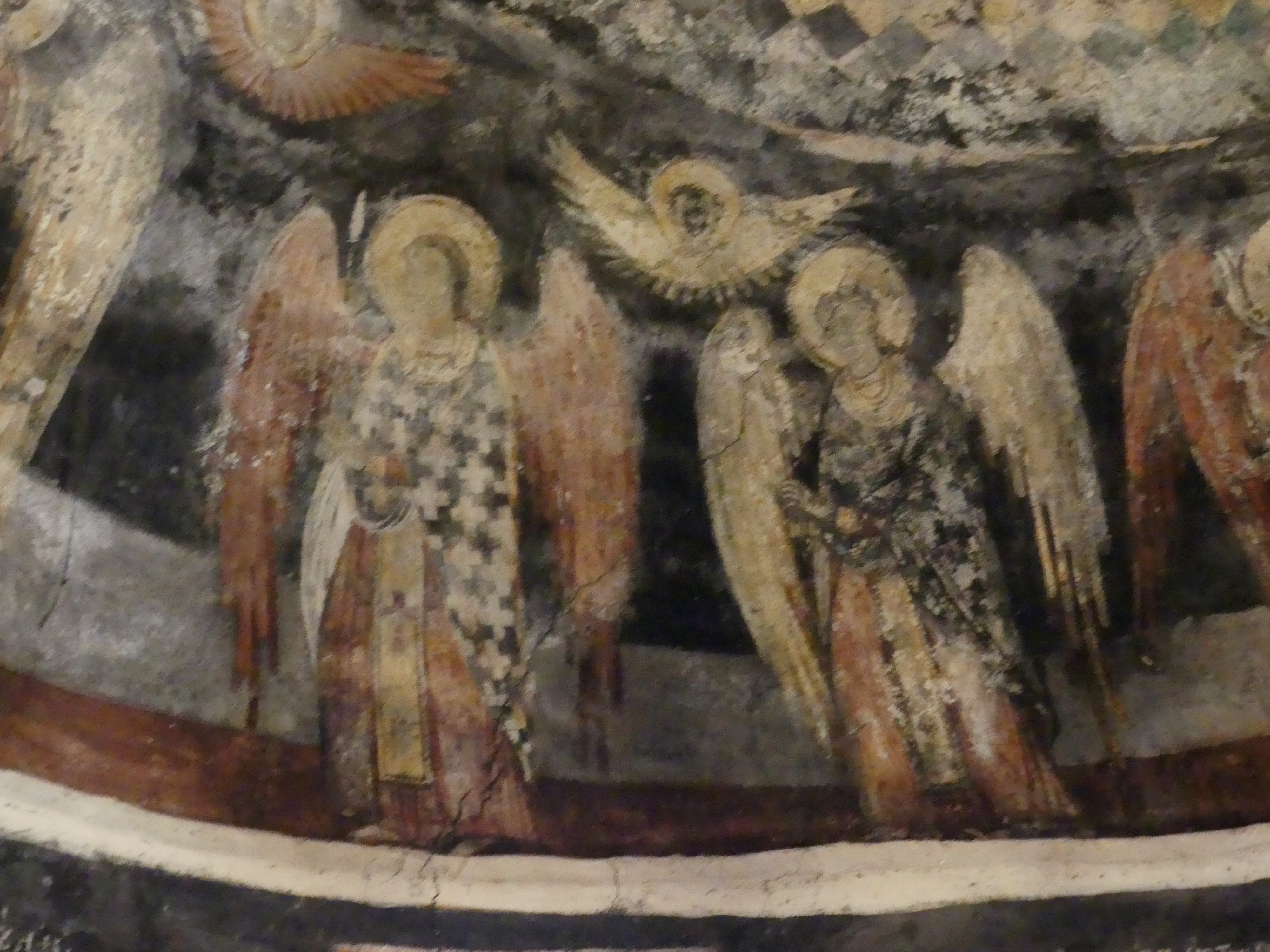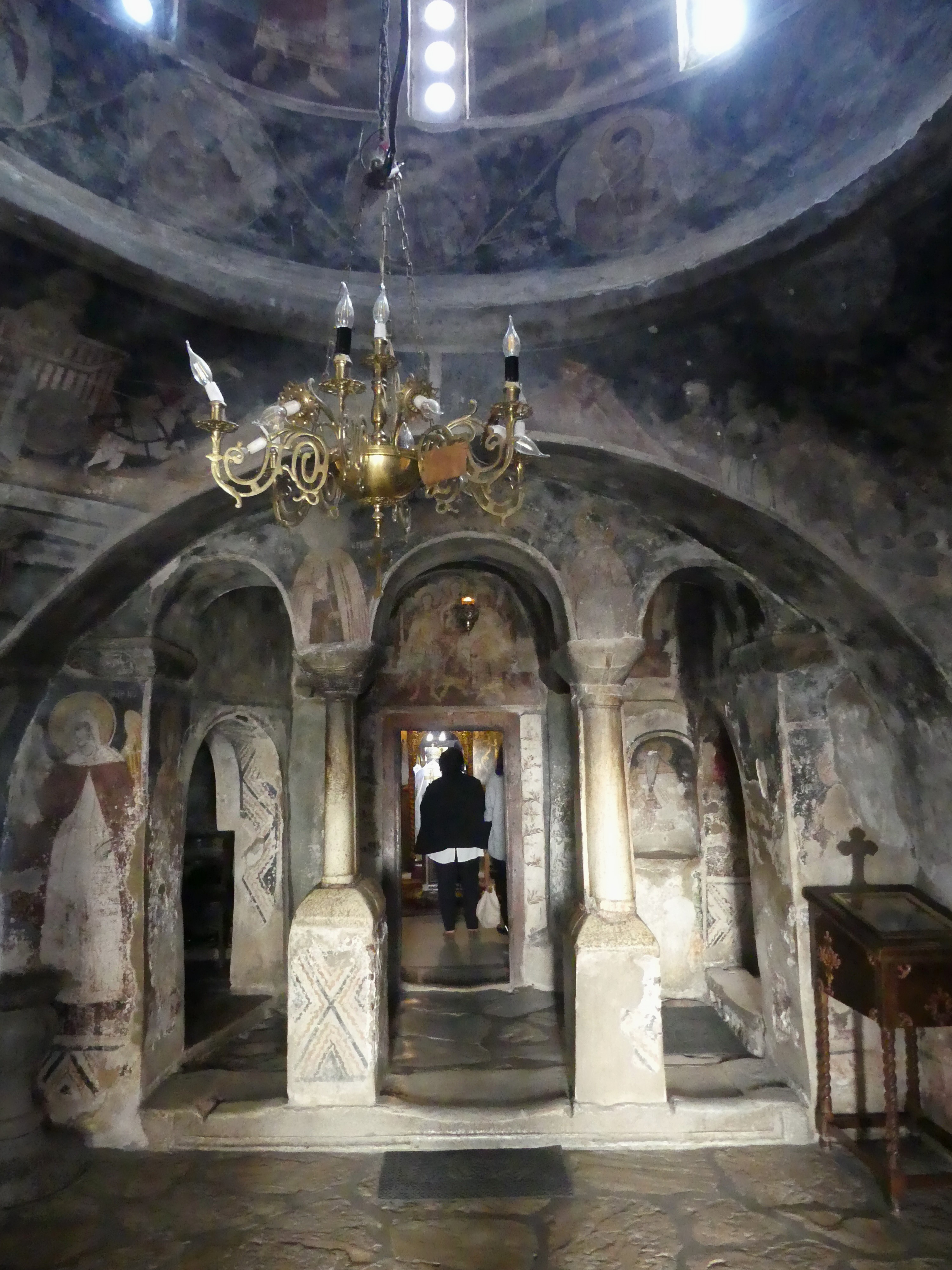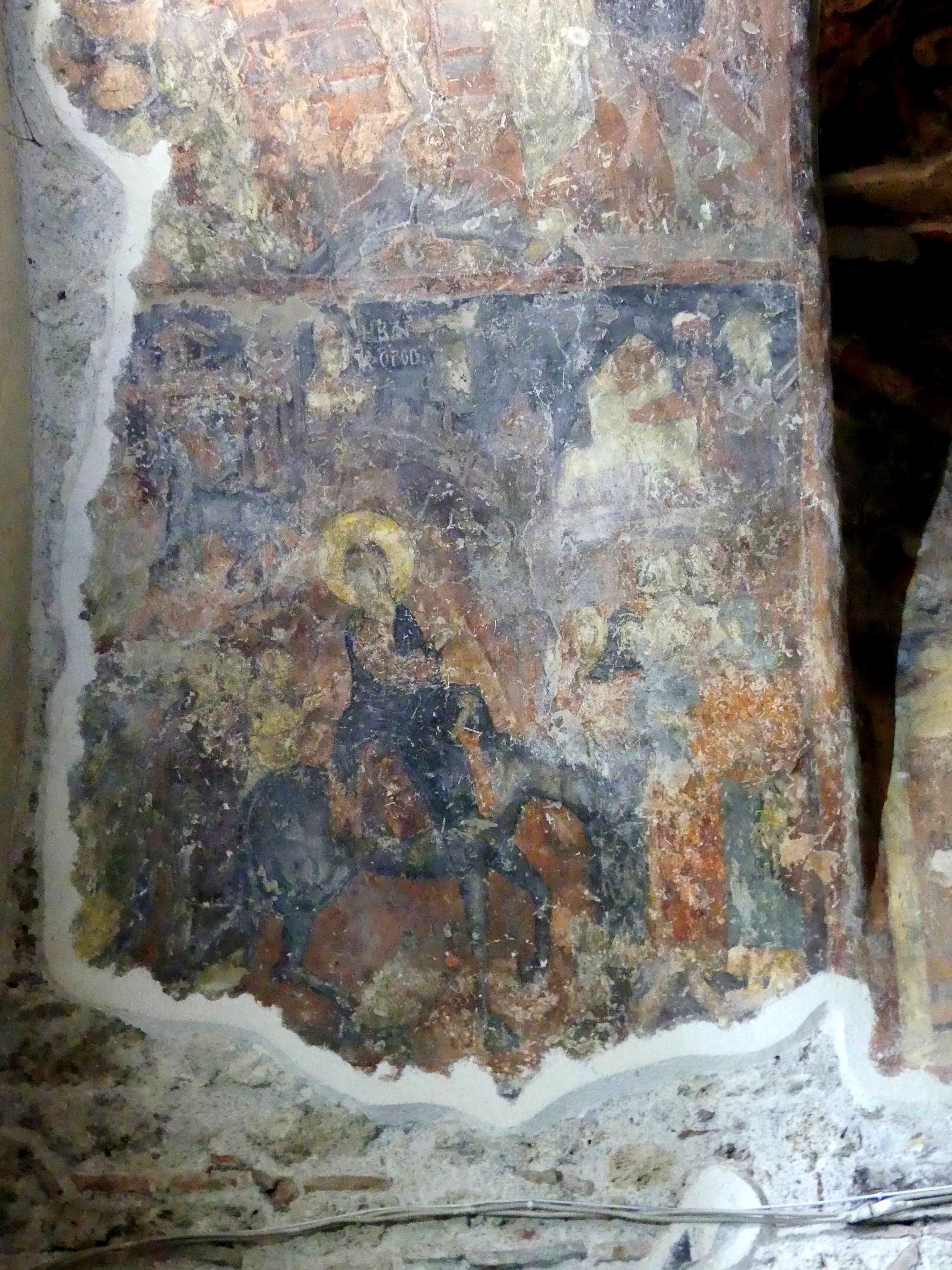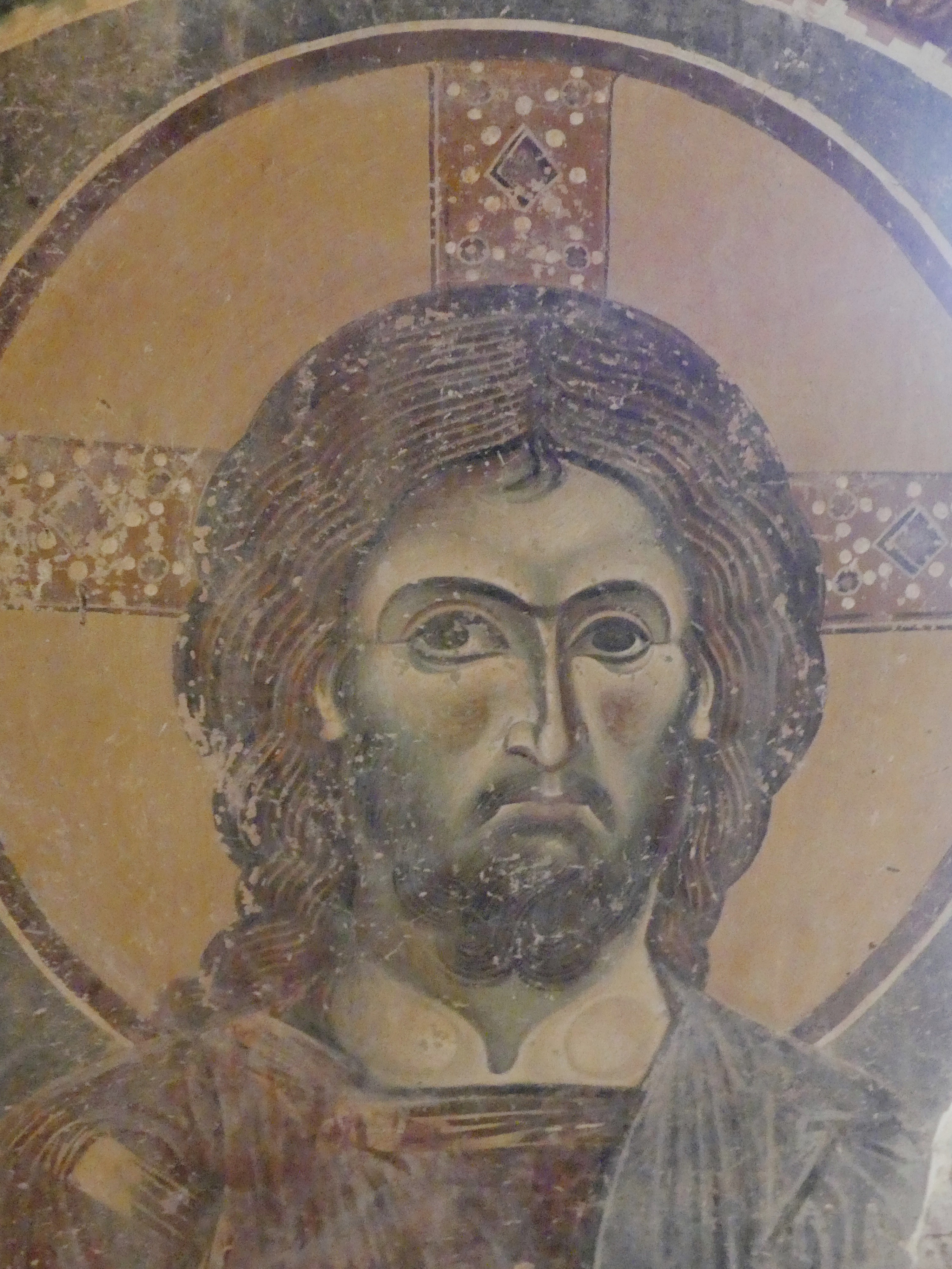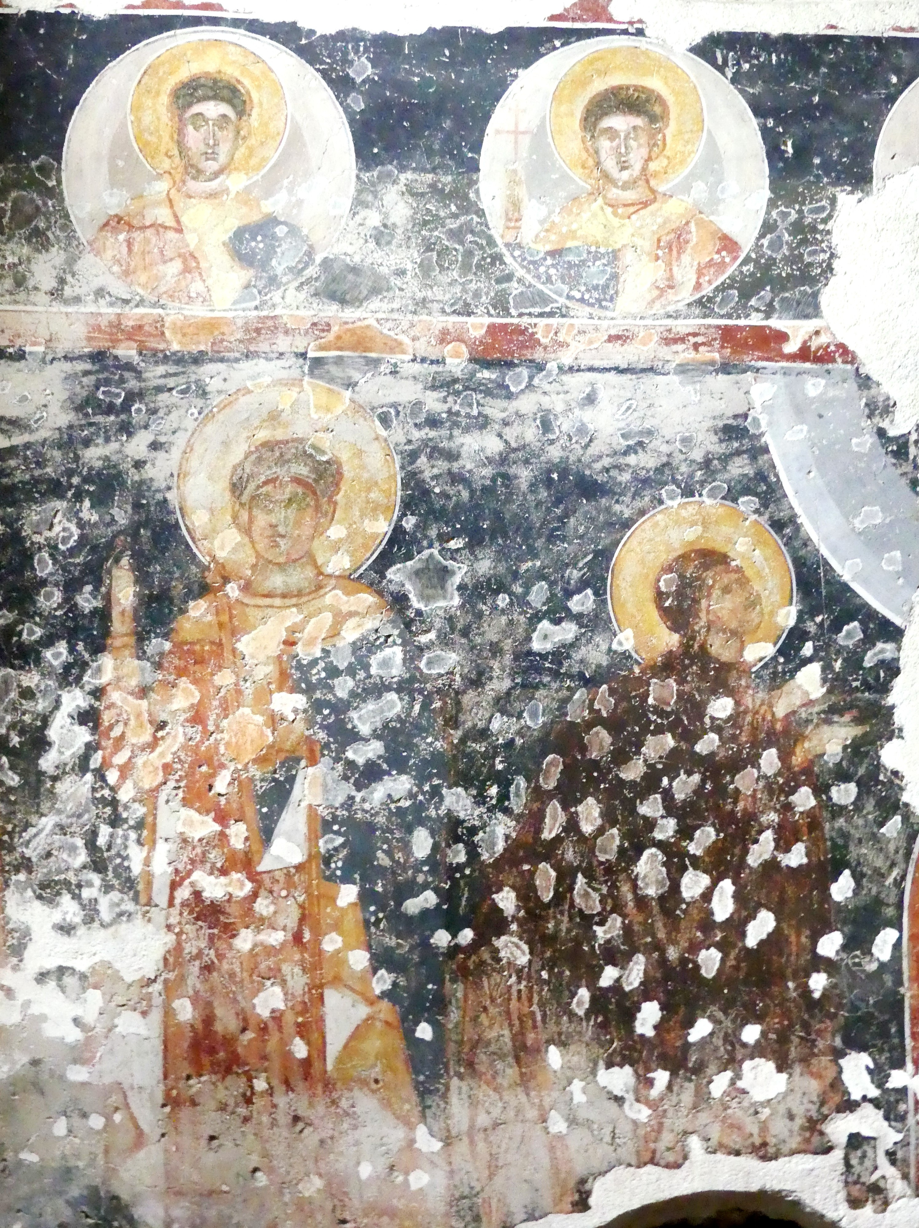 Na innym fresku przedstawiona jest Św. Anna, karmiąca dziecięcą Mayję. Poza tym udało mi się sfotografować kilka fragmentów scen narracyjnych z Nowego Testamentu, a także głowę Chrystusa – o pięknych i smutnych oczach, ze zrośniętymi ze sobą brwiami – oraz postać młodzieńczego świętego, o delikatnych rysach i eleganckiej fryzurze, odzianego w paradną, haftowaną szatę. W podobnie ceremonialnych strojach, z koronami na głowach, przedstawieni zostali cesarz Konstantyn Wielki i jego matka, Św. Helena.