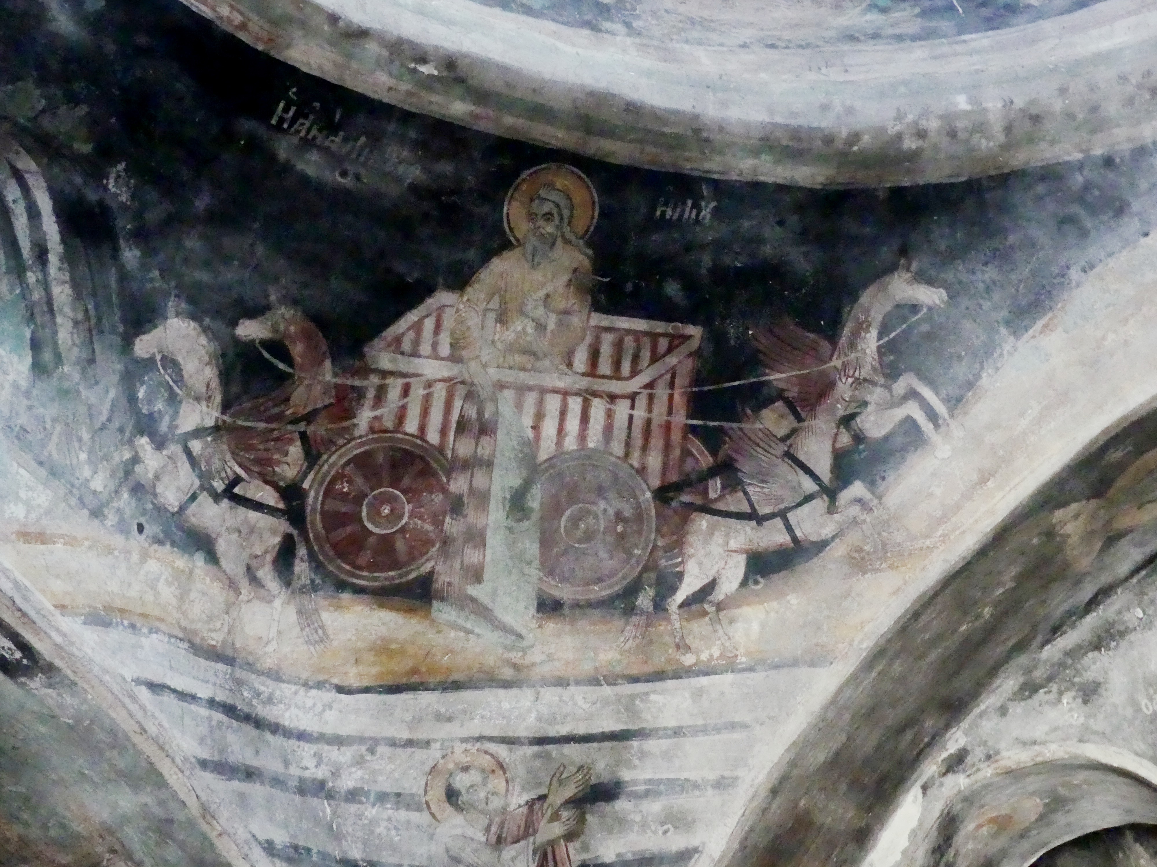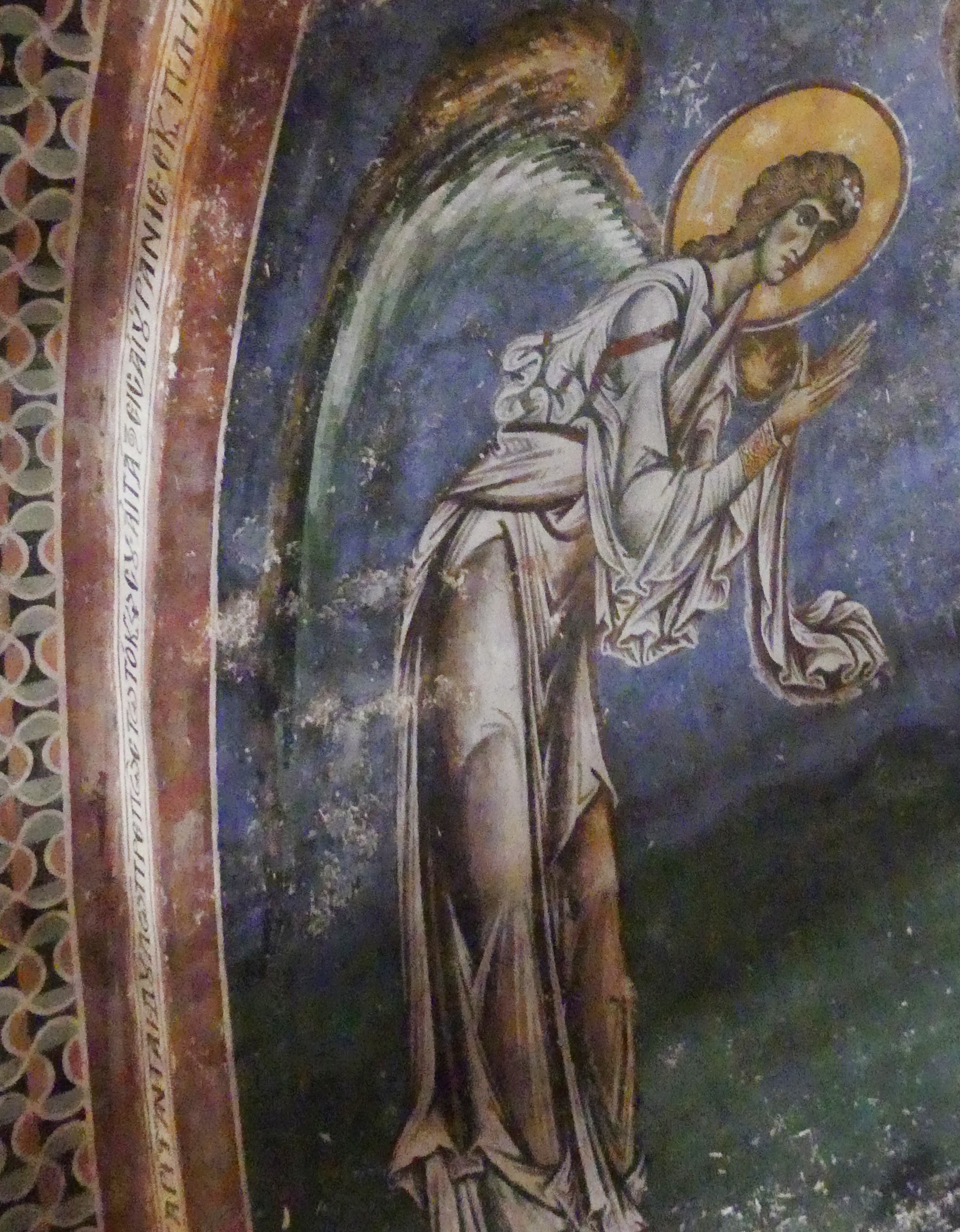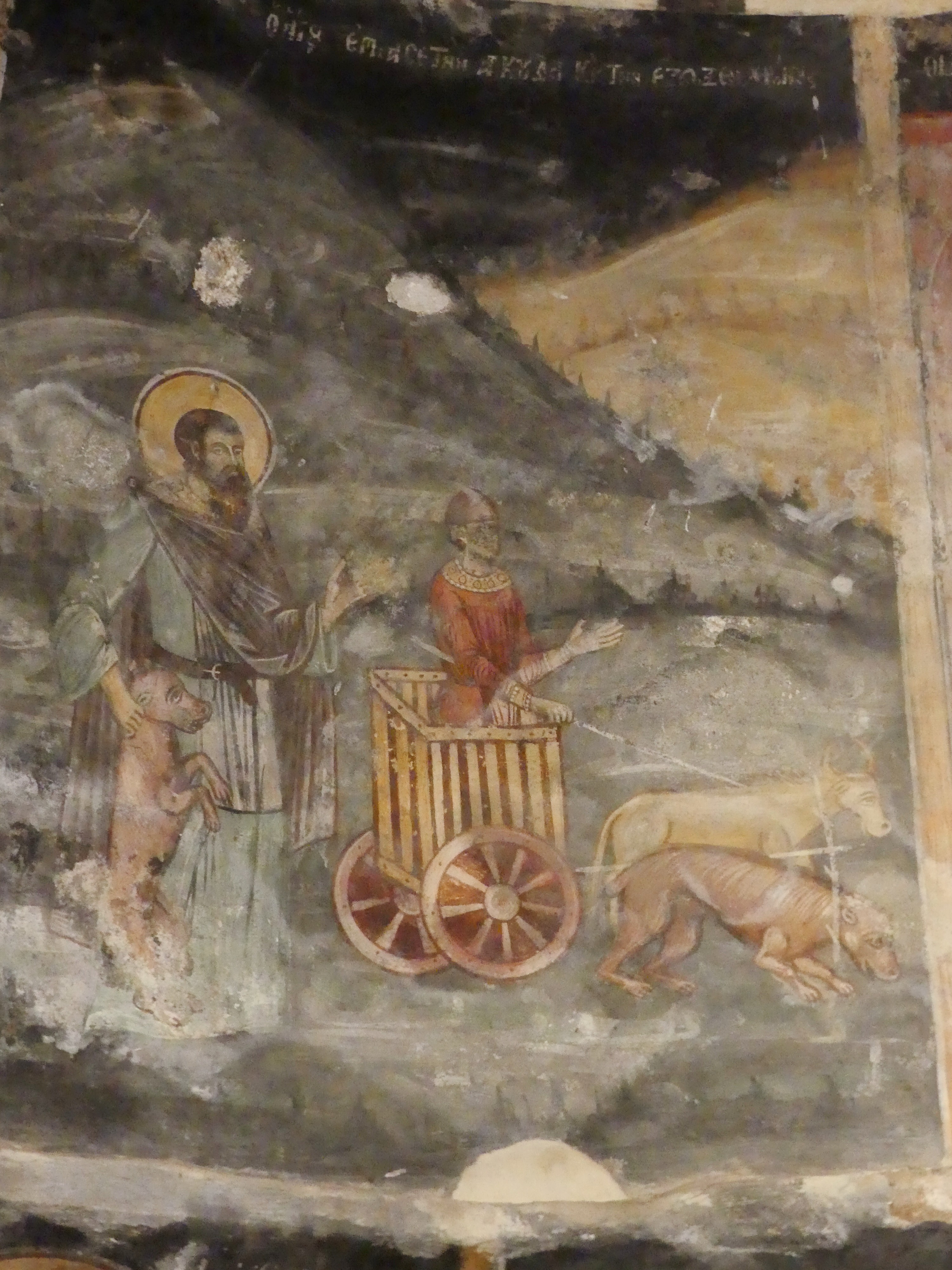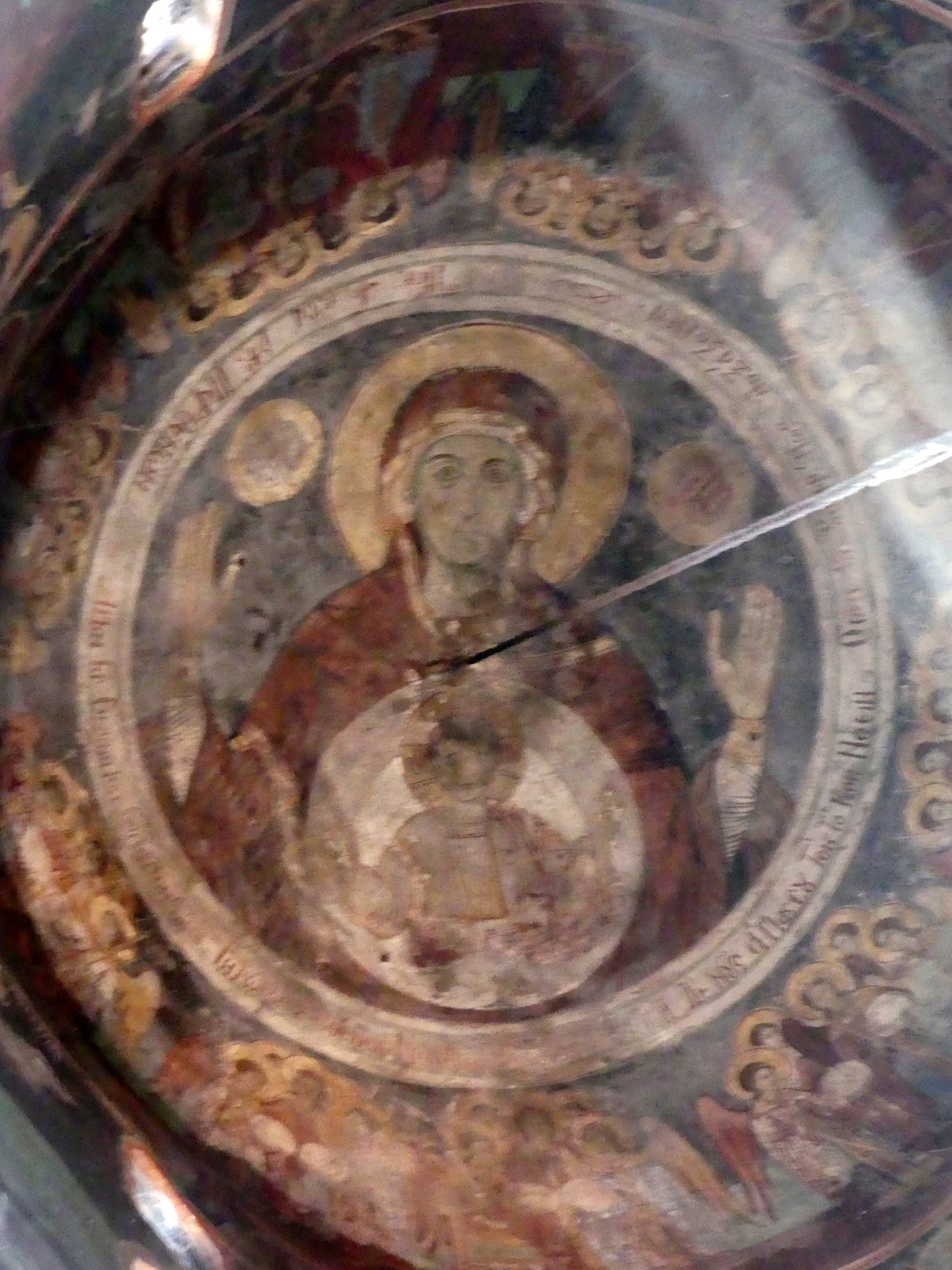 Na innym fresku przedstawiona jest Św. Anna, karmiąca dziecięcą Mayję. Poza tym udało mi się sfotografować kilka fragmentów scen narracyjnych z Nowego Testamentu, a także głowę Chrystusa – o pięknych i smutnych oczach, ze zrośniętymi ze sobą brwiami – oraz postać młodzieńczego świętego, o delikatnych rysach i eleganckiej fryzurze, odzianego w paradną, haftowaną szatę. W podobnie ceremonialnych strojach, z koronami na głowach, przedstawieni zostali cesarz Konstantyn Wielki i jego matka, Św. Helena.