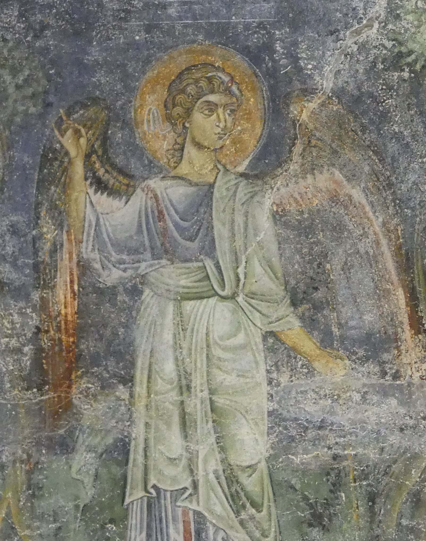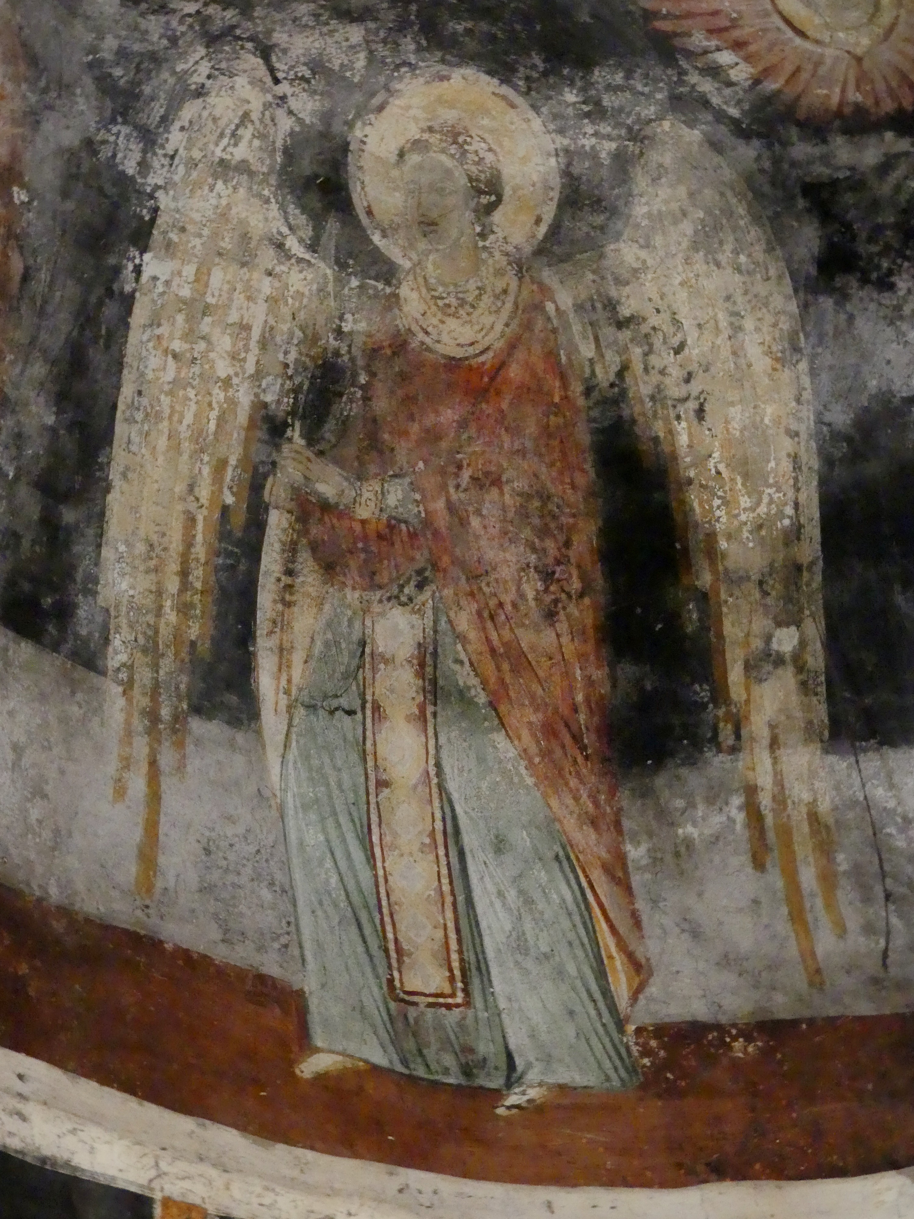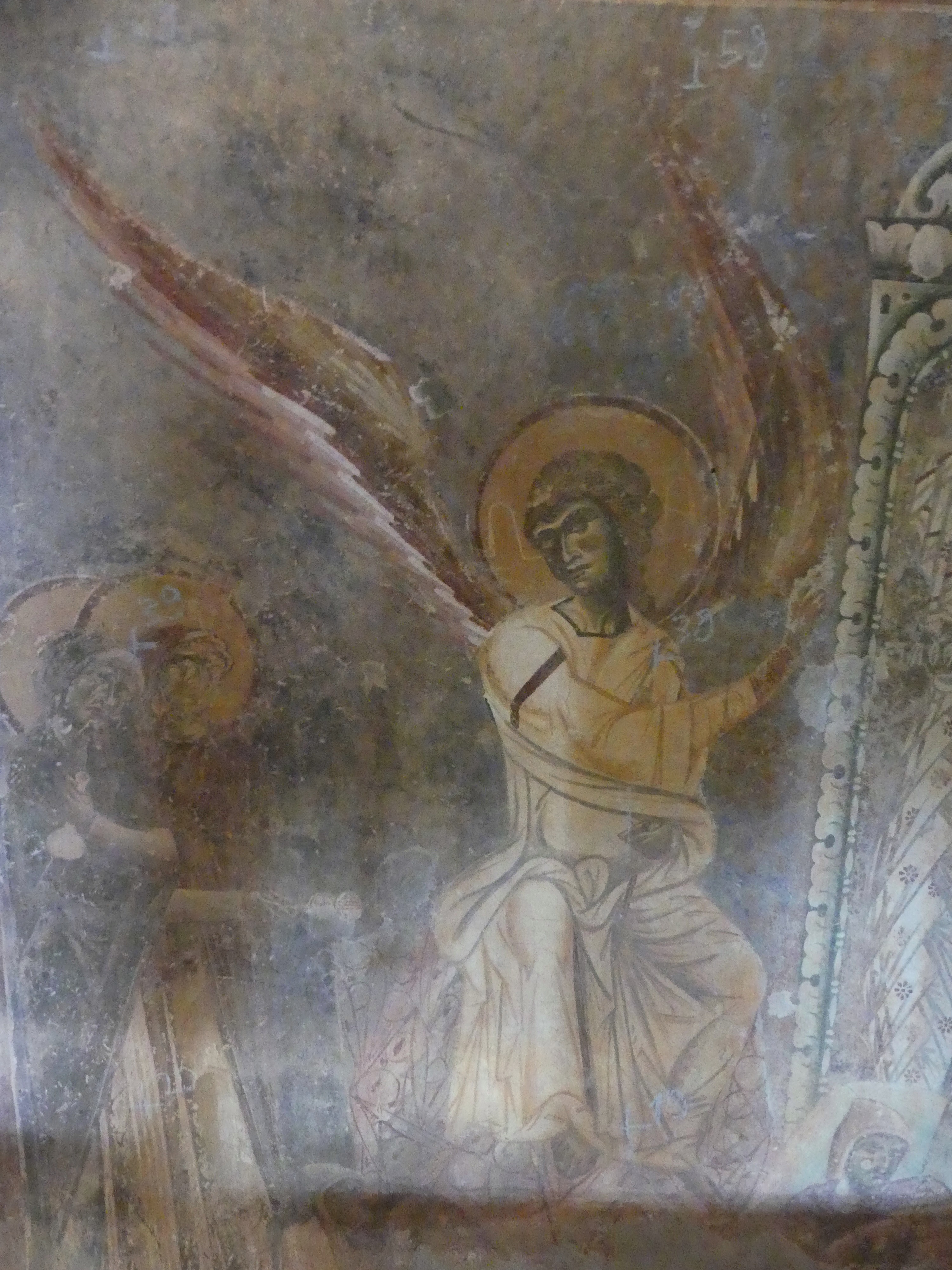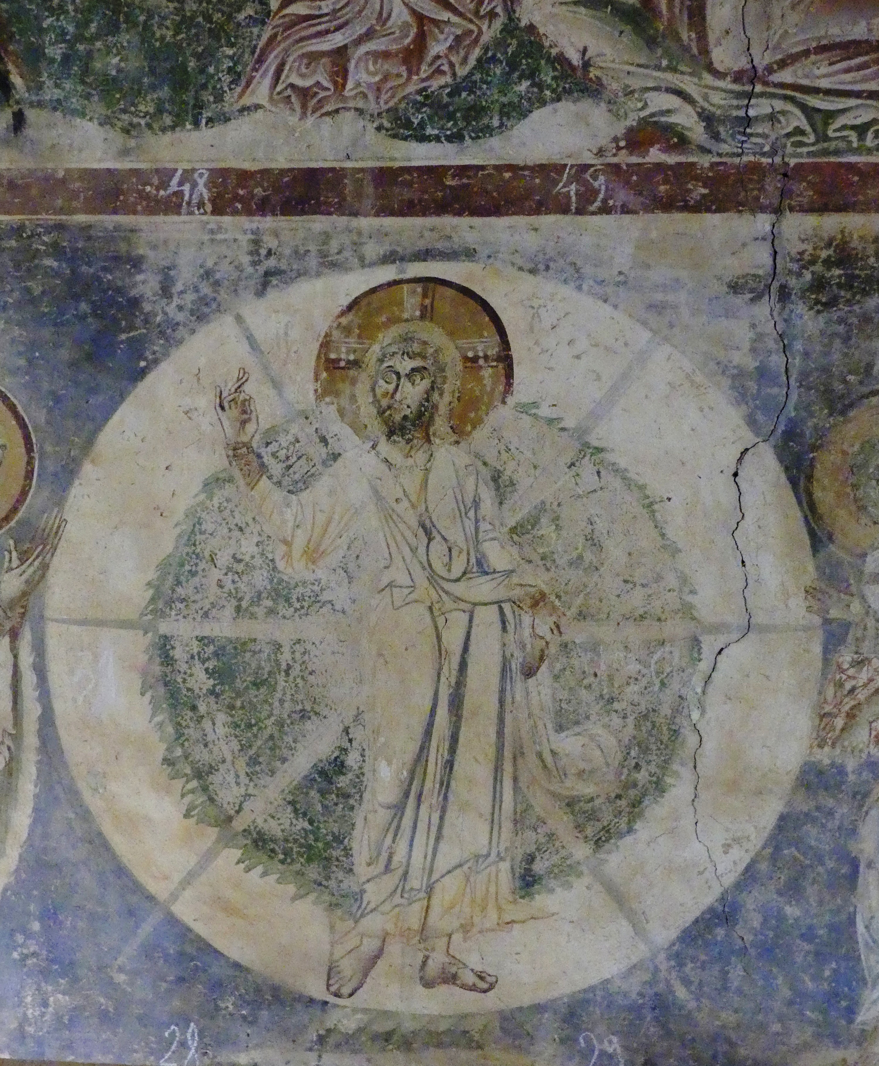 Na innym fresku przedstawiona jest Św. Anna, karmiąca dziecięcą Mayję. Poza tym udało mi się sfotografować kilka fragmentów scen narracyjnych z Nowego Testamentu, a także głowę Chrystusa – o pięknych i smutnych oczach, ze zrośniętymi ze sobą brwiami – oraz postać młodzieńczego świętego, o delikatnych rysach i eleganckiej fryzurze, odzianego w paradną, haftowaną szatę. W podobnie ceremonialnych strojach, z koronami na głowach, przedstawieni zostali cesarz Konstantyn Wielki i jego matka, Św. Helena.