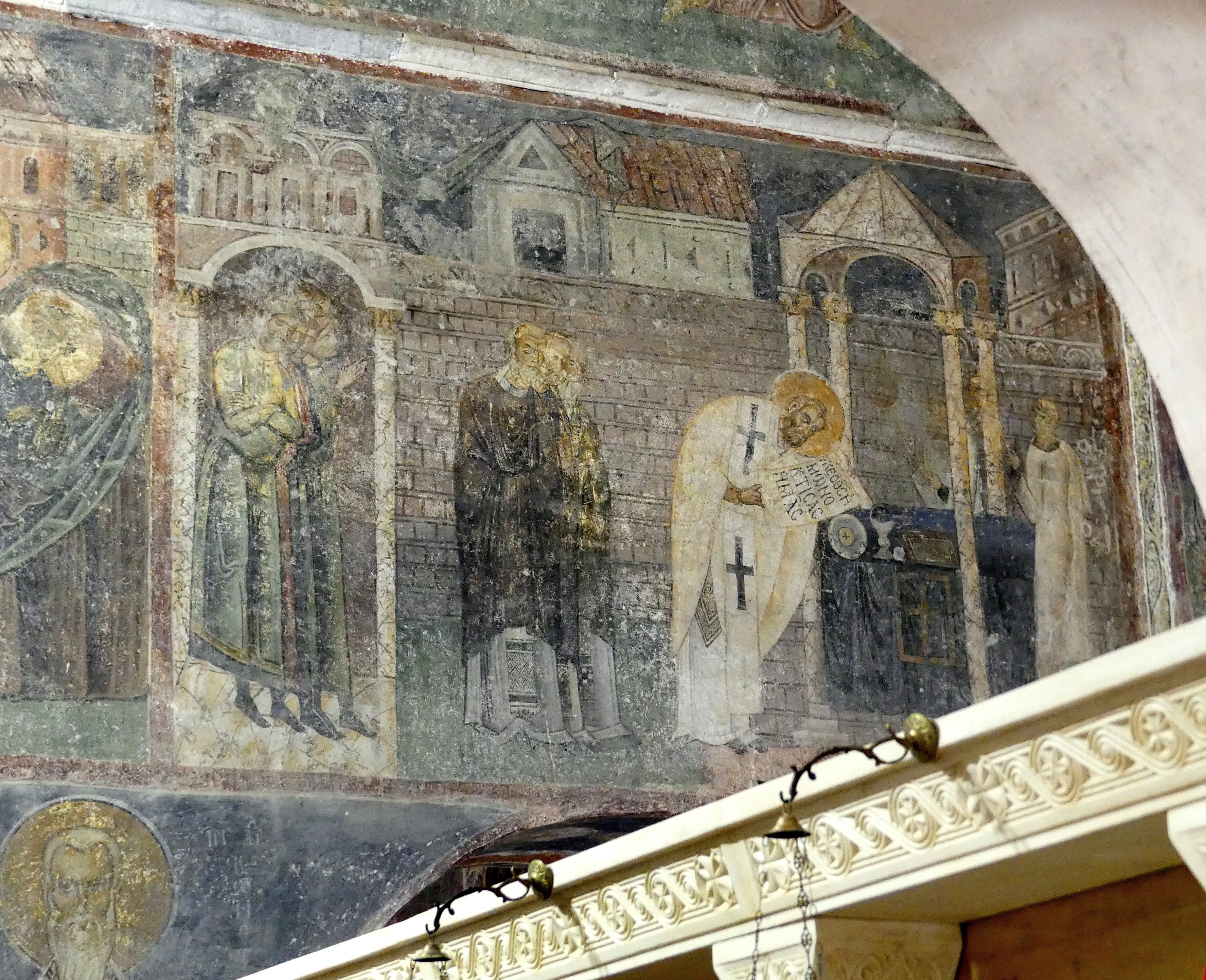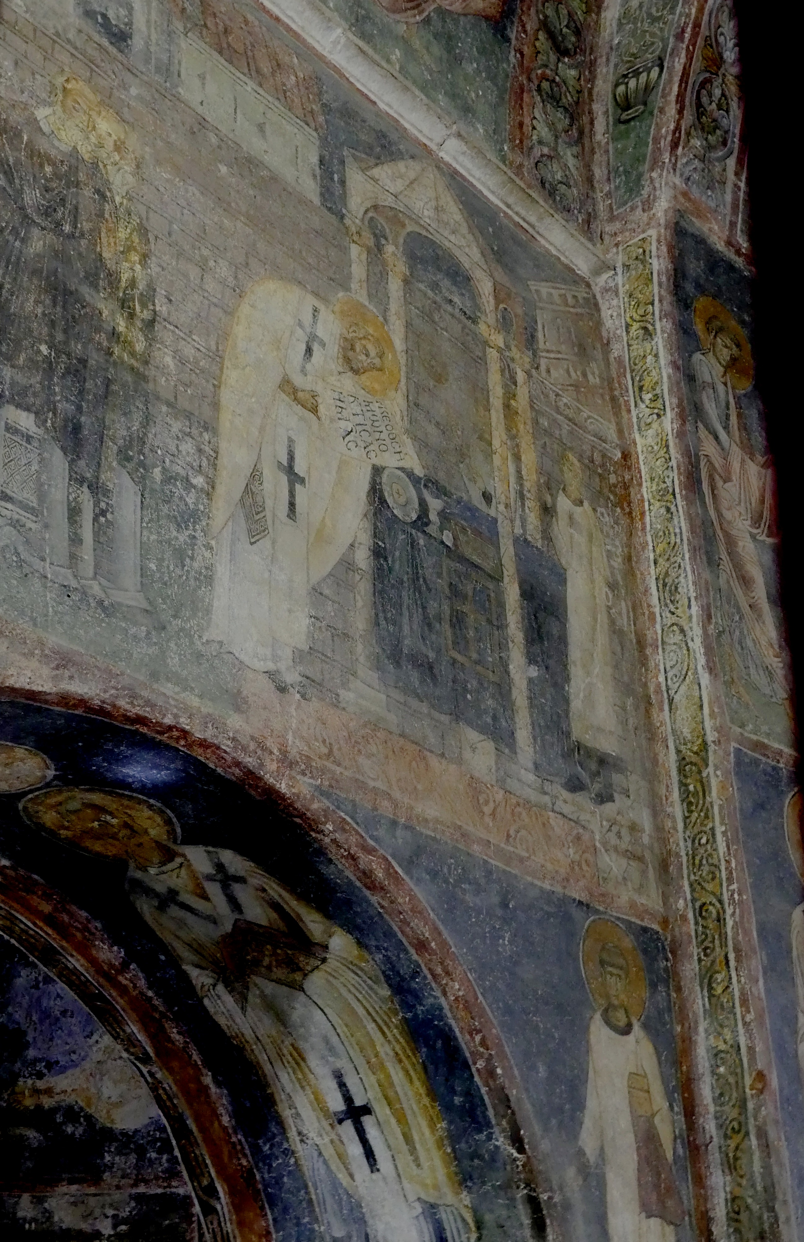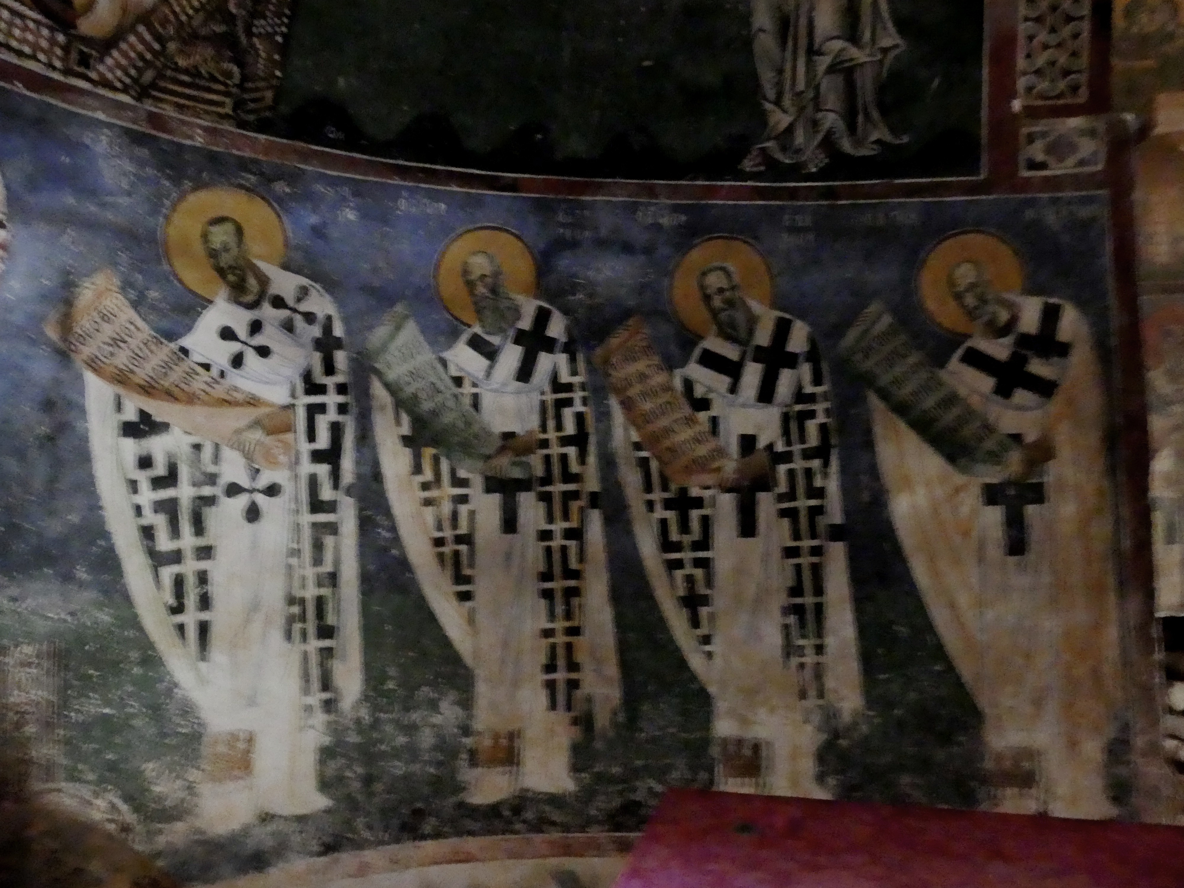 Niestety ikonostas nie pozwala na dokładniejsze obejrzenie niższych registrów fresków ze scenami narracyjnymi, biegnących wzdłuż ścian prezbiterium. Musiałem dokonywać sztuk ekwilibrystycznych, żeby zrobić zdjęcia „Liturgii Św. Bazylego Wielkiego”, która wywarła na  mnie szczególnie silne wrażenie, tak ze względu na kolorystykę jak i pełen elegancji, manierystyczny rysunek.