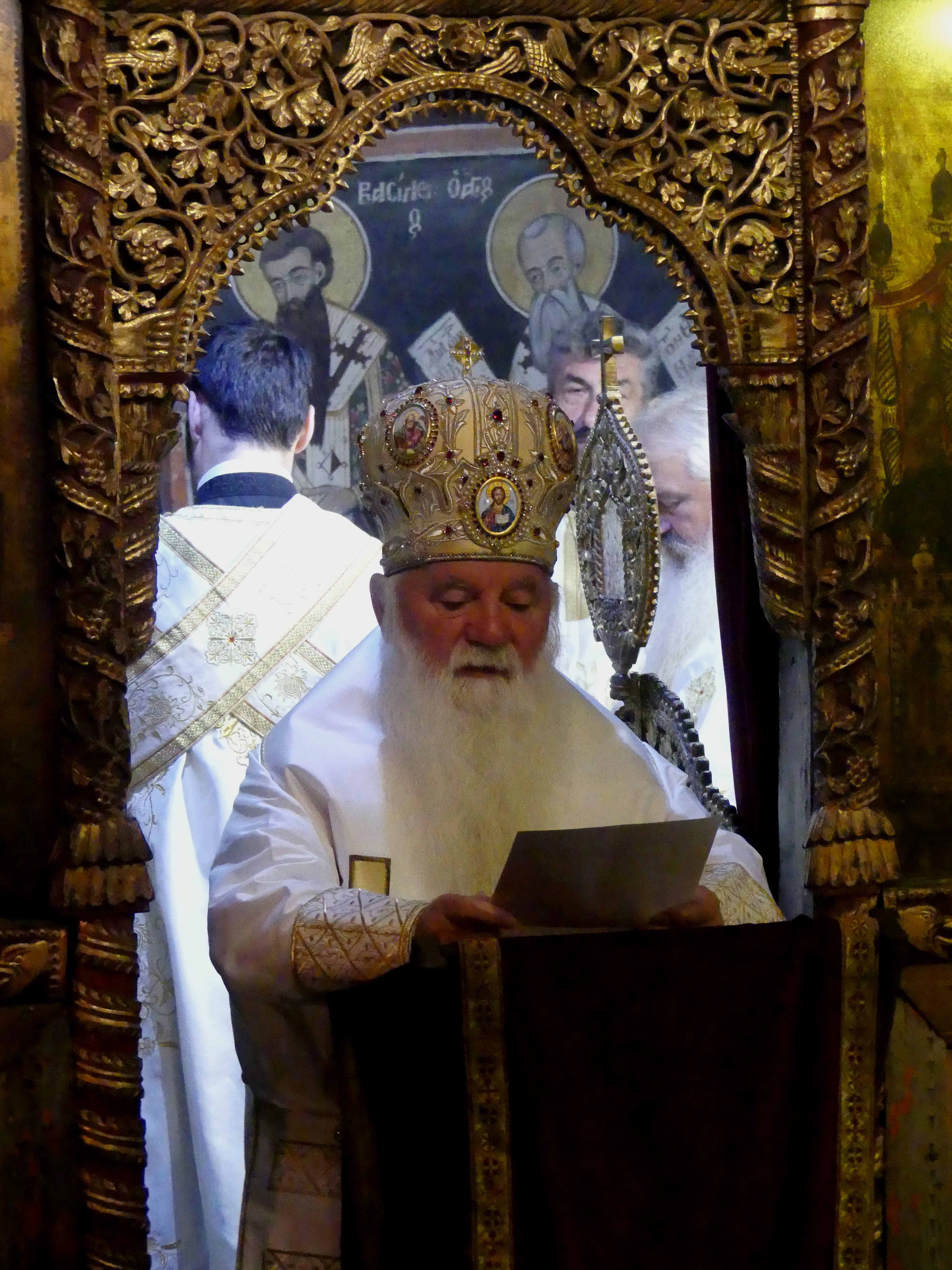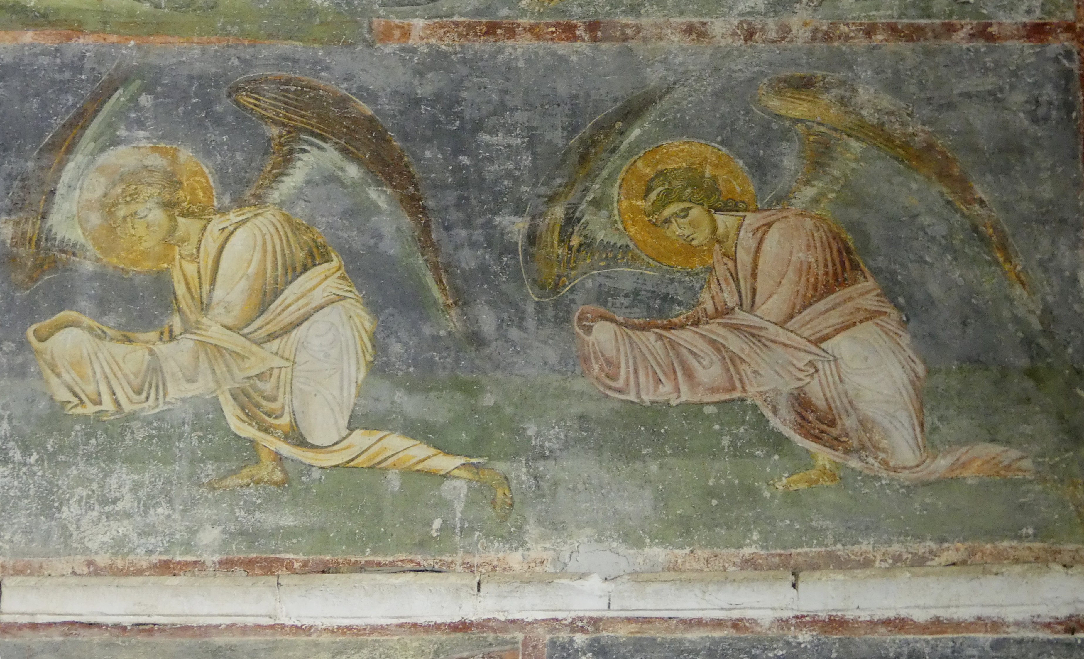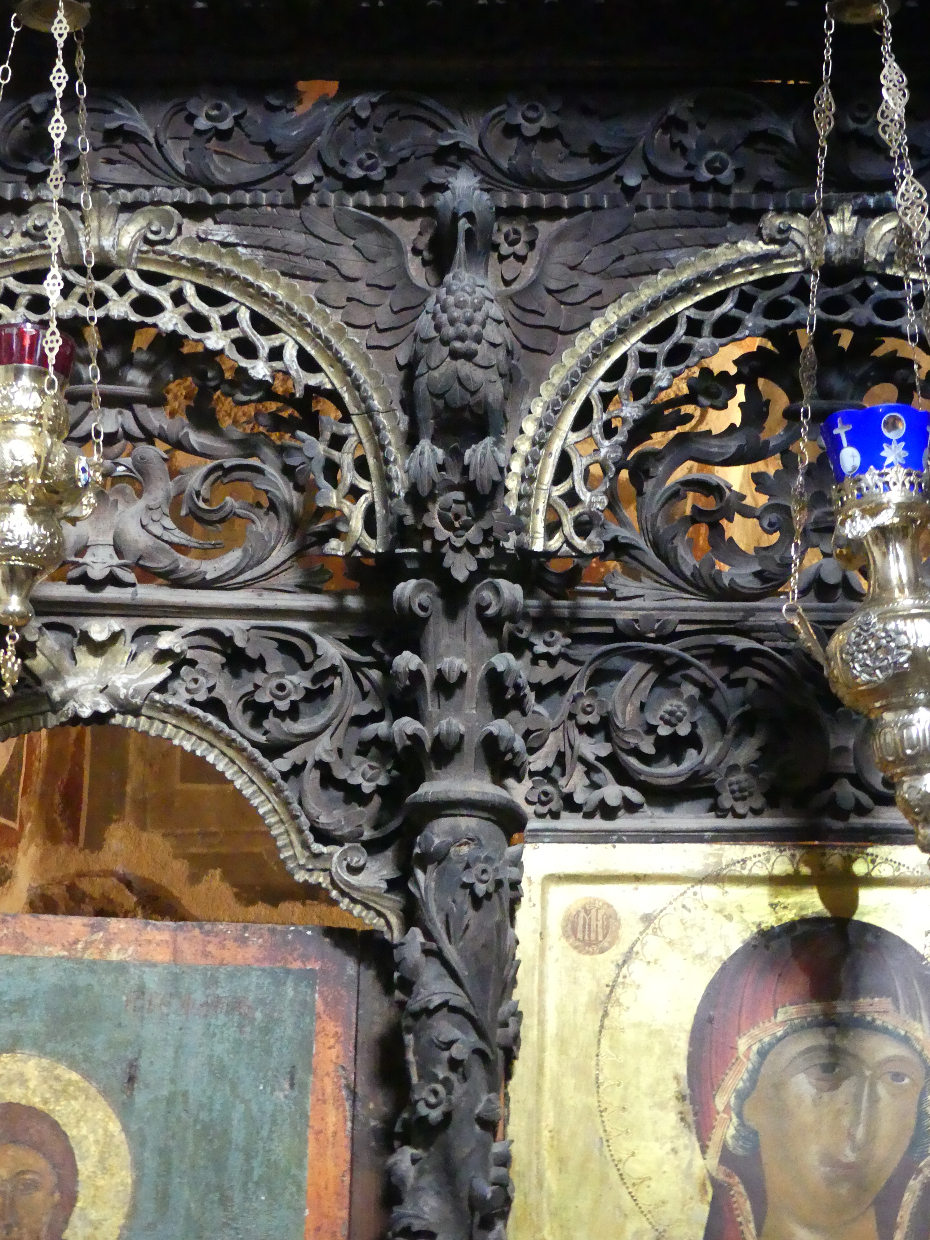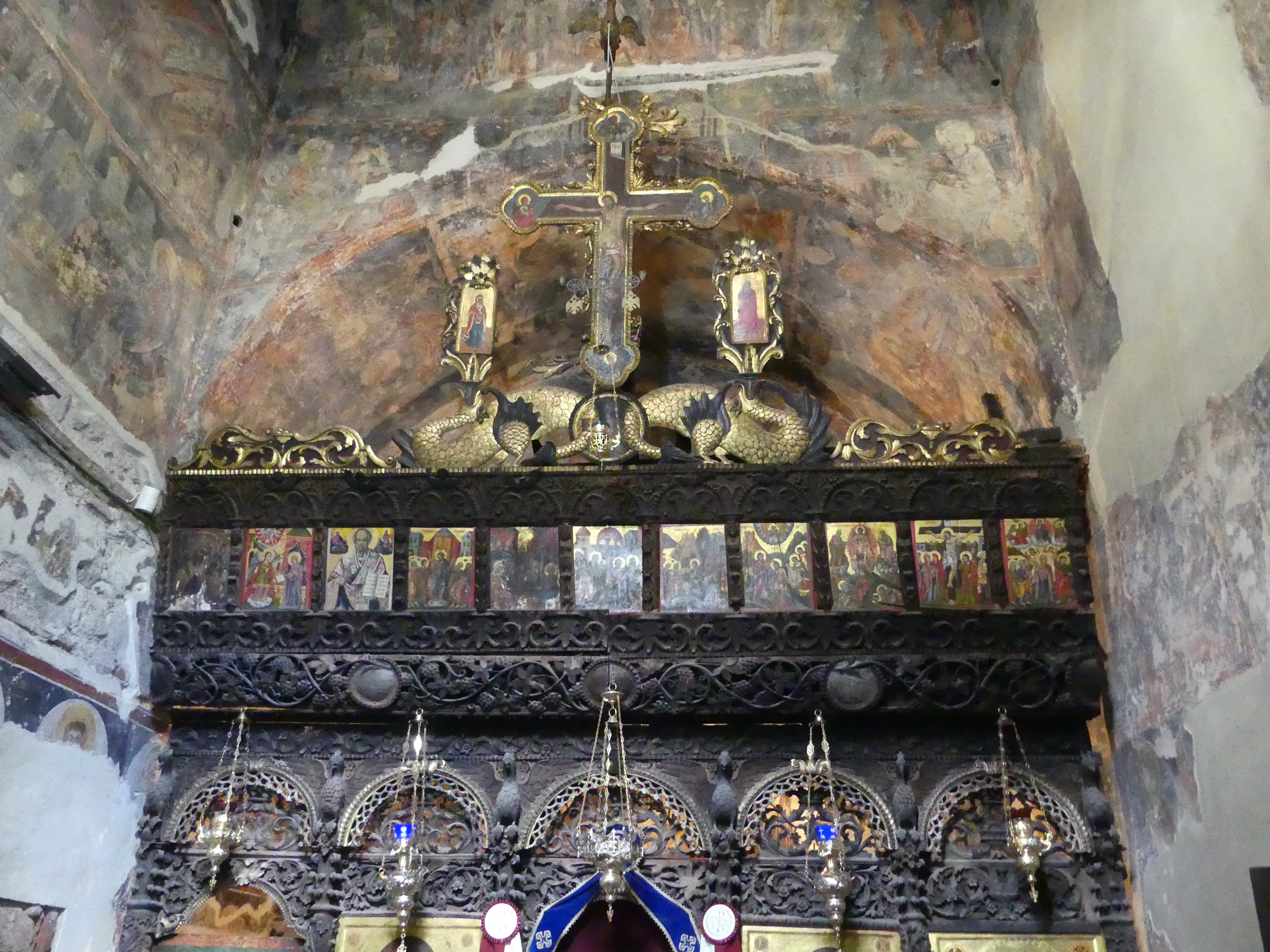 Niestety ikonostas nie pozwala na dokładniejsze obejrzenie niższych registrów fresków ze scenami narracyjnymi, biegnących wzdłuż ścian prezbiterium. Musiałem dokonywać sztuk ekwilibrystycznych, żeby zrobić zdjęcia „Liturgii Św. Bazylego Wielkiego”, która wywarła na  mnie szczególnie silne wrażenie, tak ze względu na kolorystykę jak i pełen elegancji, manierystyczny rysunek.