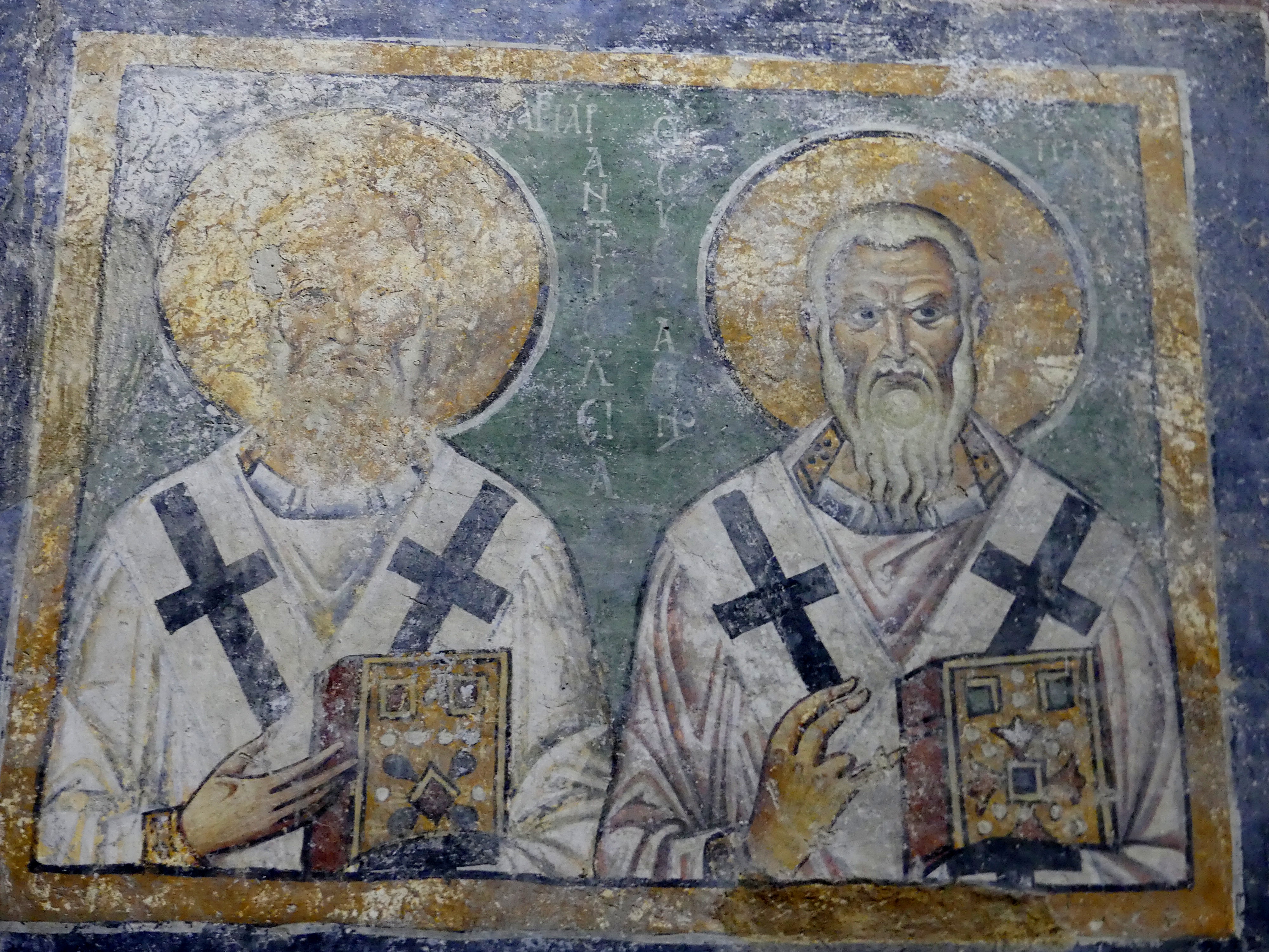 W połowie dwudziestego wieku, podczas prac konserwatorskich, odkryto w absydzie cerkiewki inskrypcję datującą początek prac nad freskami na 25 kwietnia 1191 r., co potwierdziło ich wcześniejsze zakwalifikowanie, na podstawie stylu, do epoki Komnenów, a mocno zniszczony obraz jednego z fundatorów, w ceremonialnym stroju, może przedstawiać panującego w tym czasie cesarza, Izaaka II Angelosa.